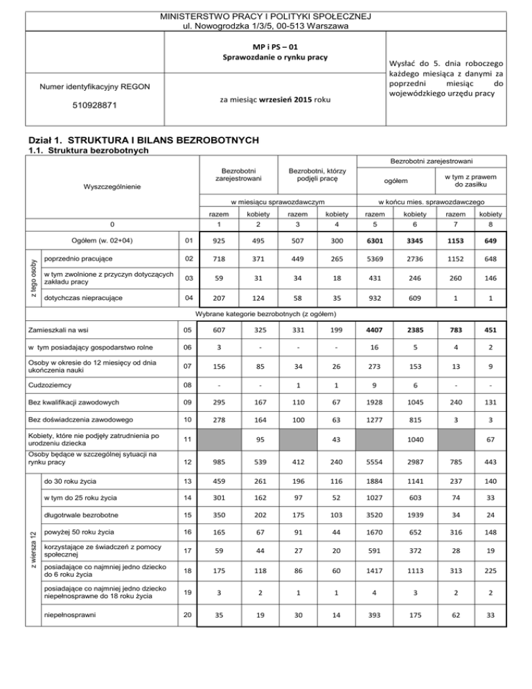 MINISTERSTWO PRACY I POLITYKI SPOŁECZNEJ ul. Nowogrodzka 1/3/5, 00-513 Warszawa MP i PS – 01 Sprawozdanie o rynku pracy Wysłać do 5. dnia roboczego każdego miesiąca z danymi za poprzedni miesiąc do wojewódzkiego urzędu pracy Numer identyfikacyjny REGON za miesiąc wrzesień 2015 roku 510928871 Dział 1. STRUKTURA I BILANS BEZROBOTNYCH 1.1. Struktura bezrobotnych Bezrobotni zarejestrowani Bezrobotni zarejestrowani Bezrobotni, którzy podjęli pracę w miesiącu sprawozdawczym w końcu mies. sprawozdawczego razem kobiety razem kobiety razem kobiety razem kobiety 1 2 3 4 5 6 7 8 01 925 495 507 300 6301 3345 1153 649 poprzednio pracujące 02 718 371 449 265 5369 2736 1152 648 w tym zwolnione z przyczyn dotyczących zakładu pracy 03 59 31 34 18 431 246 260 146 dotychczas niepracujące 04 207 124 58 35 932 609 1 1 0 Ogółem (w. 02+04) z tego osoby w tym z prawem do zasiłku ogółem Wyszczególnienie Wybrane kategorie bezrobotnych (z ogółem) Zamieszkali na wsi 05 607 325 331 199 4407 2385 783 451 w tym posiadający gospodarstwo rolne 06 3 - - - 16 5 4 2 Osoby w okresie do 12 miesięcy od dnia ukończenia nauki 07 156 85 34 26 273 153 13 9 Cudzoziemcy 08 - - 1 1 9 6 - - Bez kwalifikacji zawodowych 09 295 167 110 67 1928 1045 240 131 Bez doświadczenia zawodowego 10 278 164 100 63 1277 815 3 3 Kobiety, które nie podjęły zatrudnienia po urodzeniu dziecka 11 z wiersza 12 Osoby będące w szczególnej sytuacji na rynku pracy 95 43 1040 67 12 985 539 412 240 5554 2987 785 443 do 30 roku życia 13 459 261 196 116 1884 1141 237 140 w tym do 25 roku życia 14 301 162 97 52 1027 603 74 33 długotrwale bezrobotne 15 350 202 175 103 3520 1939 34 24 powyżej 50 roku życia 16 165 67 91 44 1670 652 316 148 korzystające ze świadczeń z pomocy społecznej 17 59 44 27 20 591 372 28 19 posiadające co najmniej jedno dziecko do 6 roku życia 18 175 118 86 60 1417 1113 313 225 posiadające co najmniej jedno dziecko niepełnosprawne do 18 roku życia 19 3 2 1 1 4 3 2 2 niepełnosprawni 20 35 19 30 14 393 175 62 33 1.2. Bilans bezrobotnych Wyszczególnienie Ogółem 0 Kobiety Z ogółem zamieszkali na wsi Z ogółem z prawem do zasiłku razem kobiety razem kobiety 1 2 3 4 5 6 21 6311 3353 4427 2394 1246 709 Bezrobotni zarejestrowani w miesiącu sprawozdawczym (w. 23+24) 22 925 495 607 325 172 93 po raz pierwszy 23 230 114 163 85 22 11 po raz kolejny 24 695 381 444 240 150 82 po pracach interwencyjnych 25 po robotach publicznych 26 3 22 1 5 3 15 1 3 10 3 po stażu 27 111 82 77 59 9 9 po odbyciu przygotowania zawodowego dorosłych 28 - - - - - - po szkoleniu 29 9 - 4 - 1 - po pracach społecznie użytecznych 30 18 13 11 7 31 935 503 627 334 32 507 300 331 199 33 268 4 288 2 180 1 z wiersza 22 z tego Bezrobotni według stanu w końcu miesiąca poprzedzającego sprawozdanie Osoby wyłączone z ewidencji bezrobotnych w miesiącu sprawozdawczym (w.32+49+51+53+54+56 do 65) podjęcia pracy w miesiącu sprawozdawczym (w. 33+36) podjęcie działalności gospodarczej 34 436 8 pracy sezonowej 35 - - - - 36 71 32 43 19 prac interwencyjnych 37 robót publicznych 38 25 28 14 11 14 18 8 6 podjęcia działalności gospodarczej 39 7 3 6 2 w tym w ramach bonu na zasiedlenie 40 - - - - 41 6 3 3 2 42 3 1 1 1 podjęcia pracy w ramach bonu zatrudnieniowego 43 - - - - podjęcia pracy w ramach świadczenia aktywizacyjnego 44 - - - - podjęcia pracy w ramach grantu na telepracę 45 - - - - 46 - - - - 47 - - - - 48 2 - 1 - rozpoczęcia szkolenia 49 27 2 20 2 w tym w ramach bonu szkoleniowego 50 1 - 1 - rozpoczęcia stażu 51 65 49 41 31 w tym w ramach bonu stażowego 52 - - - - rozpoczęcia przygotowania zawodowego dorosłych 53 - - - - rozpoczęcia prac społecznie użytecznych 54 28 25 17 15 w tym w ramach PAI 55 10 9 7 6 skierowania do agencji zatrudnienia w ramach zlecania działań aktywizacyjnych 56 - - - - odmowy bez uzasadnionej przyczyny przyjęcia propozycji odpowiedniej pracy lub innej formy pomocy, w tym w ramach PAI 57 13 4 9 3 odmowy ustalenia profilu pomocy 58 niepotwierdzenia gotowości do pracy 59 dobrowolnej rezygnacji ze statusu bezrobotnego 60 223 36 81 22 162 23 60 13 podjęcia nauki 61 3 2 3 2 osiągnięcia wieku emerytalnego 62 - - - - nabycia praw emerytalnych lub rentowych 63 5 1 4 1 nabycia praw do świadczenia przedemerytalnego 64 12 7 7 4 innych 65 16 10 10 4 66 6301 3345 4407 2385 67 1060 608 803 471 w tym niesubsydiowanej z tego z przyczyn z tego z tego subsydiowanej (w.37+38+39+41 do 48) podjęcia pracy w ramach refundacji kosztów zatrudnienia bezrobotnego podjęcia pracy poza miejscem zamieszkania w ramach bonu na zasiedlenie podjęcia pracy w ramach refundacji składek na ubezpieczenia społeczne podjęcia pracy w ramach dofinansowania wynagrodzenia za zatrudnienie skierowanego bezrobotnego powyżej 50 roku życia inne Bezrobotni według stanu w końcu miesiąca sprawozdawczego (w.21+22-31) w tym zarejestrowani po raz pierwszy 1.3. Bilans wybranych kategorii bezrobotnych, będących w szczególnej sytuacji na rynku pracy Do 30 roku życia w tym do 25 roku życia Powyżej 50 roku życia Długotrwale bezrobotni razem kobiety razem kobiety razem kobiety razem kobiety 1 2 3 4 5 6 7 8 Wyszczególnienie 0 68 1825 1108 945 553 1663 653 3539 1934 Bezrobotni zarejestrowani w miesiącu sprawozdawczym (w.70+71) 69 459 261 301 162 165 67 350 202 po raz pierwszy 70 186 92 159 76 13 6 po raz kolejny 71 273 169 142 86 152 61 350 202 po pracach interwencyjnych 72 - - - - - - 1 - po robotach publicznych 73 4 4 1 1 13 1 6 - po stażu 74 84 57 51 32 6 6 26 22 po odbyciu przygotowania zawodowego dorosłych 75 po szkoleniu 76 4 - 2 - 2 - 2 - po pracach społecznie użytecznych 77 1 1 - - 9 5 17 12 78 382 212 207 103 158 68 369 197 79 196 116 97 52 91 44 175 103 80 163 96 81 44 71 39 144 92 podjęcie działalności gospodarczej 81 pracy sezonowej 82 83 1 33 1 20 16 8 1 20 5 2 31 1 11 prac interwencyjnych 84 12 8 9 5 4 1 8 4 robót publicznych 85 6 5 2 1 15 4 18 6 podjęcia działalności gospodarczej 86 7 3 1 -