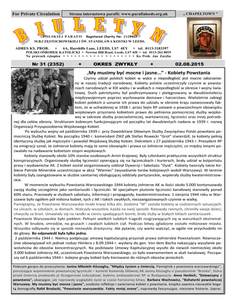 For Private Circulation Strona internetowa parafii: www.parafialeeds.org.uk „ CHAPELTOWN ” P O L SK I E J P A R A F I I Registered Charity No: 1119423 M.B.CZĘSTOCHOWSKIEJ I ŚW. STANISŁAWA KOSTKI W LEEDS. ADRES KS. PROB. + 6A, Harehills Lane, LEEDS, LS7 4EY + tel. 0113-3183397 POLSKI OŚRODEK KATOLICKI + Newton Hill Road, Leeds, LS7 4JE + tel. 0113-262 8019 Na prawach rękopisu + + + + + + + + + + + + + + + + + + + Ks. Prob. Jan Zaręba Nr 31 (2352) + OKRES ZWYKŁY „My + 02.08.2015 musimy być mocne i jasne...” - Kobiety Powstania Czynny udział polskich kobiet w walce o niepodległość jest mocno zakorzeniony w naszej tradycji narodowej. Kobiety polskie uczestniczyły czynnie w powstaniach narodowych w XIX wieku i w walkach o niepodległość w okresie I wojny światowej. Duch patriotyzmu był podtrzymywany i pielęgnowany w dwudziestoleciu międzywojennym poprzez wychowanie domowe i harcerstwo. Wieloletnie zabiegi kobiet polskich o uznanie ich prawa do udziału w obronie kraju zaowocowały faktem, że w uchwalonej w 1938 r. przez Sejm RP ustawie o powszechnym obowiązku wojskowym przyznano kobietom prawo do pełnienia pomocniczej służby wojskowej w zakresie służby przeciwlotniczej, wartowniczej, łączności oraz innej potrzebnej dla celów obrony. Strukturom kobiecym funkcjonującym od początku lat dwudziestych nadano w 1939 r. nazwę Organizacji Przysposobienia Wojskowego Kobiet. Po wybuchu wojny od października 1939 r. przy Dowództwie Głównym Służby Zwycięstwu Polski powołano pomocniczą Służbę Kobiet. Na początku 1940 r. komendant ZWZ płk Stefan Rowecki "Grot" stwierdził, że kobiety pełnią identyczną służbę jak mężczyźni i powołał Wojskową Służbę Kobiet. Dekretem z 27 października 1943 r. Prezydent RP na emigracji uznał, że żołnierze kobiety mają te same obowiązki i prawa co żołnierze mężczyźni, co między innymi pozwalało na nadawanie kobietom stopni wojskowych. Kobiety stanowiły około 10% stanów osobowych Armii Krajowej. Były członkami praktycznie wszystkich struktur konspiracyjnych. Organizowały służbę łączności opierającą się na łączniczkach i kurierach, brały udział w kolportażu prasy i wydawnictw AK. Z kobiet został zorganizowany oddział Dywersji i Sabotażu "Dysk". Kobiety tworzyły także Kobiece Patrole Minerskie uczestniczące w akcji "Wieniec" (wysadzanie torów kolejowych wokół Warszawy). W terenie kobiety były zaangażowane w służbie sanitarnej obsługującej oddziały partyzanckie, wspierały służby kwatermistrzowskie. W momencie wybuchu Powstania Warszawskiego 1944 kobiety żołnierze AK w ilości około 5.000 kontynuowały swoją służbę szczególnie jako sanitariuszki i łączniczki. W specjalnym plutonie łączności kanałowej stanowiły ponad 60% stanu. Pracowały w służbach sabotażu, informacji i propagandy, kwatermistrzostwa. 1 sierpnia 1944 roku w Warszawie było ogółem pół miliona kobiet, tych z AK i takich zwykłych, niezaangażowanych czynnie w walkę. Pamiętajmy, że Powstanie Warszawskie miało trwać kilka dni. Godzina "W" zastała kobiety w codziennych sytuacjach: na ulicach, w szkołach, w domach. Walczyły wszystkie, każda na swój sposób. Ratowały rannych, chroniły swoje dzieci, chwyciły za broń. Umawiały się na randki w cieniu spadających bomb, brały śluby w białych kitlach sanitariuszek . Powstanie Warszawskie było piekłem. Pełnym wielkich ludzkich tragedii rozgrywających się w warunkach ekstremalnych. W brudzie, smrodzie, na gruzach i zwałach ludzkich ciał. Podczas bitwy zgładzone zostało milionowe miasto. Wszystko odbywało się w sposób niezwykle drastyczny. Ale pytanie, czy warto walczyć, w ogóle nie przychodziło im do głowy. Bo odpowiedź była tylko jedna. 2 października 1944 r. Niemcy podpisując umowę kapitulacyjną przyznali prawa żołnierskie Powstańcom. Równocześnie obowiązywał ich jednak rozkaz Himlera z 8.09.1944 r. wysłany do gen. Von dem Bacha nakazujący wysyłanie powstańców do obozów koncentracyjnych. Na podstawie Umowy Kapitulacyjnej wyszło do niewoli niemieckiej około 3.000 kobiet żołnierzy AK, uczestniczek Powstania Warszawskiego, co było ewenementem w skali światowej. Począwszy od 6 października 1944 r. kolejne grupy kobiet były kierowane do różnych obozów jenieckich. Polecam gorąco do przeczytania: Janina Mikoleit–Köszeghy, "Między życiem a śmiercią. Pamiętnik z powstania warszawskiego", poruszające wspomnienie powstańczej łączniczki – kurierki Komendy Głównej AK Janiny Köszeghy o pseudonimie "Bronka", która przed śmiercią przekazała je Grzegorzowi Łubczykowi, byłemu ambasadorowi RP w Budapeszcie. Anna Herbich, "Dziewczyny z powstania", ukazujące, jak naprawdę wyglądało życie w czasie heroicznej bitwy. Barbara Wachowicz, "Bohaterki powstańczej Warszawy. My musimy być mocne i jasne", osobiste refleksje i zwierzenia kobiet z powstania. książka zawiera niezwykle bogatą ikonografię Rafał Brodacki, "Powstanie warszawskie. Fakty mniej znane", naprawdę fascynujące, nieznane historie. (oprac. PORZĄDEK MSZY ŚWIĘTYCH I NABOŻEŃSTW NIEDZIELA, 2 SIERPNIA 2015; 18 ZWYKŁA 9:30 – Za śp. wujka + Kazimierza Wiącka, babcię + Antoninę Chlewicką, ojca chrzestnego + Jana Gawęckiego, wujka + Mieczysława Stycznia - int. rodziny pp. Kowalczyk 11:00 – Do Bożej Opatrzności z prośbą o potrzebne łaski oraz Błogosławieństwa Bożego i zdrowie dla członków Koła Żywego Różańca w Leeds i Ich rodzin oraz za zmarłych członków KŻR - intencja własna KŻR Harrogate 16.30 – Do Bożej Opatrzności z prośbą o potrzebne łaski i Błogosławieństwa Bożego oraz zdrowie dla małżonków Katarzyny i Macieja Bujakowskich z okazji rocznicy ślubu 19:00 – Za śp. brata + Dominika Fiszbaka, dziadków + Kazimierza i + Jadwigę Urbańskich oraz zmarłych z rodzin ++ Kozarnik i ++ Fiszbak i kolegę śp. + Tomasza Domarackiego - dar intencji od rodziny