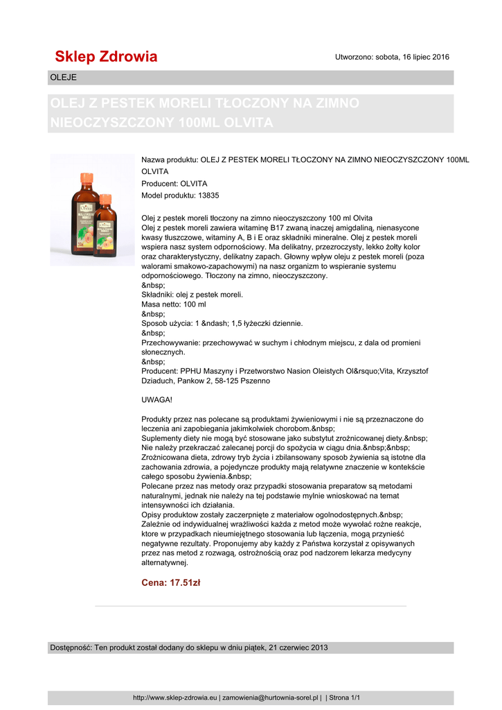 Sklep Zdrowia Utworzono: sobota, 16 lipiec 2016 OLEJE OLEJ Z PESTEK MORELI TŁOCZONY NA ZIMNO NIEOCZYSZCZONY 100ML OLVITA Nazwa produktu: OLEJ Z PESTEK MORELI TŁOCZONY NA ZIMNO NIEOCZYSZCZONY 100ML OLVITA Producent: OLVITA Model produktu: 13835 Olej z pestek moreli tłoczony na zimno nieoczyszczony 100 ml Olvita Olej z pestek moreli zawiera witaminę B17 zwaną inaczej amigdaliną, nienasycone kwasy tłuszczowe, witaminy A, B i E oraz składniki mineralne. Olej z pestek moreli wspiera nasz system odpornościowy. Ma delikatny, przezroczysty, lekko żołty kolor oraz charakterystyczny, delikatny zapach. Głowny wpływ oleju z pestek moreli (poza walorami smakowo-zapachowymi) na nasz organizm to wspieranie systemu odpornościowego. Tłoczony na zimno, nieoczyszczony. Składniki: olej z pestek moreli. Masa netto: 100 ml Sposob użycia: 1 – 1,5 łyżeczki dziennie. Przechowywanie: przechowywać w suchym i chłodnym miejscu, z dala od promieni słonecznych. Producent: PPHU Maszyny i Przetworstwo Nasion Oleistych Ol’Vita, Krzysztof Dziaduch, Pankow 2, 58-125 Pszenno UWAGA! Produkty przez nas polecane są produktami żywieniowymi i nie są przeznaczone do leczenia ani zapobiegania jakimkolwiek chorobom. Suplementy diety nie mogą być stosowane jako substytut zrożnicowanej diety. Nie należy przekraczać zalecanej porcji do spożycia w ciągu dnia. Zrożnicowana dieta, zdrowy tryb życia i zbilansowany sposob żywienia są istotne dla zachowania zdrowia, a pojedyncze produkty mają relatywne znaczenie w kontekście całego sposobu żywienia. Polecane przez nas metody oraz przypadki stosowania preparatow są metodami naturalnymi, jednak nie należy na tej podstawie mylnie wnioskować na temat intensywności ich działania. Opisy produktow zostały zaczerpnięte z materiałow ogolnodostępnych. Zależnie od indywidualnej wrażliwości każda z metod może wywołać rożne reakcje, ktore w przypadkach nieumiejętnego stosowania lub łączenia, mogą przynieść negatywne rezultaty. Proponujemy aby każdy z Państwa korzystał z opisywanych przez nas metod z rozwagą, ostrożnością oraz pod nadzorem lekarza medycyny alternatywnej. Cena: 17.51zł Dostępność: Ten produkt został dodany do sklepu w dniu piątek, 21 czerwiec 2013 http://www.sklep-zdrowia.eu | [email protected] | | Strona 1/1