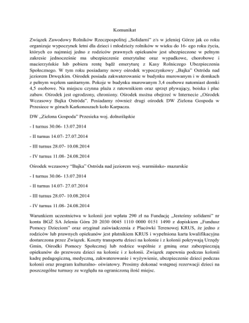Komunikat Związek Zawodowy Rolników Rzeczpospolitej „Solidarni” z/s w jeleniej Górze jak co roku organizuje wypoczynek letni dla dzieci i młodzieży rolników w wieku do 16- ego roku życia, których co najmniej jedno z rodziców prawnych opiekunów jest ubezpieczone w pełnym zakresie jednocześnie ma ubezpieczenie emerytalne oraz wypadkowe, chorobowe i macierzyńskie lub pobiera rentę bądź emeryturę z Kasy Rolniczego Ubezpieczenia Społecznego. W tym roku posiadamy nowy ośrodek wypoczynkowy „Bajka” Ostróda nad jeziorem Drwęckim. Ośrodek posiada zakwaterowanie w budynku murowanym i w domkach z pełnym węzłem sanitarnym. Pokoje w budynku murowanym 3,4 osobowe natomiast domki 4,5 osobowe. Na miejscu czynna plaża z ratownikiem oraz sprzęt pływający, boiska i plac zabaw. Ośrodek jest ogrodzony, chroniony. Ośrodek można obejrzeć w Internecie „Ośrodek Wczasowy Bajka Ostróda”. Posiadamy również drugi ośrodek DW Zielona Gospoda w Przesiece w górach Karkonoszach koło Karpacza. DW „Zielona Gospoda” Przesieka woj. dolnośląskie - I turnus 30.06- 13.07.2014 - II turnus 14.07- 27.07.2014 - III turnus 28.07- 10.08.2014 - IV turnus 11.08- 24.08.2014 Ośrodek wczasowy “Bajka” Ostróda nad jeziorem woj. warmińsko- mazurskie - I turnus 30.06- 13.07.2014 - II turnus 14.07- 27.07.2014 - III turnus 28.07- 10.08.2014 - IV turnus 11.08- 24.08.2014 Warunkiem uczestnictwa w kolonii jest wpłata 290 zł na Fundację „Jesteśmy solidarni” nr konta BGŻ SA Jelenia Góra 20 2030 0045 1110 0000 0151 1490 z dopiskiem „Fundusz Pomocy Dzieciom” oraz oryginał zaświadczenia z Placówki Terenowej KRUS, że jedno z rodziców lub prawnych opiekunów jest płatnikiem KRUS i wypełniona karta kwalifikacyjna dostarczona przez Związek. Koszty transportu dzieci na kolonie i z kolonii pokrywają Urzędy Gmin, Ośrodki Pomocy Społecznej lub rodzice wspólnie z gminą oraz zabezpieczają opiekunów do przewozu dzieci na kolonie i z kolonii. Związek zapewnia podczas kolonii kadrę pedagogiczną, medyczną, zakwaterowanie i wyżywienie, ubezpieczenie dzieci podczas kolonii oraz program kulturalno- oświatowy. Prosimy dokonać wstępnej rezerwacji dzieci na poszczególne turnusy ze względu na ograniczoną ilość miejsc. Przyjmujemy też głoszenia dzieci rodziców nie płatników KRUS za pełną odpłatnością 1100zł. Nie wliczając transportu dziecka. Zgłoszenia na kolonie proszę zgłaszać na adres biura: ZZRR „Solidarni” Ul. Wojska Polskiego 18 58- 500 Jelenia Góra Kontakt: Katarzyna Kryza 607 151 006, Marian Zagórny 880 552 252 Program kolonii „Bajka” Ostróda lato 2014-04-17 1. Przyjazd, zakwaterowanie, podział na grupy 1. Zwiedzanie okolic i miasta Ostródy 2. Kąpiel na plaży w ośrodku 3. Wyjazd do Miłomłynów, rejs statkiem 4. Zajęcia sportowe na ośrodku, zawody wodne na kajakach i rowerach wodnych 5. Wyjazd na Pola Grunwaldu 6. Zajęcia wojskowe: zdobywanie odznak LOK 7. Wyjazd do Ostródy: zwiedzanie Zamku Ostródzkiego 8. Wyjazd do Gdańska; plaża oraz zwiedzanie miasta, Westerplatte 9. Wycieczka do Gietrzwałdu: zwiedzanie Sanktuarium 10. Wędrówka po Pojezierzu Ostródzkim turystycznych; wieczorem ognisko i zwiedzanie okolicznych kurortów 11. Wyjazd do Olsztynka; zwiedzanie „Skansenu Wsi” 12. Wyjazd do Olsztynka: zwiedzanie miasta 13. Uczestnictwa w obchodach święta Ostródy 14. Uczestnictwo w mistrzostwach piłki plażowej, ręcznej i siatkówki w Starych Jabłonkach 15. Ogniska, wieczornice i dyskoteki 16. Podsumowanie kolonii, przygotowanie do wyjazdu Program kolonii „Zielona Gospoda” Przesieka lato 2014 1. Przyjazd, zakwaterowanie, podział na grupy 2. Zwiedzanie okolic oraz wodospadu „Podgórnej” 3. Wyjazd do Karpacza: zwiedzanie oraz zjazd „Rynną Zjazdową” 4. Zajęcia w ośrodku: zawody sportowe między grupami i koloniami 5. Wyjazd do jeleniej Gory- Cieplic, zwiedzanie Muzeum Ornitologicznego oraz Uzdrowiska „Cieplice” 6. Wyjazd do Szklarskiej Poręby: zwiedzanie wodospadu „Kamieńczyk”, wodospadu „Szklarka”, Chaty Walońskiej oraz Muzeum Ziemi 7. Wymarsz w góry: zwiedzanie Zamku „Chojnik” 8. Basen 9. Wędrówka szlakami Gorskimi: Jagniątków- Michałowice 10. Wyjazd kolejką „Trasą Słoneczną” do Lwówka Śl., zwiedzanie zabytkowej Baszty oraz Sali Mieszczańskiej 11. Wędrówki szlakami górskimi 12. Zajęcia rekreacyjne na ośrodku, występy artystyczne, ogniska, wieczornice i dyskoteki 13. Wyjazd do Jeleniej Góry, zwiedzanie miasta 14. Wycieczka do Czech- miasto Harrachov 15. Zwiedzanie okolic 16. Podsumowanie kolonii Program obu kolonii może ulec zmianie lub przesunięciu, ze względu na warunki atmosferyczne i niezależne od Organizatora WZÓR Zaświadczenie Niniejszym zaświadcza się, że Pan/Pani………. zam. …………………… podlega ubezpieczeniu społecznemu rolników w okresach: - 2002-01-01 do 2003-09-30 z mocy ustawy w zakresie emerytalno- rentowym oraz wypadkowym, chorobowym i macierzyńskim jako domownik - 2003-10-01 do nadal z mocy ustawy w zakresie emerytalno- rentowym oraz wypadkowym, chorobowym i macierzyńskim jako rolnik Zaświadczenie wydaje się celem przedłożenia koloniami Podpis