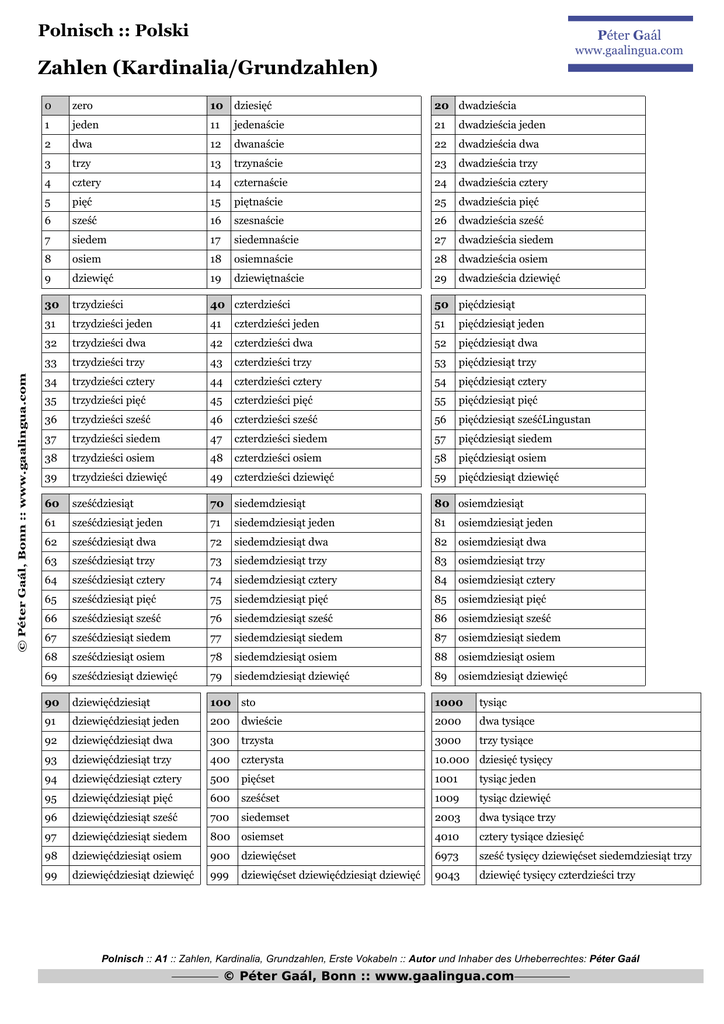 Polnisch :: Polski Péter Gaál www.gaalingua.com © Péter Gaál, Bonn :: www.gaalingua.com Zahlen (Kardinalia/Grundzahlen) 0 zero 10 dziesięć 20 dwadzieścia 1 jeden 11 jedenaście 21 dwadzieścia jeden 2 dwa 12 dwanaście 22 dwadzieścia dwa 3 trzy 13 trzynaście 23 dwadzieścia trzy 4 cztery 14 czternaście 24 dwadzieścia cztery 5 pięć 15 piętnaście 25 dwadzieścia pięć 6 sześć 16 szesnaście 26 dwadzieścia sześć 7 siedem 17 siedemnaście 27 dwadzieścia siedem 8 osiem 18 osiemnaście 28 dwadzieścia osiem 9 dziewięć 19 dziewiętnaście 29 dwadzieścia dziewięć 30 trzydzieści 40 czterdzieści 50 pięćdziesiąt 31 trzydzieści jeden 41 czterdzieści jeden 51 pięćdziesiąt jeden 32 trzydzieści dwa 42 czterdzieści dwa 52 pięćdziesiąt dwa 33 trzydzieści trzy 43 czterdzieści trzy 53 pięćdziesiąt trzy 34 trzydzieści cztery 44 czterdzieści cztery 54 pięćdziesiąt cztery 35 trzydzieści pięć 45 czterdzieści pięć 55 pięćdziesiąt pięć 36 trzydzieści sześć 46 czterdzieści sześć 56 pięćdziesiąt sześćLingustan 37 trzydzieści siedem 47 czterdzieści siedem 57 pięćdziesiąt siedem 38 trzydzieści osiem 48 czterdzieści osiem 58 pięćdziesiąt osiem 39 trzydzieści dziewięć 49 czterdzieści dziewięć 59 pięćdziesiąt dziewięć 60 sześćdziesiąt 70 siedemdziesiąt 80 osiemdziesiąt 61 sześćdziesiąt jeden 71 siedemdziesiąt jeden 81 osiemdziesiąt jeden 62 sześćdziesiąt dwa 72 siedemdziesiąt dwa 82 osiemdziesiąt dwa 63 sześćdziesiąt trzy 73 siedemdziesiąt trzy 83 osiemdziesiąt trzy 64 sześćdziesiąt cztery 74 siedemdziesiąt cztery 84 osiemdziesiąt cztery 65 sześćdziesiąt pięć 75 siedemdziesiąt pięć 85 osiemdziesiąt pięć 66 sześćdziesiąt sześć 76 siedemdziesiąt sześć 86 osiemdziesiąt sześć 67 sześćdziesiąt siedem 77 siedemdziesiąt siedem 87 osiemdziesiąt siedem 68 sześćdziesiąt osiem 78 siedemdziesiąt osiem 88 osiemdziesiąt osiem 69 sześćdziesiąt dziewięć 79 siedemdziesiąt dziewięć 89 90 dziewięćdziesiąt 100 sto 1000 tysiąc 91 dziewięćdziesiąt jeden 200 dwieście 2000 dwa tysiące 92 dziewięćdziesiąt dwa 300 trzysta 3000 trzy tysiące 93 dziewięćdziesiąt trzy 400 czterysta 10.000 dziesięć tysięcy 94 dziewięćdziesiąt cztery 500 pięćset 1001 tysiąc jeden 95 dziewięćdziesiąt pięć 600 sześćset 1009 tysiąc dziewięć 96 dziewięćdziesiąt sześć 700 siedemset 2003 dwa tysiące trzy 97 dziewięćdziesiąt siedem 800 osiemset 4010 cztery tysiące dziesięć 98 dziewięćdziesiąt osiem 900 dziewięćset 6973 sześć tysięcy dziewięćset siedemdziesiąt trzy 99 dziewięćdziesiąt dziewięć 999 dziewięćset dziewięćdziesiąt dziewięć 9043 dziewięć tysięcy czterdzieści trzy osiemdziesiąt dziewięć Polnisch :: A1 :: Zahlen, Kardinalia, Grundzahlen, Erste Vokabeln :: Autor und Inhaber des Urheberrechtes: Péter Gaál © Péter Gaál, Bonn :: www.gaalingua.com
