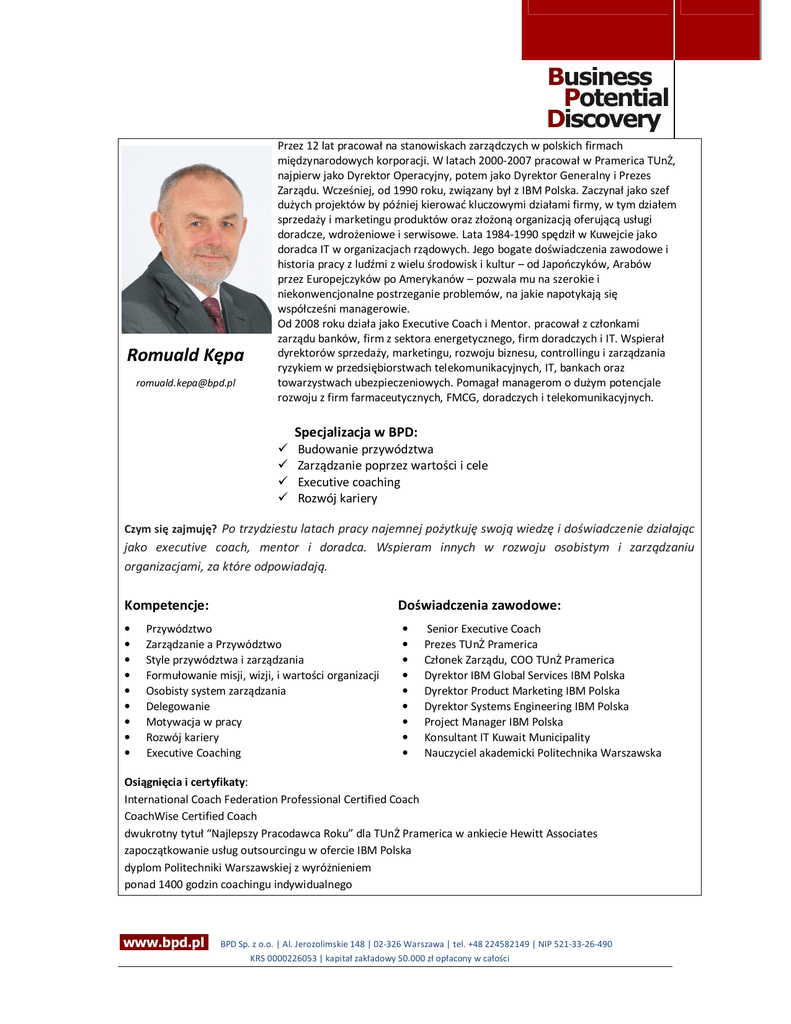 Romuald Kępa [email protected] Przez 12 lat pracował na stanowiskach zarządczych w polskich firmach międzynarodowych korporacji. W latach 2000-2007 pracował w Pramerica TUnŻ, najpierw jako Dyrektor Operacyjny, potem jako Dyrektor Generalny i Prezes Zarządu. Wcześniej, od 1990 roku, związany był z IBM Polska. Zaczynał jako szef dużych projektów by później kierować kluczowymi działami firmy, w tym działem sprzedaży i marketingu produktów oraz złożoną organizacją oferującą usługi doradcze, wdrożeniowe i serwisowe. Lata 1984-1990 spędził w Kuwejcie jako doradca IT w organizacjach rządowych. Jego bogate doświadczenia zawodowe i historia pracy z ludźmi z wielu środowisk i kultur – od Japończyków, Arabów przez Europejczyków po Amerykanów – pozwala mu na szerokie i niekonwencjonalne postrzeganie problemów, na jakie napotykają się współcześni managerowie. Od 2008 roku działa jako Executive Coach i Mentor. pracował z członkami zarządu banków, firm z sektora energetycznego, firm doradczych i IT. Wspierał dyrektorów sprzedaży, marketingu, rozwoju biznesu, controllingu i zarządzania ryzykiem w przedsiębiorstwach telekomunikacyjnych, IT, bankach oraz towarzystwach ubezpieczeniowych. Pomagał managerom o dużym potencjale rozwoju z firm farmaceutycznych, FMCG, doradczych i telekomunikacyjnych. Specjalizacja w BPD: Budowanie przywództwa Zarządzanie poprzez wartości i cele Executive coaching Rozwój kariery Czym się zajmuję? Po trzydziestu latach pracy najemnej pożytkuję swoją wiedzę i doświadczenie działając jako executive coach, mentor i doradca. Wspieram innych w rozwoju osobistym i zarządzaniu organizacjami, za które odpowiadają. Kompetencje: • • • • • • • • • Doświadczenia zawodowe: Przywództwo Zarządzanie a Przywództwo Style przywództwa i zarządzania Formułowanie misji, wizji, i wartości organizacji Osobisty system zarządzania Delegowanie Motywacja w pracy Rozwój kariery Executive Coaching • • • • • • • • • Senior Executive Coach Prezes TUnŻ Pramerica Członek Zarządu, COO TUnŻ Pramerica Dyrektor IBM Global Services IBM Polska Dyrektor Product Marketing IBM Polska Dyrektor Systems Engineering IBM Polska Project Manager IBM Polska Konsultant IT Kuwait Municipality Nauczyciel akademicki Politechnika Warszawska Osiągnięcia i certyfikaty: International Coach Federation Professional Certified Coach CoachWise Certified Coach dwukrotny tytuł “Najlepszy Pracodawca Roku” dla TUnŻ Pramerica w ankiecie Hewitt Associates zapoczątkowanie usług outsourcingu w ofercie IBM Polska dyplom Politechniki Warszawskiej z wyróżnieniem ponad 1400 godzin coachingu indywidualnego www.bpd.pl BPD Sp. z o.o. | Al. Jerozolimskie 148 | 02-326 Warszawa | tel. +48 224582149 | NIP 521-33-26-490 KRS 0000226053 | kapitał zakładowy 50.000 zł opłacony w całości