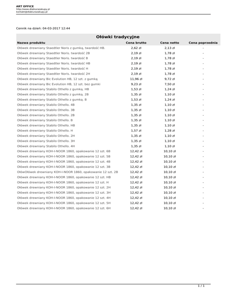 ART OFFICE http://www.dlabiurazakupy.pl [email protected] Cennik na dzień: 04-03-2017 12:44 Ołówki tradycyjne Nazwa produktu Cena brutto Cena netto Cena poprzednia Ołówek drewniany Staedtler Noris z gumką, twardość HB. 2,62 zł 2,13 zł - Ołówek drewniany Staedtler Noris. twardość 2B 2,19 zł 1,78 zł - Ołówek drewniany Staedtler Noris. twardość B 2,19 zł 1,78 zł - Ołówek drewniany Staedtler Noris. twardość HB 2,19 zł 1,78 zł - Ołówek drewniany Staedtler Noris. twardość H 2,19 zł 1,78 zł - Ołówek drewniany Staedtler Noris. twardość 2H 2,19 zł 1,78 zł - Ołówek drewniany Bic Evolution HB, 12 szt. z gumką 11,96 zł 9,72 zł - Ołówek drewniany Bic Evolution HB, 12 szt. bez gumki 9,23 zł 7,50 zł - Ołówek drewniany Stabilo Othello z gumką. HB 1,53 zł 1,24 zł - Ołówek drewniany Stabilo Othello z gumką. 2B 1,35 zł 1,10 zł - Ołówek drewniany Stabilo Othello z gumką. B 1,53 zł 1,24 zł - Ołówek drewniany Stabilo Othello. 4B 1,35 zł 1,10 zł - Ołówek drewniany Stabilo Othello. 3B 1,35 zł 1,10 zł - Ołówek drewniany Stabilo Othello. 2B 1,35 zł 1,10 zł - Ołówek drewniany Stabilo Othello. B 1,35 zł 1,10 zł - Ołówek drewniany Stabilo Othello. HB 1,35 zł 1,10 zł - Ołówek drewniany Stabilo Othello. H 1,57 zł 1,28 zł - Ołówek drewniany Stabilo Othello. 2H 1,35 zł 1,10 zł - Ołówek drewniany Stabilo Othello. 3H 1,35 zł 1,10 zł - Ołówek drewniany Stabilo Othello. 4H 1,35 zł 1,10 zł - Ołówek drewniany KOH-I-NOOR 1860, opakowanie 12 szt. 6B 12,42 zł 10,10 zł - Ołówek drewniany KOH-I-NOOR 1860, opakowanie 12 szt. 5B 12,42 zł 10,10 zł - Ołówek drewniany KOH-I-NOOR 1860, opakowanie 12 szt. 4B 12,42 zł 10,10 zł - Ołówek drewniany KOH-I-NOOR 1860, opakowanie 12 szt. 3B 12,42 zł 10,10 zł - OłówOłówek drewniany KOH-I-NOOR 1860, opakowanie 12 szt. 2B 12,42 zł 10,10 zł - Ołówek drewniany KOH-I-NOOR 1860, opakowanie 12 szt. HB 12,42 zł 10,10 zł - Ołówek drewniany KOH-I-NOOR 1860, opakowanie 12 szt. H 12,42 zł 10,10 zł - Ołówek drewniany KOH-I-NOOR 1860, opakowanie 12 szt. 2H 12,42 zł 10,10 zł - Ołówek drewniany KOH-I-NOOR 1860, opakowanie 12 szt. 3H 12,42 zł 10,10 zł - Ołówek drewniany KOH-I-NOOR 1860, opakowanie 12 szt. 4H 12,42 zł 10,10 zł - Ołówek drewniany KOH-I-NOOR 1860, opakowanie 12 szt. 5H 12,42 zł 10,10 zł - Ołówek drewniany KOH-I-NOOR 1860, opakowanie 12 szt. 6H 12,42 zł 10,10 zł - 1/1 Powered by TCPDF (www.tcpdf.org)
