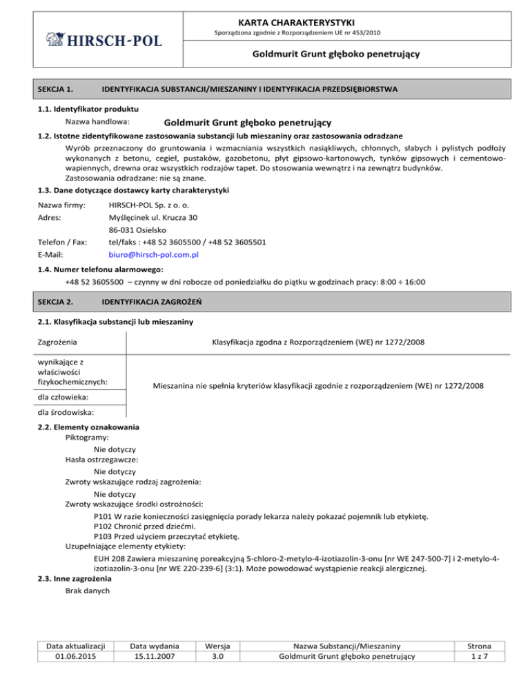 KARTA CHARAKTERYSTYKI Sporządzona zgodnie z Rozporządzeniem UE nr 453/2010 Goldmurit Grunt głęboko penetrujący SEKCJA 1. IDENTYFIKACJA SUBSTANCJI/MIESZANINY I IDENTYFIKACJA PRZEDSIĘBIORSTWA 1.1. Identyfikator produktu Nazwa handlowa: Goldmurit Grunt głęboko penetrujący 1.2. Istotne zidentyfikowane zastosowania substancji lub mieszaniny oraz zastosowania odradzane Wyrób przeznaczony do gruntowania i wzmacniania wszystkich nasiąkliwych, chłonnych, słabych i pylistych podłoży wykonanych z betonu, cegieł, pustaków, gazobetonu, płyt gipsowo-kartonowych, tynków gipsowych i cementowowapiennych, drewna oraz wszystkich rodzajów tapet. Do stosowania wewnątrz i na zewnątrz budynków. Zastosowania odradzane: nie są znane. 1.3. Dane dotyczące dostawcy karty charakterystyki Nazwa firmy: HIRSCH-POL Sp. z o. o. Adres: Myślęcinek ul. Krucza 30 86-031 Osielsko Telefon / Fax: tel/faks : +48 52 3605500 / +48 52 3605501 E-Mail: [email protected] 1.4. Numer telefonu alarmowego: +48 52 3605500 – czynny w dni robocze od poniedziałku do piątku w godzinach pracy: 8:00 ÷ 16:00 SEKCJA 2. IDENTYFIKACJA ZAGROŻEŃ 2.1. Klasyfikacja substancji lub mieszaniny Zagrożenia Klasyfikacja zgodna z Rozporządzeniem (WE) nr 1272/2008 wynikające z właściwości fizykochemicznych: Mieszanina nie spełnia kryteriów klasyfikacji zgodnie z rozporządzeniem (WE) nr 1272/2008 dla człowieka: dla środowiska: 2.2. Elementy oznakowania Piktogramy: Nie dotyczy Hasła ostrzegawcze: Nie dotyczy Zwroty wskazujące rodzaj zagrożenia: Nie dotyczy Zwroty wskazujące środki ostrożności: P101 W razie konieczności zasięgnięcia porady lekarza należy pokazać pojemnik lub etykietę. P102 Chronić przed dziećmi. P103 Przed użyciem przeczytać etykietę. Uzupełniające elementy etykiety: EUH 208 Zawiera mieszaninę poreakcyjną 5-chloro-2-metylo-4-izotiazolin-3-onu [nr WE 247-500-7] i 2-metylo-4izotiazolin-3-onu [nr WE 220-239-6] (3:1). Może powodować wystąpienie reakcji alergicznej. 2.3. Inne zagrożenia Brak danych Data aktualizacji 01.06.2015 Data wydania 15.11.2007 Wersja 3.0 Nazwa Substancji/Mieszaniny Goldmurit Grunt głęboko penetrujący Strona 1z7 SEKCJA 3. SKŁAD/INFORMACJA O SKŁADNIKACH 3.2 Mieszaniny Klasyfikacja wg Rozporządzenia (WE) nr 1272/2008 (CLP) Nazwa substancji % wagowy Zwroty H Stężenia graniczne / Współczynnik M - - - Identyfikator produktu - - Klasa zagrożenia - Mieszanina nie zawiera substancji dla których oznaczono najwyższe dopuszczalne stężenia dla zdrowia w środowisku pracy lub substancji stwarzających zagrożenie dla zdrowia lub środowiska powyżej stężeń ustalonych w przepisach. Lista zwrotów H – zob. sekcja 16 karty charakterystyki (jeśli wymienione). SEKCJA 4. ŚRODKI PIERWSZEJ POMOCY 4.1. Opis środków pierwszej pomocy Wdychanie: Wyprowadzić poszkodowanego z miejsca narażenia na świeże powietrze, zapewnić ciepło i spokój. W przypadku pojawienia się dolegliwości skonsultować się z lekarzem. Kontakt ze skórą: Zdjąć zanieczyszczoną odzież i obuwie i uprać przed ponownym użyciem. Zanieczyszczoną skórę dokładnie zmyć wodą z mydłem. W przypadku pojawienia się dolegliwości skonsultować się z lekarzem. Kontakt z oczami: Zanieczyszczone oczy przepłukać dokładnie dużą ilością wody przez 15 minut, trzymając szeroko rozwarte powieki. Jeśli obecne wyciągnąć szkła kontaktowe. W przypadku pojawienia się dolegliwości skonsultować się z lekarzem. Połknięcie: Wypłukać usta wodą, podać do wypicia 1-2 szklanki wody. Nigdy nie podawać niczego doustnie osobie nieprzytomnej. Przy wystąpieniu niepokojących objawów skonsultować się z lekarzem. 4.2. Najważniejsze ostre i opóźnione objawy oraz skutki narażenia Wdychanie: brak danych Kontakt ze skóra: produkt zawiera mieszaninę poreakcyjną 5-chloro-2-metylo-4-izotiazolin-3-onu [nr WE 247-500-7] i 2-metylo-4-izotiazolin-3-onu [nr WE 220-239-6] (3:1). Może powodować wystąpienie reakcji alergicznej. Kontakt z oczami: brak danych. Połkniecie: brak danych. 4.3. Wskazania dotyczące wszelkiej natychmiastowej pomocy lekarskiej i szczególnego postępowania z poszkodowanym Personelowi medycznemu udzielającemu pomocy pokazać kartę charakterystyki, etykietę lub opakowanie. SEKCJA 5. POSTĘPOWANIE W PRZYPADKU POŻARU 5.1. Środki gaśnicze Odpowiednie środki gaśnicze: Produkt niepalny, stosować środki gaśnicze odpowiednie dla palących się materiałów. Niewłaściwe środki gaśnicze: Nie są znane. 5.2. Szczególne zagrożenia związane z substancją lub mieszaniną Podczas pożaru mogą powstawać dymy i niebezpieczne gazy, w tym tlenki węgla. 5.3. Informacje dla straży pożarnej Stosować niezależny aparat oddechowy oraz odzież ochronną. SEKCJA 6. POSTĘPOWIANIE W PRZYPADKU NIEZAMIERZONEGO UWOLNIENIA DO ŚRODOWISKA Data aktualizacji 01.06.2015 Data wydania 15.11.2007 Wersja 3.0 Nazwa Substancji/Mieszaniny Goldmurit Grunt głęboko penetrujący Strona 2z7 6.1. Indywidualne środki ostrożności, wyposażenie ochronne i procedury w sytuacjach awaryjnych Stosować środki ochrony indywidualnej wymienione w sekcji 8 karty charakterystyki. 6.2. Środki ostrożności w zakresie ochrony środowiska Unikać przedostania się do gleby i systemów wodnych (kanalizacji, zbiorników wodnych itp.). 6.3. Metody i materiały zapobiegające rozprzestrzenianiu się skażenia i służące do usuwania skażenia Zassać lub zebrać mechanicznie, jako środka absorpcyjnego można użyć piasek. Umieścić w oznaczonym opakowaniu na odpady. Zanieczyszczoną powierzchnię spłukać wodą. Usuwać zgodnie z przepisami krajowymi. 6.4. Odniesienia do innych sekcji Odnieść się również do sekcji 8 i 13 karty charakterystyki. SEKCJA 7. POSTĘPOWANIE Z SUBSTANCJAMI I MIESZANINAMI ORAZ ICH MAGAZYNOWANIE 7.1. Środki ostrożności dotyczące bezpiecznego postępowania Unikać kontaktu ze skór i oczami. Unikać wdychania par i aerozoli. Stosować w odpowiednio wentylowanyc