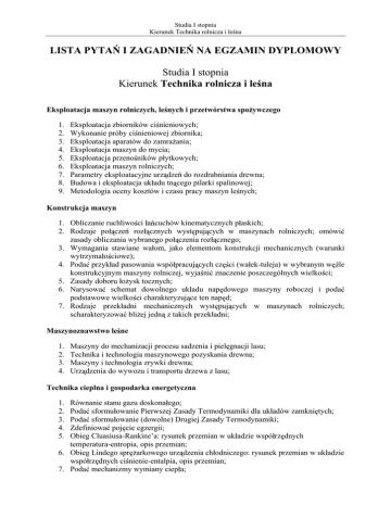 Studia I stopnia Kierunek Technika rolnicza i le na LISTA PYTA I ZAGADNIE NA EGZAMIN DYPLOMOWY Studia I stopnia Kierunek Technika rolnicza i le na Eksploatacja maszyn rolniczych, le nych i przetwórstwa spo ywczego 1. 2. 3. 4. 5. 6. 7. 8. 9. Eksploatacja zbiorników ci nieniowych; Wykonanie próby ci nieniowej zbiornika; Eksploatacja aparatów do zamra ania; Eksploatacja maszyn do mycia; Eksploatacja przeno ników p ytkowych; Eksploatacja maszyn rolniczych; Parametry eksploatacyjne urz dze do rozdrabniania drewna; Budowa i eksploatacja uk adu tn cego pilarki spalinowej; Metodologia oceny kosztów i czasu pracy maszyn le nych; Konstrukcja maszyn 1. Obliczanie ruchliwo ci a cuchów kinematycznych p askich; 2. Rodzaje po cze roz cznych wyst puj cych w maszynach rolniczych; omówi zasady obliczania wybranego po czenia roz cznego; 3. Wymagania stawiane wa om, jako elementom konstrukcji mechanicznych (warunki wytrzyma o ciowe); 4. Poda przyk ad pasowania wspó pracuj cych cz ci (wa ek-tuleja) w wybranym w le konstrukcyjnym maszyny rolniczej, wyja ni znaczenie poszczególnych wielko ci; 5. Zasady doboru o ysk tocznych; 6. Narysowa schemat dowolnego uk adu nap dowego maszyny roboczej i poda podstawowe wielko ci charakteryzuj ce ten nap d; 7. Rodzaje przek adni mechanicznych wyst puj cych w maszynach rolniczych; scharakteryzowa bli ej jedn z takich przek adni; Maszynoznawstwo le ne 1. 2. 3. 4. Maszyny do mechanizacji procesu sadzenia i piel gnacji lasu; Technika i technologia maszynowego pozyskania drewna; Maszyny i technologia zrywki drewna; Urz dzenia do wywozu i transportu drzewa z lasu; Technika cieplna i gospodarka energetyczna 1. 2. 3. 4. 5. Równanie stanu gazu doskona ego; Poda sformu owanie Pierwszej Zasady Termodynamiki dla uk adów zamkni tych; Poda sformu owanie (dowolne) Drugiej Zasady Termodynamiki; Zdefiniowa poj cie egzergii; Obieg Cluasiusa-Rankine a: rysunek przemian w uk adzie wspó rz dnych temperatura-entropia, opis przemian; 6. Obieg Lindego spr arkowego urz dzenia ch odniczego: rysunek przemian w uk adzie wspó rz dnych ci nienie-entalpia, opis przemian; 7. Poda mechanizmy wymiany ciep a; Studia I stopnia Kierunek Technika rolnicza i le na Grafika in ynierska 1. 2. 3. 4. 5. 6. Przekrój cz stkowy (wyrwanie); Przekrój stopniowy; Rysowanie i wymiarowanie gwintów; Oznaczanie tolerancji na rysunkach wykonawczych; Oznaczanie chropowato ci na rysunkach; Co musi zawiera rysunek wykonawczy elementu; Maszynoznawstwo przetwórstwa spo ywczego 1. 2. 3. 4. 5. 6. 7. Pompa wirowa; Obieraczka; Przeno nik ta mowy; Drylownica; Sortownik; Rozdrabniacz udarowy; Tworzenie linii technologicznych; Wymiana ciep a 1. Poda prawo Fouriera dla przewodzenia ciep a i opisa wielko ci zastosowane w równaniu tego prawa; 2. Wymieni dwa podstawowe materia y stosowane jako izolacje cieplne przy ochronie cieplnej budynków i scharakteryzowa ich w asno ci; 3. Zdefiniowa wzorem wspó czynnik przenikania ciep a dla przegrody budowlanej i opisa zastosowane w tej definicji wielko ci; 4. Napisa zale no okre laj c opór przewodzenia ciep a w ciance p askiej i obja ni na tej podstawie sens fizyczny tego oporu; Pojazdy rolnicze i le ne 1. Podstawowe zespo y silnika; rola i zadania; 2. Zespo y uk adu nap dowego ci gnika; rola i zadania; 3. Sposoby regulacji g boko ci orki; komponenty i funkcje systemu EHR (elektroniczno-hydraulicznego uk adu regulacji podno nika). 4. Klasyfikacja uk adów kierowniczych ci gników; charakterystyka uk adów hydraulicznych typu Orbitrol ; 5. Uk ady hamulcowe ci gników; instalacja pneumatyczna, schematy; 6. Klasyfikacja przyczep rolniczych; rola i zadania zespo ów; 7. Uk ady hamulcowe przyczep rolniczych; klasyfikacja, schematy; Produkcja rolnicza i le na 1. 2. 3. 4. 5. 6. Przedstaw i scharakteryzuj grupy ro lin uprawnych; Przedstaw technologi uprawy pszenicy; Przedstaw technologi uprawy j czmienia browarnego; Sposoby poprawienia yzno ci gleb; Na czym polega uprawa przedsiewna gleby; Na czym polega piel gnacja lasu; Studia I stopnia Kierunek Technika rolnicza i le na Technologia ywno ci 1. Od czego zale y warto od ywcza produktów spo ywczych; 2. Podzia produktów spo ywczych; 3. Scharakteryzuj wybrany proces rozdzielania niejednorodnych materia ów spo ywczych; 4. Wymie operacje cieplne zwi zane z wymian ciep a w technologii ywno ci; 5. Przedstaw przyk ady procesów biotechnologicznych stosowanych w produkcji ywno ci; 6. Scharakteryzuj systemy zapewnienia jako ci stosowane w produkcji ywno ci; 7. Wymagania sanitarne dotycz ce pomieszcze zwi zanych z produkcj ywno ci; Maszynoznawstwo rolnicze 1. Scharakteryzuj materia y konstrukcyjne stosowane w budowie maszyn rolniczych; 2. Budowa, dzia anie, regulacje wybranych zespo ów maszyn i urz dze do uprawy roli; 3. Budowa, dzia anie, regulacje wybranych zespo ów maszyn i urz dze do zbioru p odów rolnych; 4. Budowa, dzia anie, regulacje wybranych zespo ów maszyn i urz dze do przygotowania i zadawania pasz; 5. Budowa, dzia anie, regulacje wybranych zespo ów maszyn i urz dze do siewu; 6. Budowa, dzia anie, regulacje wybranych zespo ów maszyn i urz dze do sadzenia; Studia I stopnia Kierunek Technika rolnicza i le na Kierunek Technika rolnicza i le na Specjalno : In ynieria ywno ci 1. Ciecze nienewtonowskie i ich w a ciwo ci; 2. Sposoby rozdrabniania cia sta ych; 3. Scharakteryzowa proces homogenizacji; 4. Sposoby aglomerowania; 5. Scharakteryzowa proces blanszowania; 6. Scharakteryzowa proces pasteryzacji; 7. Scharakteryzowa proces sterylizacji; 8. Scharakteryzowa proces fluidyzacji; 9. Scharakteryzowa proces mieszania; 10. Sposoby przekazywania ciep a; 11. Porówna proces destylacji a rektyfikacji; 12. Kinetyka procesu suszenia; 13. Budowa przeno nika ta mowego; 14. Budowa i dzia anie przeno nika pneumatycznego; 15. Budowa i dzia anie wymiennika ciep a z rurami ebrowanymi; 16. Budowa i dzia anie p ytowego wymiennika ciep a; 17. Budowa i dzia anie wyparki z naturaln cyrkulacj roztworu; 18. Budowa i dzia anie dowolnej wyparki warstewkowej; 1