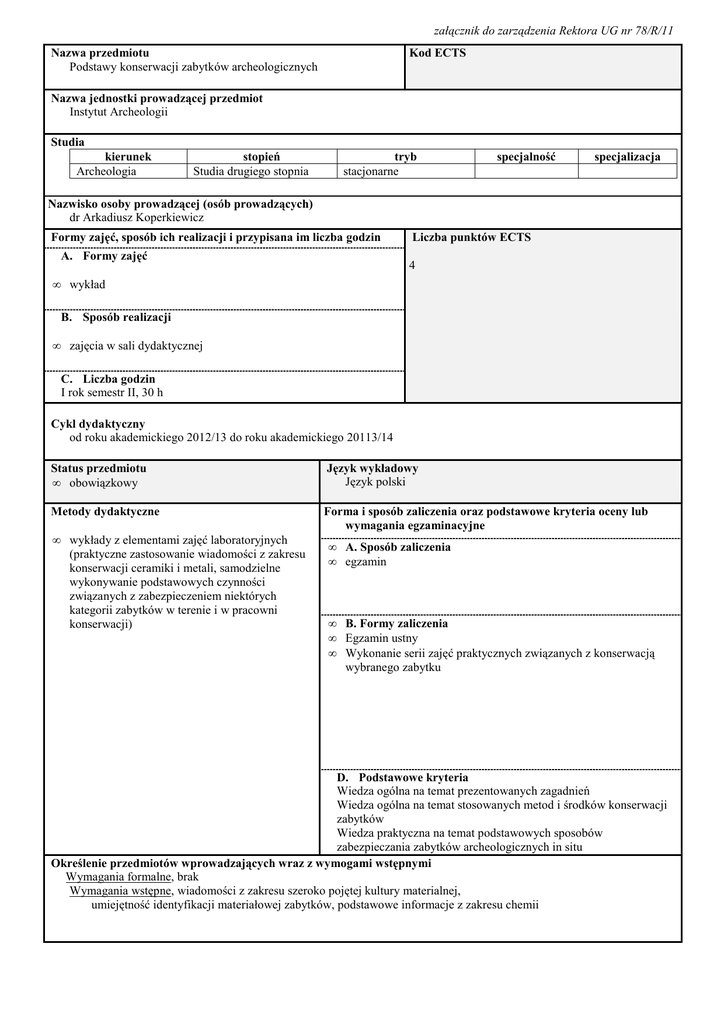 załącznik do zarządzenia Rektora UG nr 78/R/11 Nazwa przedmiotu Podstawy konserwacji zabytków archeologicznych Kod ECTS Nazwa jednostki prowadzącej przedmiot Instytut Archeologii Studia kierunek Archeologia stopień Studia drugiego stopnia tryb stacjonarne specjalność specjalizacja Nazwisko osoby prowadzącej (osób prowadzących) dr Arkadiusz Koperkiewicz Formy zajęć, sposób ich realizacji i przypisana im liczba godzin A. Formy zajęć Liczba punktów ECTS 4 • wykład B. Sposób realizacji • zajęcia w sali dydaktycznej C. Liczba godzin I rok semestr II, 30 h Cykl dydaktyczny od roku akademickiego 2012/13 do roku akademickiego 20113/14 Status przedmiotu • obowiązkowy Język wykładowy Język polski Metody dydaktyczne Forma i sposób zaliczenia oraz podstawowe kryteria oceny lub wymagania egzaminacyjne • wykłady z elementami zajęć laboratoryjnych (praktyczne zastosowanie wiadomości z zakresu konserwacji ceramiki i metali, samodzielne wykonywanie podstawowych czynności związanych z zabezpieczeniem niektórych kategorii zabytków w terenie i w pracowni konserwacji) • A. Sposób zaliczenia • egzamin • B. Formy zaliczenia • Egzamin ustny • Wykonanie serii zajęć praktycznych związanych z konserwacją wybranego zabytku D. Podstawowe kryteria Wiedza ogólna na temat prezentowanych zagadnień Wiedza ogólna na temat stosowanych metod i środków konserwacji zabytków Wiedza praktyczna na temat podstawowych sposobów zabezpieczania zabytków archeologicznych in situ Określenie przedmiotów wprowadzających wraz z wymogami wstępnymi Wymagania formalne, brak Wymagania wstępne, wiadomości z zakresu szeroko pojętej kultury materialnej, umiejętność identyfikacji materiałowej zabytków, podstawowe informacje z zakresu chemii Cele przedmiotu Zapoznanie studenta z podstawowymi problemami konserwacji zabytków archeologicznych, przekazanie podstawowej wiedzy teoretycznej z zakresu konserwacji zabytków, zapoznanie z przeglądem metod i środków stosowanych w archeologii polowej i pracowniach konserwacji, praktyczna umiejętność wykonania niezbędnych czynności z zakresu wstępnego zabezpieczania w trakcie prowadzenia badań terenowych Treści programowe A. Problematyka wykładu Przedstawienie podstawowych zagadnień dotyczących charakterystyki podstawowych kategorii materiałów i zabytków archeologicznych, czynników niszczących i mechanizmów destrukcji, podstawowych metod zabezpieczenia zabytków: 1. Wprowadzeni do konserwacji zabytków archeologicznych i ogólne zasady postępowania z zabytkiem in situ 2. Zabezpieczanie i konserwacja zabytków ceramicznych 3. Zabezpieczenie i konserwacja zabytków wykonanych z bursztynu 4. Zabezpieczenia i konserwacja zabytków wykonanych ze szkła 5. Zabezpieczenie i konserwacja zabytków wykonanych z surowców organicznych (tkaniny, skóra, kości) 6. Zabezpieczenie i konserwacja zabytków wykonanych z drewna 7. Zabezpieczenie i konserwacja zabytków wykonanych z metali kolorowych 8. Zabezpieczenie i konserwacja zabytków wykonanych z żelaza 9. Problemy konserwacji reliktów architektury na stanowisku archeologicznym 10. Sposoby przechowywania i ekspozycji zabytków oraz zasady urządzenia pracowni konserwacji Wykaz literatury A. Literatura wymagana do ostatecznego zaliczenia zajęć (zdania egzaminu): Babińsk L. (red.) 1999 Drewno archeologiczne. Badania i konserwacja. Sympozjum Biskupin – Wenecja, 22-24 czerwca 1999, Biskupin. Borusiewicz W. 1985 Konserwacja zabytków budownictwa murowanego, Warszawa. Kieferling G. 2003 Kilka uwag konserwacji zabytków ceramicznych, MA XXXIV, s. 171-175. Kieferling G. 2006 Konserwacja żelaznych zabytków archeologicznych, MA, XXXVI, s. 245-250. Kobyliński Z. (red.) 1998 Pierwsza pomoc dla zabytków archeologicznych, Warszawa. Kwiatkowska K. 2002 Wybrane metody konserwacji bursztynu, IX Seminarium – Amberif 2002. Bursztyn w sztuce i przetwórstwie współczesnym. Konserwacja zabytków z bursztynu, Gdańsk – Warszawa, s. 18-21. Krause J. 1979 Badania nad usuwaniem produktów korozji z powierzchni zabytkowych obiektów żelaznych, Biblioteka Muzealnictwa i Ochrony Zabytków, ser. B, nr 57, Warszawa. Lehmann J., 1987 Badania korozji i doświadczenia w konserwacji archeologicznych zabytków żelaznych. Prace i Materiały Muzeum Archeologicznego i Etnograficznego w Łodzi, Seria Numizmatyczna i Konserwatorska, nr 7. Pianowski Z., 1995 O sposobach zabezpieczania oraz ekspozycji reliktów architektury średniowiecznej odsłoniętych w trakcie wykopalisk, „Ochrona Zabytków”, nr 1, s. 24-30. Ślesiński W., 1995 Konserwacja zabytków sztuki, t. 3, Rzemiosło Artystyczne, Warszawa. B. Literatura uzupełniająca Barov Z. 1988 The reconstruction of a Greek Vase: The Kyknos Krater, Studies in Conservation, 33, z. 4, 165-177. Ciabach J. 1992 Właściwości żywic sztucznych stosowanych w konserwacji zabytków, Toruń. Chemia 1990 Ilustrowana encyclopedia dla wszystkich pod red. G. Widawskiej-Grot, A. Schellenberg oraz S. Bryc, E. CzarneckiejŻołek, A. Łaskiej-Gmaj, z. H. Radkowskiej i M Wiśniewskiej, Warszawa Corfield M., 1996 The conservation in field archaeology, [w:] Archaeological conservation. Dowman E.A., 1970 Conserwation in Field Archaeolgy, London. Drążkowska A., Grupa M., 1996 Uwagi o konserwacji przedmiotów znalezionych w grobach oficerów polskich w Katyniu i Charkowie [w:] Zbrodnia nie ukarana. Katyń-Twer-Charków, s. 78-91, Warszawa. Elton M. 2002 Konserwacja celtyckich naczyń ceramicznych: flasza i naczynie beczułkowate, okres lateński (IV – I w.p.n.e.) pochodzących ze stanowiska archeologicznego Kraków – Pleszów 20, własność Muzeum Archeologicznego w Krakowie, Oddział w Nowej Hucie, niepublikowany maszynopis pracy magisterskiej Józefowicz E. 1957 Chemia nieorganiczna, Warszawa Krajewski A., Witomski P., 2003 Ochrona drewna, Warszawa. Królikowska-Patarajak K., Ważny T. 1999 Klasyczna metoda cukrowa w konserwacji drewna archeologicznego, Dr