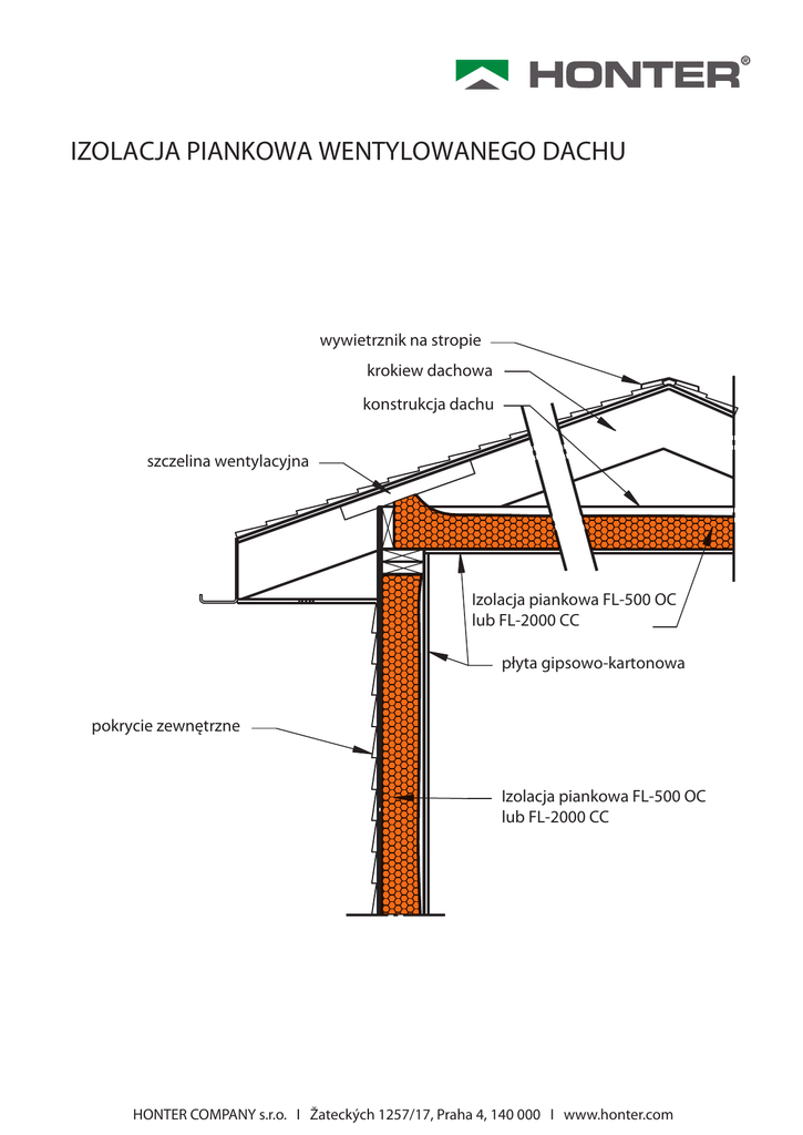IZOLACJA PIANKOWA WENTYLOWANEGO DACHU wywietrznik na stropie krokiew dachowa konstrukcja dachu szczelina wentylacyjna Izolacja piankowa FL-500 OC lub FL-2000 CC płyta gipsowo-kartonowa pokrycie zewnętrzne Izolacja piankowa FL-500 OC lub FL-2000 CC HONTER COMPANY s.r.o. I Žateckých 1257/17, Praha 4, 140 000 I www.honter.com