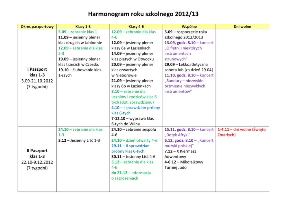 Harmonogram roku szkolnego 2012/13 Okres paszportowy I Paszport klas 1-3 3.09-21.10.2012 (7 tygodni) Klasy 1-3 5.09 – zebranie klas 1 11.09 – jesienny plener klas drugich w Jabłonnie 12.09 – zebranie dla klas 2-3 19.09 – jesienny plener klas trzecich w Czersku 19.10 – ślubowanie klas 1-szych 24.10 – zebranie dla klas 1-3 3.12 – Jesienny Liść 1-3 II Paszport klas 1-3 22.10-9.12.2012 (7 tygodni) Klasy 4-6 Wspólne 12.09 – zebranie dla klas 4-6 12.09 – jesienny plener klasy 6a w Łazienkach 14.09 – jesienny plener klas piątych w Otwocku 20.09 – jesienny plener klas czwartych w Nieborowie 21.09 – jesienny plener klasy 6b w Łazienkach 3.10 – zebranie dla uczniów i rodziców klas 6tych (dot. sprawdzianu) 4.10 – I sprawdzian próbny klas 6-tych 7-12.10 – wyprawa klas 6-tych do Wilna 24.10 – zebranie zespołu 4-6 24.10 – dzień otwarty 4-6 29.11 – II sprawdzian próbny klas 6-tych 30.11 – Jesienny Liść 4-6 5.12 – zebranie dla klas 4-6 do 21.12 – informacja o zagrożeniach 3.09 – rozpoczęcie roku szkolnego 2012/2013 13.09, godz. 8.10 – koncert „O fletni i niektórych instrumentach strunowych” 29.09 – Lekkoatletyczna sobota lub [za dzień 29.04] 11.10, godz. 8.10 – koncert „Bandury – niezwykłe brzmienie niezwykłych instrumentów” Dni wolne 15.11, godz. 8.10 – koncert 1-4.11 – dni wolne (Święto „Dotyk Afryki” Zmarłych) 6.12, godz. 8.10 – „Koncert muzyki polskiej” 7.12 – X Kiermasz Adwentowy 4-6.12 – Mikołajkowy Turniej Judo Okres paszportowy Klasy 1-3 12.12 – zebranie dla klas 1-3, spotkania indywidualne dla klasy 1a III Paszport 16.01 – dzień otwarty 1-3 * klas 1-3 (bez nauczycieli NZ) 10.12-27.01.2013 21.01 – Dzień Babci i Dziadka (7 tygodni) 25.01 – półfinał Konkursu Recytatorskiego klas 1-3 IV Paszport klas 1-3 11.02-31.03.2013 (7 tygodni) V Paszport klas 1-3 8.04-2.06.2013 (8 tygodni) Klasy 4-6 Wspólne Dni wolne 10.01 – III sprawdzian próbny klas 6-tych do 11.01 – rozliczenie prac dodatkowych 15-18.01 – Złoty Jęzor 16.01 – dzień otwarty 4-6 3.01, godz. 8.10 – koncert „Żywa lekcja historii” 19.01 – Pływacka Sobota (lub 16.02 lub 23.02) [za dzień 30.04] 23.01 – klasyfikacja śródroczna + rada zatwierdzająca 22.12-01.01 – zimowa przerwa świąteczna 26.01-10.02 – ferie zimowe 13.02 – zebranie dla klas 1-3 18-22.03 – Finał Konkursu Recytatorskiego kl. 1-3 7.03 – IV sprawdzian próbny klas 6-tych 13.03 – zebranie zespołu 4-6 14.02, godz. 8.10 – koncert 28.03-2.04 – wiosenna „Mała historia muzyki pop” przerwa wiosenna 14.03, godz. 8.10 – koncert „Od menueta do rock’n’rolla” 3.04 – spotkania indywidualne dla klas 1-3 13-17.05 – English Song Festiwal – klasy 1 (lub 5-11.06) 27-29.05 – Finał Konkursu Ortograficznego kl. 1-3 3.04 – dzień otwarty dla klas 4-6 4.04 – sprawdzian klas 6-tych (czwartek!) 20.04 – Ogólnopolskie Igrzyska Matematyczne (sobota) [za dzień 2.05] do 10.05 – informacja o zagrożeniach 29.05 – ostateczny termin oddania prac dodatkowych 4.04 – klasy 1-5 wyjścia klasowe z wychowawcami 11.04, godz. 8.10 – koncert „Spotkanie z kulturą Indian Ameryki Północnej” 22-26.04 – Białe Buty Prezydenta na scenie 16.05, godz. 8.10 – koncert „Piosenki starej Warszawy” 20-24.05 – warsztaty językowe „Enjoy My Origin” 25.05 – Święto Szkoły (sobota) [za dzień 2.11] 29.04-5.05 – przerwa majowa 30.05-2.06 – dni wolne (Boże Ciało) Okres paszportowy 3-16.06.2013 Klasy 1-3 Klasy 4-6 3-7.06 – Finał Konkursu Czytelniczego kl. 1-3 12.06 – ostatnie zebrania dla klas 1-3 12.06 – ostatnie zebrania dla klas 4-6 Wspólne 11.06 – klasyfikacja końcowa + rada zatwierdzająca (wtorek!) 13.06, godz. 8.10 – koncert „Pokaz chińskich sztuk walki Kung Fu / Wushu” 14-16.06 – Puchar Stefana (klasy 3-6) Zielona Szkoła – 17-21.06.2013 – klasy 1-6 ostatni tydzień 24-28.06.2013 26.06 – rada podsumowująca 28.06 – zakończenie roku szkolnego Wakacje: 29.06-1.09.2013 Dni wolne