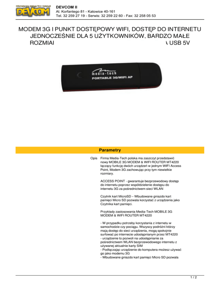 DEVCOM II Al. Korfantego 81 - Katowice 40-161 Tel. 32 259 27 19 - Serwis: 32 259 22 60 - Fax: 32 258 05 53 MODEM 3G I PUNKT DOSTĘPOWY WIFI, DOSTĘP DO INTERNETU JEDNOCZEŚNIE DLA 5 UŻYTKOWNIKÓW, BARDZO MAŁE ROZMIARY, ZASILANIE Z DOWOLNEGO GNIAZDA USB 5V Parametry Opis Firma Media-Tech polska ma zaszczyt przedstawić nowy MOBILE 3G MODEM & WIFI ROUTER MT4220 łączący funkcję dwóch urządzeń w jednym WIFI Access Point, Modem 3G zachowując przy tym niewielkie rozmiary. ACCESS POINT - gwarantuje bezprzewodowy dostęp do internetu poprzez współdzielenie dostępu do internetu 3G za pośrednictwem sieci WLAN Czytnik kart MicroSD – Wbudowane gniazdo kart pamięci Micro SD pozwala korzystać z urządzenia jako Czytnika kart pamięci. Przykłady zastosowania Media-Tech MOBILE 3G MODEM & WIFI ROUTER MT4220 - W przypadku potrzeby korzystania z internetu w samochodzie czy pociągu. Wszyscy podróżni którzy mają dostęp do sieci urządzenia, mogą spokojnie surfować po internecie udostępnianym przez MT4220 - urządzenie to pozwoli na udostępnianie za pośrednictwem WLAN bezprzewodowego internetu z używanej aktualnie karty SIM - Podłączając urządzenie do komputera możesz używać go jako modemu 3G - Wbudowane gniazdo kart pamięci Micro SD pozwala 1/2 DEVCOM II Al. Korfantego 81 - Katowice 40-161 Tel. 32 259 27 19 - Serwis: 32 259 22 60 - Fax: 32 258 05 53 korzystać z urządzenia jako Czytnika kart pamięci. Interfejs Sieć GSM Sieć UMTS Sieć LTE Karta SIM Czytnik kart pamięci Standard pamięci SD / CF Obsługa sieci Aero2 Obsługiwane systemy operacyjne Obsługiwane systemy operacyjne Obsługiwane systemy operacyjne Obsługiwane systemy operacyjne Obsługiwane systemy operacyjne Obsługiwane systemy operacyjne Zasilanie USB Brak danych Brak danych Brak danych Brak danych microSD Brak danych Brak danych Windows 7 Windows Vista Windows 8 Mac OS Android Windows 8.1 USB Kolor Czarny Waga 21 Wymiary 86x27x10mm 2/2 Powered by TCPDF (www.tcpdf.org)