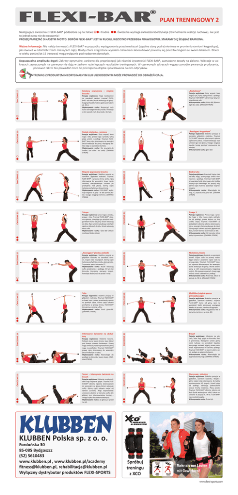 PLAN TRENINGOWY 2 Następujące ćwiczenia z FLEXI-BAR® podzielone są na: łatwe i trudne . Ćwiczenia wymaga zwłaszcza koordynacja (równomierne reakcje ruchowe), nie jest to jednak rzecz nie do nauczenia! PROSZĘ PAMIĘTAĆ O NASZYM MOTTO: DOPÓKI FLEXI-BAR® JEST W RUCHU, WSZYSTKO PRZEBIEGA PRAWIDŁOWO. STARAMY SIĘ ŚCIĄGAĆ RAMIONA. Ważne informacje: Nie należy trenować z FLEXI-BAR® w przypadku występowania przeciwwskazań (zapalne stany podrażnieniowe w promieniu ramion i kręgosłupa), jak również w ostatnich trzech miesiącach ciąży. Osoby chore i zagrożone wysokim ciśnieniem skonsultować powinny się przed treningiem ze swoim lekarzem. Dzieci w wieku poniżej lat 15 trenować mogą wyłącznie pod nadzorem dorosłych. Pozycja wyjściowa: Ułożenie na plecach, obie nogi najpierw zgięte. Trzymać FLEXI-BAR® obiema rękoma skierowanymi do wewnątrz za głową (kciuk wskazuje sufit). Górną część tułowia zwijać od ramion (crunch). Nogi wyprostować uniesione ukośnie w kierunku sufitu (im głębiej, tym intensywniejszy trening – uwaga! tylko dla zaawansowanych). Wykonywanie ruchu: Za głową w przód i w tył. ĆWICZENIE 18 Teaser – intensywne ćwiczenie na brzuch Pozycja wyjściowa: Ułożenie boczne. Położyć się na lewej stronie, lewy łokieć pod lewym stawem barkowym. Prawą nogę umieścić przed wyprostowaną lewą nogą na podłodze. Trzymać FLEXI-BAR® prawą ręką skierowaną do wewnątrz (kciuk wskazuje na udo). Wykonywanie ruchu: Równolegle do podłogi (w kierunku lewej stopy). [ZMIANA STRON] ĆWICZENIE 20 ĆWICZENIE 29 Intensywne ćwiczenie na abduktory Pozycja wyjściowa: Stabilna pozycja w głębokim rozkroku. Trzymać FLEXI-BAR® w lewej ręce, prawe przedramię oparte na prawym udzie. Górna część tułowia pochylona w prawą stronę. FLEXI-BAR® kierujemy w stronę sufitu. Wykonywanie ruchu: Ruch góra-dół. [ZMIANA STRON] ĆWICZENIE 22 ĆWICZENIE 27 Talia Pozycja wyjściowa: Stabilna pozycja w głębokim rozkroku na szerokość ramion. Ciężar ciała na piętach. Górną część tułowia pochylić do przodu, plecy proste. Trzymanie: patrz ćwiczenie 17. Wykonywanie ruchu: Kciuki wskazują sufit, przedramię – podłogę. W tym też kierunku kierujemy pierwszy impuls. Powstaje skośny ruch w przód i w tył. ĆWICZENIE 24 ĆWICZENIE 25 „Rozciągacz” pleców, pośladki Pozycja wyjściowa: Lewa noga z przodu, prawa z tyłu. Trzymać FLEXI-BAR® obiema rękoma, chwytając go prostymi nadgarstkami luźno od góry, kciuki wskazują do dołu. Ręce unieść nad głową i odchylić zgięte w łokciach do tyłu. Kciuki wskazują teraz sufit. Wykonywanie ruchu: Góra-dół (łokcie możliwie blisko siebie). Biodra-talia Triceps 2 ĆWICZENIE 26 ĆWICZENIE 23 Triceps Pozycja wyjściowa: Stabilna pozycja w szerokim, głębokim rozkroku. Trzymać FLEXI-BAR® z prawej strony jedną ręką skierowaną do wewnątrz. Lewe ramię unosimy zdecydowanym ruchem po przekątnej nad głowę. Górną część tułowia pochylamy w lewą stronę. Wykonywanie ruchu: FLEXI-BAR® wykonuje drgania w górę i w dół poniżej kolan. Uwaga: ściągnąć ramiona. [ZMIANA STRON] „Rozciągacz kręgosłupa” Abduktory, biodra ĆWICZENIE 28 ĆWICZENIE 21 Mięsnie poprzeczne brzucha Pozycja wyjściowa: Duży wypad, lewa noga z tyłu, prawa noga z przodu, tylną piętę unieść z podłogi. Trzymać FLEXIBAR® lewą ręką skierowaną na zewnątrz (kciuk wskazuje do góry), wyciągnąć daleko rękę na wysokości barków. Wykonywanie ruchu: Na zewnątrz-do środka. (od ciała i do ciała). [ZMIANA STRON] Multifidus (mięśnie pasma przyśrodkowego) ĆWICZENIE 30 ĆWICZENIE 19 Stożek rotatorów - ramiona Pozycja wyjściowa: Nogi rozstawione na szerokość ramion, trzymać FLEXIBAR® od dołu (kciuki wskazują do góry). Ściągnąć łopatki, łokcie zgięte pod kątem ok. 90 st. Wykonywanie ruchu: Rozpocząć ruch luźno od nadgarstka do przodu. Powstaje w ten sposób ruch do przodu i do tyłu. „Rozluźniacz” Brzuch ĆWICZENIE 32 ĆWICZENIE 17 Rotatory zewnętrzne – mięśnie brzucha ĆWICZENIE 31 Dopuszczalna amplituda drgań: Zakresy optymalne, zarówno dla propriocepcji jak również żywotności FLEXI-BAR®, zaznaczone zostały na zielono. Wibracje w zakresach zaznaczonych na czerwono nie dają w żadnym razie lepszych rezultatów treningowych. W czerwonych zakresach wygasa ponadto gwarancja producenta, ponieważ zakres ten prowadzić może do przeciążenia drążka i powstawania na nim odprysków. TRENING Z PRODUKTEM NIEORYGINALNYM LUB USZKODZONYM MOŻE PROWADZIĆ DO OBRAŻEŃ CIAŁA. Równowaga - abduktory Pozycja wyjściowa: Stabilna pozycja w głębokim, szerokim rozkroku. Rzepki i górne części stóp skierowane do kątów pomieszczenia (45 stopni). Unieść pięty od podłogi, obniżając jednocześnie jeszcze trochę miednicę. Plecy proste. Trzymać FLEXI-BAR® obiema rękoma od dołu (kciuk wskazuje na sufit). Łokcie ustawione w pozycji ok. 90 st. FLEXI-BAR® na wysokości pępka. Wykonywanie ruchu: Przód-tył. Pozycja wyjściowa: Duży wypad, lewa noga z tyłu, tylną piętę unieść z podłogi. Trzymać FLEXI-BAR® luźno lewą ręką, kciuk wskazuje udo. Wykonywanie ruchu: Góra-dół (Równolegle do uda). [ZMIANA STRON] Pozycja wyjściowa: Stabilna pozycja w szerokim, głębokim rozkroku. Trzymać FLEXI-BAR® dwoma splecionymi rękoma (splecione palce), i rozprostowując ręce umieścić go nad głową. Uwaga: ściągnąć łopatki, brodę pochylić nieznacznie do mostka. Wykonywanie ruchu: góra-dół. Pozycja wyjściowa: Przenieść ciężar ciała na lewą nogę, prawą nogę unieść nieznacznie z podłogi. Trzymać FLEXI-BAR® prawą ręką, kciuk skierowany do środka. Pozycja rąk równoległa do pozycji nóg. Górna część tułowia pozostaje wyprostowana. Wykonywanie ruchu: Równolegle do nogi, tj. poprzecznie góra-dół. [ZMIANA STRON] Pozycja wyjściowa: Prawa noga z przodu, lewa z tyłu. Lewa pięta odchylona od p
