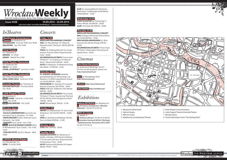 WrocławWeekly ALIBI (ul. Grunwaldzka 67) Alestorm, Brainstorm, Troldhaugen (Folk/Metal: 70/60/50PLN) - 19:00 Free City Guide to Events, Music, Film, Theatre, Museum & More Wednesday 24.09 Issue #438 STARY KLASZTOR (ul. Purkyniego 1) Vołosi (World: 30/20PLN) - 20:00 ALIBI I Am Giant (65/55PLN) - 20:00 19.09.2014 - 25.09.2014 > get more online: www.WroclawWeekly.pl > [email protected] InTheatres Współczesny (Contemporary) Theatre (ul. Rzeźnicza 12) Paternoster - Fri & Sat 19:00; Sun 18:00 Walentina - Tue-Thu 19:00 Polski Theatre (ul. Zapolskiej 3) Kronos - Fri 19:00 Dziady - Wed & Thu 17:00 Polski Theatre / Kameralna (ul. Świdnicka 28) Smycz - Fri 19:00 Stand_Up Witkacy - Sat & Sun 19:00 Polski Theatre / Świebodzki (pl. Orląt Lwowskich 20c) Hans, Dora i Wilk - Sat & Sun 19:00 Komedia Theatre (pl. Teatralny 4) Szalone Nożyczki - Fri & Sat 20:00; Sun 18:00 Lalek (Puppet) Theatre (pl. Teatralny 4) Kids Plama - Sat & Sun 12:00; Wed 10:00; Thu 10:30 Kids Krzywiryjek - Thu 10:00 Concerts Friday 19.09 WROCŁAW PHILHARMONIC CONCERT HALL (ul. Piłsudskiego 19) “Opera & Operetta Gala" (Classical: 100/50/20PLN) - 19:00 FIRLEJ (ul. Grabiszyńska 56) Yul, Green Asylum, Krossen Other (Experimental: Free) - 20:00 OD ZMIERZCHU DO ŚWITU (“From Dusk Till Dawn" / ul. Krupnicza 15) Nternal Quiet / Nevermind (10PLN) - 20:00 ALIVE (ul. Kolejowa 12) Redroom & Dogbite (Rock: 15/10PLN) - 21:00 Saturday 20.09 ST. VINCENT CATHEDRAL (Katedra greckokatolicka św. Wincentego / pl. Nankiera 15) NFM Leopoldinum (Classical: 50/30/20PLN) - 18:00 OSSOLINEUM (ul. Szewska 37) LutosAir Quartet (Classical: 20/10PLN) - 18:00 FIRLEJ YOB (US), Pallbearer (US) (Metal: 60PLN) - 20:00 OD ZMIERZCHU DO ŚWITU (“From Dusk Till Dawn") Thesis, Sounds Like The End Of The World, Atme (Progressive Rock: 10PLN) - 20:00 ALIVE Ditroit (Rock: 10PLN) - 21:00 Wrocław Opera Sunday 21.09 (ul. Świdnicka 35) “Łucja z Lammermooru (Lucia di Lammermoor)" by G. Donizetti - Fri 19:00 “Napój miłosny (L’Elisir d’Amore)" by G. Donizetti - Sat 19:00 “Traviata" by G. Verdi - Sun 17:00 Kids “Alicja w Krainie Czarów (Alice in Wonderland)" by R. Chauls - Tue 11:00, 13:00 “Cosi Fan Tutte" by W.A. Mozart - Wed 19:00 IMPART (ul. Mazowiecka 17) Jesse Cook (Flamenco: 155/125/95/70PLN) - 16:00, 19:30 ETER (ul. Kazimierza Wielkiego 19) Gus Gus Live Band (95PLN) - 21:00 CAPITOL Musical Theatre (ul. Piłsudskiego 72) Dżob - Fri & Sat 19:00 Monday 22.09 Thursday 25.09 WROCŁAW PHILHARMONIC CONCERT HALL Grzegorz Niemczuk (Piano/Classical: 50/30/20PLN) - 19:00 BWA GALERIA AWANGARDA (ul. Wita Stwosza 32) Johnny Chang (15PLN) 20:00 OD ZMIERZCHU DO ŚWITU (“From Dusk Till Dawn") Aleksandra Tomczyszyn & Squad (Free) - 20:00 Cinemas Kino Nowe Horyzonty 4 pl. Jana Pawła II (ul. Kazimierza Wielkiego 19a-21) For the current program, please see http://www.kinonh.pl/ 2 8 DCF (ul. Piłsudskiego 64/a) http://dcf.wroclaw.pl/ 1 HELIOS http://www.heliosnet.pl MULTIKINO http://multikino.pl/ 7 Exhibitions 3 5 6 Galeria ENTROPIA (ul. Rzeźnicza 4) > “Archiwum Zoologiczne / Wiesław Rakowski “ (05.09.14-22.09.14) WRO Art Center (ul. Widok 7) > “Zielony Labirynt" (01.09.14-21.09.14) > Jarosław Czarnecki & Elvin Flamingo “Symbiotyczność Tworzenia 2012-2034" (21.09.14-10.10.14) 1. 2. 3. 4. Mleczarnia Café & Hostel Galeria Entropia WRO Art Center Współczesny (Contemporary) Theatre 5. 6. 7. 8. Polski Theatre: Scena Kameralna Lalek (Puppet) Theatre & Komedia Theatre Wrocław Opera Tourist Information Centre "The Meeting Point" ETER DKB (120PLN) - 20:00 Tuesday 23.09 GALERIA ENTROPIA (ul. Rzeźnicza 4) [audio_entropia_019] Smutne Kobiety “I’m too sad to tell you" (Experimental/ Performance: Free) - 18:00 ALIVE Soulwound & Bonhart & Fosgen (Metal: 7PLN) - 19:00 Contact: Wrocław Tourist Information Center, Rynek 14, 50-101 Wrocław, tel. (+48 71) 344 31 11 9 ©WrocławWeekly 2014, Some Rights Reserved CC [BY-NC-ND] // [email protected]
