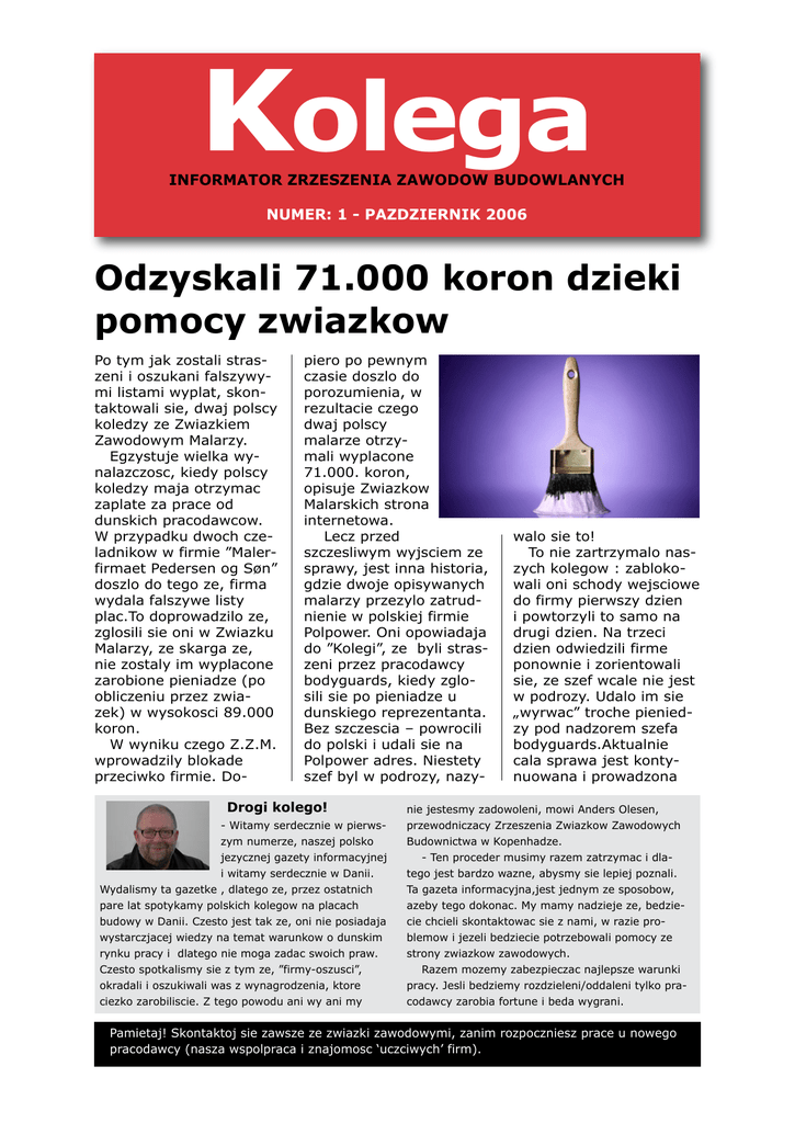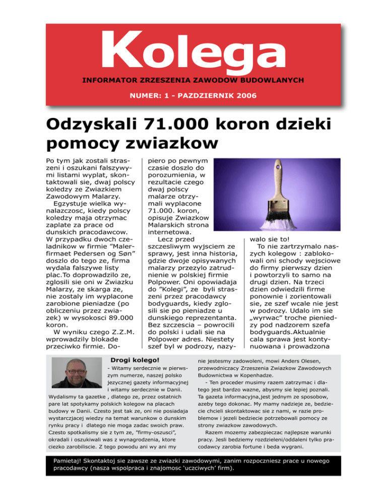 Kolega INFORMATOR ZRZESZENIA ZAWODOW BUDOWLANYCH NUMER: 1 - PAZDZIERNIK 2006 Odzyskali 71.000 koron dzieki pomocy zwiazkow Po tym jak zostali straszeni i oszukani falszywymi listami wyplat, skontaktowali sie, dwaj polscy koledzy ze Zwiazkiem Zawodowym Malarzy. Egzystuje wielka wynalazczosc, kiedy polscy koledzy maja otrzymac zaplate za prace od dunskich pracodawcow. W przypadku dwoch czeladnikow w firmie ”Malerfirmaet Pedersen og Søn” doszlo do tego ze, firma wydala falszywe listy plac.To doprowadzilo ze, zglosili sie oni w Zwiazku Malarzy, ze skarga ze, nie zostaly im wyplacone zarobione pieniadze (po obliczeniu przez zwiazek) w wysokosci 89.000 koron. W wyniku czego Z.Z.M. wprowadzily blokade przeciwko firmie. Do- piero po pewnym czasie doszlo do porozumienia, w rezultacie czego dwaj polscy malarze otrzymali wyplacone 71.000. koron, opisuje Zwiazkow Malarskich strona internetowa. Lecz przed szczesliwym wyjsciem ze sprawy, jest inna historia, gdzie dwoje opisywanych malarzy przezylo zatrudnienie w polskiej firmie Polpower. Oni opowiadaja do ”Kolegi”, ze byli straszeni przez pracodawcy bodyguards, kiedy zglosili sie po pieniadze u dunskiego reprezentanta. Bez szczescia – powrocili do polski i udali sie na Polpower adres. Niestety szef byl w podrozy, nazy- Drogi kolego! - Witamy serdecznie w pierwszym numerze, naszej polsko jezycznej gazety informacyjnej i witamy serdecznie w Danii. Wydalismy ta gazetke , dlatego ze, przez ostatnich pare lat spotykamy polskich kolegow na placach budowy w Danii. Czesto jest tak ze, oni nie posiadaja wystarczjacej wiedzy na temat warunkow o dunskim rynku pracy i dlatego nie moga zadac swoich praw. Czesto spotkalismy sie z tym ze, ”firmy-oszusci”, okradali i oszukiwali was z wynagrodzenia, ktore ciezko zarobiliscie. Z tego powodu ani wy ani my walo sie to! To nie zartrzymalo naszych kolegow : zablokowali oni schody wejsciowe do firmy pierwszy dzien i powtorzyli to samo na drugi dzien. Na trzeci dzien odwiedzili firme ponownie i zorientowali sie, ze szef wcale nie jest w podrozy. Udalo im sie „wyrwac” troche pieniedzy pod nadzorem szefa bodyguards.Aktualnie cala sprawa jest kontynuowana i prowadzona nie jestesmy zadowoleni, mowi Anders Olesen, przewodniczacy Zrzeszenia Zwiazkow Zawodowych Budownictwa w Kopenhadze. - Ten proceder musimy razem zatrzymac i dlatego jest bardzo wazne, abysmy sie lepiej poznali. Ta gazeta informacyjna,jest jednym ze sposobow, azeby tego dokonac. My mamy nadzieje ze, bedziecie chcieli skontaktowac sie z nami, w razie problemow i jezeli bedziecie potrzebowali pomocy ze strony zwiazkow zawodowych. Razem mozemy zabezpieczac najlepsze warunki pracy. Jesli bedziemy rozdzieleni/oddaleni tylko pracodawcy zarobia fortune i beda wygrani. Pamietaj! Skontaktoj sie zawsze ze zwiazki zawodowymi, zanim rozpoczniesz prace u nowego pracodawcy (nasza wspolpraca i znajomosc ‘uczciwych’ firm). przez Zwiazek Murarzy, ktory skierowal sprawe do Sadu Pracy. Pozniej wrocili do Danii i rozpoczeli prace w Malerfifmaet Pedersen & Søn. Niestety tutaj przezycia nie byly lepsze. Obietnice o 104 kr, zostaly zmienione na a`conto wyplaty po 60 koron.Reszty mogli szukac jak wiatru w polu. Malarzy strona internetowa – www. Malerneshus.dk – informuje, ze ci dwaj czeladnicy musieli pracowac 10 – 12 godzin dziennie. Do „Kolegi„ mowia oni , ze przepracowali 526 godzin w firmie, lecz otrzymali tylko za to, falszywe listy plac.To bylo za duzo i dlatego skontaktowali sie ze Z.Z. Tutaj zapewnily im zwiazki nowa prace i zaczeto pracowac nad sprawa i sciagnieciu pieniedzy od Pedersen & Søn. Wklad ktory, zapewnil czeladnikom wiekszosc splaty pieniedzy. Zwiazek Malarzy powiadamia, ze coraz wiecej polskich malarzy z nowych panstw Unii Europejskiej przystepuje do Zwiazkow Zawodowych. Dzialalnosc i spotkania z firmami „oszustami „otworzylo oczy na to, azeby organizowac sie w zwiazkach. Na dzien dzisiejszy Zwiazek Malarzy ma 120 czlonkow z Europy wschodniej. Zrzeszenie Zwiazkow Zawodowych Budownictwa - Jest to zrzeszenie 11 zwiazkow ”Rubryka bezpieczenstwa na miejscu pracy” Bezpieczenstwo i higiena pracy na budowach jest regulowane przez ustawodawstwo. Inspekcja pracy, Zwiazki Zawodowe i partnerzy/strony na budowie kontroluja aby, ustawodawstwo bylo przestrzegane. Jesli jest 5 pracownikow albo wiecej, na waszym miejscu pracy macie obowiazek wybrac reprezentanta bezpieczenstwa, ktory uczestniczy w spotkaniach bezpieczenstwa i higieny pracy z kierownictwem budowy. Odpowiedzialnosc za przestrzeganie ustawodawstwa spoczywa na pracodawcy. Jesli masz podejrzenie ze, warunki pracy nie sa w porzadku, mozna sie skontaktowac ze zwiazkami. Jesli mowimy o powaznych i niebezpiecznych brakach, mozna skontaktowac sie z Inspekcja Pracy (Arbejdstilsynet) pod telefonem: 70 12 12 88. Jesli warunki pracy, sa niebezpieczne masz prawo do nie wykonania lub kontynuowania pracy do czasu zanim warunki beda uregulowane. Jesli zatrzy- masz prace, musisz o tym poinformowac pracodawce , azeby on mogl zaproponowac prace w innym miejscu, w czasie czekania. Czas czekania musi oplacac pracodawca wedlug zwyczajnej oplaty za prace i nie wolno ciebie zwolnic z pracy z powodu zaprzestania pracy w niebezpiecznych warunkach. Kilka przykladow z ustawy o bezpieczenstwie i higienie pracy: • Zawsze trzeba uzywac bezpiecznego obuwia w pracy na budowie. • Za obuwie zawsze placi pracodawca. • Jesli wydazy sie szkoda lub wypadek na miejscu pracy, pracodawca musi zameldowac szkode do wlasciwych instancji.Osoba poszkodowana musi otrzymac kopie zameldowan , jako gwarancja ze, dokonano zameldowania. • Jest zakazane i zwiazane z kara pieniezna, zmiany lub ustawianie rusztowan, ktore sa wyzsze niz 3 metry, jesli nie posiada sie specjalnego wyksztalcenia. Z pozdrowieniami Freddy Ridderhaugen Sekretarz bezp. i higieny pracy Pytania i odpowiedzi o zwiazkach: Czy Zwiazki Zawodowe pomaga mi znalesc prace ,jak zostane bez pracy? ”Tak, jesli jestes czlonkiem zwiazku,mozesz otrzymac pomoc po