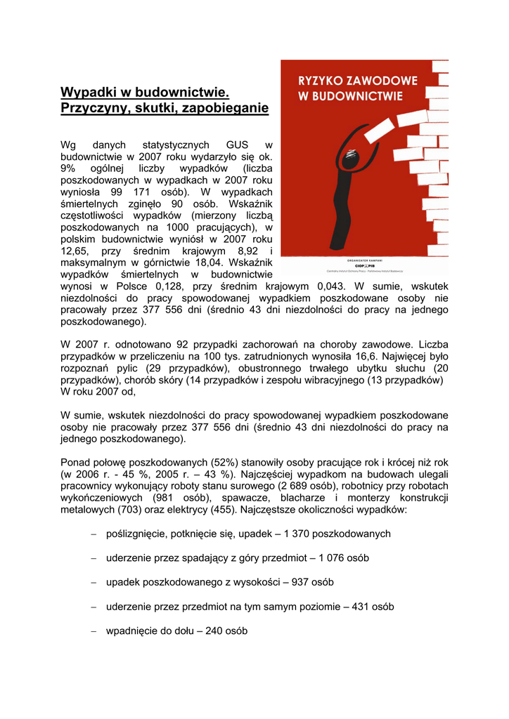 Wypadki w budownictwie. Przyczyny, skutki, zapobieganie Wg danych statystycznych GUS w budownictwie w 2007 roku wydarzyło się ok. 9% ogólnej liczby wypadków (liczba poszkodowanych w wypadkach w 2007 roku wyniosła 99 171 osób). W wypadkach śmiertelnych zginęło 90 osób. Wskaźnik częstotliwości wypadków (mierzony liczbą poszkodowanych na 1000 pracujących), w polskim budownictwie wyniósł w 2007 roku 12,65, przy średnim krajowym 8,92 i maksymalnym w górnictwie 18,04. Wskaźnik wypadków śmiertelnych w budownictwie wynosi w Polsce 0,128, przy średnim krajowym 0,043. W sumie, wskutek niezdolności do pracy spowodowanej wypadkiem poszkodowane osoby nie pracowały przez 377 556 dni (średnio 43 dni niezdolności do pracy na jednego poszkodowanego). W 2007 r. odnotowano 92 przypadki zachorowań na choroby zawodowe. Liczba przypadków w przeliczeniu na 100 tys. zatrudnionych wynosiła 16,6. Najwięcej było rozpoznań pylic (29 przypadków), obustronnego trwałego ubytku słuchu (20 przypadków), chorób skóry (14 przypadków i zespołu wibracyjnego (13 przypadków) W roku 2007 od, W sumie, wskutek niezdolności do pracy spowodowanej wypadkiem poszkodowane osoby nie pracowały przez 377 556 dni (średnio 43 dni niezdolności do pracy na jednego poszkodowanego). Ponad połowę poszkodowanych (52%) stanowiły osoby pracujące rok i krócej niż rok (w 2006 r. - 45 %, 2005 r. – 43 %). Najczęściej wypadkom na budowach ulegali pracownicy wykonujący roboty stanu surowego (2 689 osób), robotnicy przy robotach wykończeniowych (981 osób), spawacze, blacharze i monterzy konstrukcji metalowych (703) oraz elektrycy (455). Najczęstsze okoliczności wypadków: − poślizgnięcie, potknięcie się, upadek – 1 370 poszkodowanych − uderzenie przez spadający z góry przedmiot – 1 076 osób − upadek poszkodowanego z wysokości – 937 osób − uderzenie przez przedmiot na tym samym poziomie – 431 osób − wpadnięcie do dołu – 240 osób Państwowa Inspekcja Pracy („Wypadki przy pracy w budownictwie w 2007 r. Informacja prasowa, Państwowa Inspekcja Pracy 2008) jako najczęstsze przyczyny wypadków, wymienia: − organizacyjne (brak nadzoru, dopuszczanie do pracy bez przygotowania, tolerowanie odstępstw od przepisów i zasad bezpieczeństwa pracy) 44,3% wypadków − ludzkie tj. wynikające ze stanu psychofizycznego i zachowań człowieka (lekceważenie zagrożenia i nieznajomość zagrożenia, niestosowanie sprzętu ochronnego, w tym urządzeń zabezpieczających i środków ochrony indywidualnej) - 43,2 % − techniczne, związane ze stanem technicznym sprzętu roboczego i zastosowanych przy nim środków ochronnych - 12,5 %. Wyniki prac prowadzonych w Centralnym Instytucie Ochrony Pracy – Państwowym Instytucie Badawczym [2-3.] wskazują, że oprócz wymienionych istnieją inne czynniki i okoliczności powstawania wypadków. Do nich należą między innymi: 1) wykonywanie na budowach prac bez odpowiednich środków ochrony zbiorowej. Dotyczy to zwłaszcza braku: − balustrad ochronnych lub siatek ochronnych, szalunków w wykopach, pokryw w podłożu, − daszków ochronnych w miejscach, w których mogą spadać z góry przedmioty i materiały budowlane, w tym na wózkach jezdniowych i innych środkach transportu, − odgradzania stref niebezpiecznych wokół pracujących maszyn, − zabezpieczenia placu budowy przed dostępem dla osób postronnych, − 2) oznakowań miejsc niebezpiecznych, w tym widocznych ostrzegawczych (także oświetlonych nocą, np. przy wykopach). znaków stosowanie niezgodnych z przepisami oraz nieprzystosowanych wykonywanych prac środków transportu oraz maszyn i urządzeń. do Przyczyną wypadków jest: − użytkowanie maszyn i urządzeń: niedopuszczonych do pracy (np.: przez UDT) i bez osłon elementów ruchomych, a także ich stosowanie niezgodnie z przeznaczeniem, bez należytego dostosowania do wykonywanych prac, − nieprzestrzeganie wymaganych terminów konserwacji, napraw, przeglądów oraz kontroli maszyn, środków transportu i urządzeń (np. drabin, rusztowań), a także niezgodne z przepisami i zasadami ich użytkowanie przez pracowników. 3) niewłaściwe wykonanie i konserwacja instalacji i urządzeń elektrycznych. Prowadzi to ni tylko do wypadków powodujących porażenie prądem elektrycznych, lecz także np. upadków z wysokości (związanych z rażeniem prądem elektrycznym). 4) niewłaściwa organizacja pracy. Wypadki w tej grupie są związane ze stosowaniem niewłaściwych: − metod pracy (np. brakiem pracownika kontrolującego przebieg pracy, koordynatora lub kierującego operacją (wydającego polecenia grupie) w trakcie ręcznego transportu zbiorowego), − środków pracy (np.: stosowaniem drabin niezgodnie z przeznaczeniem, stosowaniem prowizorycznych rusztowań), − technologii (np.: nie zachowaniem wymaganej technologicznie przerwy w postępie robót ze względu na niezbędną wytrzymałość betonu lub ustabilizowanie kostki brukowej, opóźnieniem wykonywania zabezpieczenia ścian w stosunku do postępu kopania wykopu), pośpiechem związanym z odpracowywaniem przestojów, − lokalizacją stanowisk pracy (np.: w strefie klina odłamu gruntu), a także wykonywaniem prac bez projektów organizacji robót (w tym projektu prowadzenia robót ziemnych). 5) nieodpowiednie kompetencje personelu w zakresie bhp do nadzorowania i wykonywania prac budowlanych. Dotyczy to niekompetentnych osób kierujących budowami, braku wstępnych i okresowych szkoleń w zakresie bhp, a także prowadzenie szkoleń przez osoby niekompetentne. Wypadki są również powodowane zatrudnianiem do określonych prac osób, mimo przeciwwskazań lekarskich. 6) wykonywanie prac na otwartym terenie. Może to powodować dodatkowe zagrożenia przez czynniki, takie jak: mokre i śliskie od deszczu lub śniegu (także oblodzone) powierzchnie i konstrukcje budowlane, ograniczoną widoczność (praca w trudnych warunkach atmosferycznych lub po 