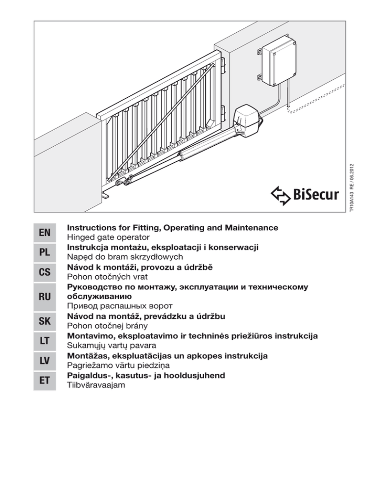TR10A143 RE / 06.2012 EN PL CS RU SK LT LV ET Instructions for Fitting, Operating and Maintenance Hinged gate operator Instrukcja montażu, eksploatacji i konserwacji Napęd do bram skrzydłowych Návod k montáži, provozu a údržbě Pohon otočných vrat Руководство по монтажу, эксплуатации и техническому обслуживанию Привод распашных ворот Návod na montáž, prevádzku a údržbu Pohon otočnej brány Montavimo, eksploatavimo ir techninės priežiūros instrukcija Sukamųjų vartų pavara Montāžas, ekspluatācijas un apkopes instrukcija Pagriežamo vārtu piedziņa Paigaldus-, kasutus- ja hooldusjuhend Tiibväravaajam 2 TR10A143 RE / 06.2012 ENGLISH . . . . . . . . . . . . . . . . . . . . . . . . . . 4 POLSKI . . . . . . . . . . . . . . . . . . . . . . . . . . 27 ČESKY . . . . . . . . . . . . . . . . . . . . . . . . . . 52 РУССКИЙ . . . . . . . . . . . . . . . . . . . . . . . . 75 SLOVENSKY . . . . . . . . . . . . . . . . . . . . . 103 LIETUVIŲ KALBA . . . . . . . . . . . . . . . . . 126 LATVIEŠU VALODA . . . . . . . . . . . . . . . 149 EESTI . . . . . . . . . . . . . . . . . . . . . . . . . . 173 . . . . . . . . . . . . . . . . . . . . . . 196 TR10A143 RE / 06.2012 3 ENGLISH Table of Contents A Articles supplied...................................................... 2 B Tools needed for assembly..................................... 2 1 1.1 1.2 1.3 1.4 1.5 About These Instructions........................................ 5 Further applicable documents................................... 5 Warnings used........................................................... 5 Definitions used......................................................... 5 Symbols and abbreviations used.............................. 5 Abbreviations used.................................................... 6 2 2.1 2.2 2.3 2.4 2.9 Safety Instructions........................................... 6 Intended use.............................................................. 6 Inappropriate use....................................................... 6 Fitter qualification...................................................... 6 Safety instructions for fitting, maintenance, repairs and disassembly of the gate system............. 6 Safety instructions for fitting...................................... 6 Safety instructions for initial start-up and for operation.................................................................... 6 Safety instructions for using the hand transmitter..... 7 Safety instructions for inspection and maintenance....................................................... 7 Approved safety equipment...................................... 7 3 3.1 3.2 3.3 3.4 3.5 Fitting........................................................................ 7 Preparation for fitting................................................. 7 Fitting the gate operator............................................ 7 Fitting the operator control........................................ 9 Mains voltage............................................................. 9 Connecting the operators.......................................... 9 4 Initial Start-Up of Basic Equipment, Gate System Recording the CLOSE End-of-Travel Position via the Limit Switch (Factory Setting)........................................ 10 Single-leaf gate system........................................... 10 Double-leaf gate system.......................................... 11 2.5 2.6 2.7 2.8 4.1 4.2 5 5.1 5.2 8 8.1 8.2 Radio....................................................................... 19 Hand transmitter HS 4 BiSecur............................... 20 Radio receiver.......................................................... 21 9 9.1 9.2 9.3 9.4 9.5 Operation................................................................ 22 Instructing users...................................................... 22 Normal operation..................................................... 22 Reversing during an opening run............................. 22 Reversing during a closing run................................ 22 Behaviour during a power failure (without emergency battery).................................... 22 Behaviour following a power failure (without emergency battery).................................... 22 Disengaging without a power failure....................... 22 Factory reset............................................................ 22 Operation, error and warning messages................. 22 Error acknowledgement........................................... 23 9.6 9.7 9.8 9.9 9.10 10 Inspection and Maintenance................................ 23 11 Optional Accessories............................................ 24 12 Dismantling and Disposal..................................... 24 13 13.1 Warranty Conditions.............................................. 24 Performance............................................................ 24 14 Excerpt from the Declaration of Incorporation..................................................... 24 15 Technical Data........................................................ 25 16 Overview of DIL Switch Functions....................... 26 Illustrated section...................................... 196 Initial Start-Up of Basic Equipment, Gate System Recording the CLOSE End-of-Travel Position via Mechanical End Stops or an Electric Lock.............................. 13 Single-leaf gate system........................................... 13 Double-leaf gate system.......................................... 13 6 6.1 6.2 6.3 6.4 Gate systems that open outwards....................... 15 Connecting the operators........................................ 15 Using end stops....................................................... 15 Using limit switches................................................. 15 Teaching in the end-of-travel positions and forces..............................