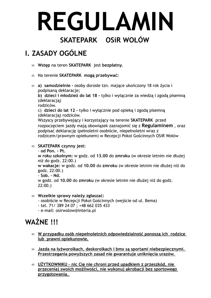SKATEPARK OSiR WOŁÓW I. ZASADY OGÓLNE WAŻNE !!!
