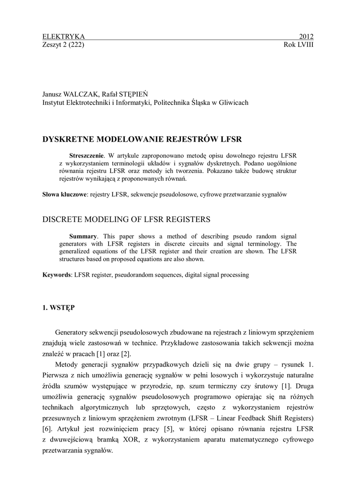 ELEKTRYKA Zeszyt 2 (222) 2012 Rok LVIII Janusz WALCZAK, Rafał STĘPIEŃ Instytut Elektrotechniki i Informatyki, Politechnika Śląska w Gliwicach DYSKRETNE MODELOWANIE REJESTRÓW LFSR Streszczenie. W artykule zaproponowano metodę opisu dowolnego rejestru LFSR z wykorzystaniem terminologii układów i sygnałów dyskretnych. Podano uogólnione równania rejestru LFSR oraz metody ich tworzenia. Pokazano także budowę struktur rejestrów wynikającą z proponowanych równań. Słowa kluczowe: rejestry LFSR, sekwencje pseudolosowe, cyfrowe przetwarzanie sygnałów DISCRETE MODELING OF LFSR REGISTERS Summary. This paper shows a method of describing pseudo random signal generators with LFSR registers in discrete circuits and signal terminology. The generalized equations of the LFSR register and their creation are shown. The LFSR structures based on proposed equations are also shown. Keywords: LFSR register, pseudorandom sequences, digital signal processing 1. WSTĘP Generatory sekwencji pseudolosowych zbudowane na rejestrach z liniowym sprzężeniem znajdują wiele zastosowań w technice. Przykładowe zastosowania takich sekwencji można znaleźć w pracach [1] oraz [2]. Metody generacji sygnałów przypadkowych dzieli się na dwie grupy – rysunek 1. Pierwsza z nich umożliwia generację sygnałów w pełni losowych i wykorzystuje naturalne źródła szumów występujące w przyrodzie, np. szum termiczny czy śrutowy [1]. Druga umożliwia generację sygnałów pseudolosowych programowo opierając się na różnych technikach algorytmicznych lub sprzętowych, często z wykorzystaniem rejestrów przesuwnych z liniowym sprzężeniem zwrotnym (LFSR – Linear Feedback Shift Registers) [6]. Artykuł jest rozwinięciem pracy [5], w której opisano równania rejestru LFSR z dwuwejściową bramką XOR, z wykorzystaniem aparatu matematycznego cyfrowego przetwarzania sygnałów. 98 J. Walczak, R. Stępień Rys. 1. Źródła sygnałów losowych Fig. 1. The random signal sources 2. GENERATORY Z REJESTRAMI LFSR Generator sygnału pseudolosowego składa się z następujących bloków: a) liniowego rejestru przesuwnego o długości N z możliwością ustawienia wartości początkowej, b) bloku sprzężenia zwrotnego, c) generatora sygnału zegarowego, d) ewentualnego przetwornika cyfrowo-analogowego zamieniającego ciąg bitów (bądź liczb zawartych w rejestrze) na sygnał analogowy. Na rysunku 1 zaznaczono bloki a –c. Dyskretne modelowanie rejestrów LFSR… 99 Rys. 2. Typowy rejestr LFSR Fig. 2. A typical LFSR register Sygnał wyjściowy generatora jest określany stanem jednego z bitów rejestru, np. najmniej znaczącego bitu, por. rys. 2. Sygnał ten jest zawsze okresowy. Maksymalna długość sekwencji wyjściowej wynosi [1]: l 2N 1 (1) gdzie: N – rząd rejestru, l – długość sekwencji wyjściowej. Jeśli długość sekwencji wyjściowej jest równa długości maksymalnej (1), to taką sekwencję nazywa się m sekwencją. W pracy [5] opisano metodę modelowania dyskretnego generatorów pseudolosowych wykorzystujących rejestry LFSR. Modelowanie to dotyczyło rejestru z dwuwejściową bramką XOR pełniącą funkcję sprzężenia zwrotnego. Wielomiany opisujące funkcję sprzężenia zwrotnego są w tym przypadku trójmianami pierwotnymi modulo 2. W większości przypadków trójmiany pierwotne umożliwiają wygenerowanie m sekwencji. Istnieją przypadki generatorów LFSR, na przykład o długości 8 czy 12 [7], które nie mają trójmianów pierwotnych modulo 2, co uniemożliwia wygenerowanie m sekwencji. Z przeglądu wielomianów pierwotnych [2], [4], [7] wynika, że wykorzystanie do opisu rejestrów LFSR wielomianu modulo 2 w postaci: L( x ) x a x b x c x d 1 , (2) oraz trójmianów pierwotnych modulo 2: L( x ) x a x b 1 , (3) umożliwia stworzenie dyskretnego opisu każdego rejestru LFSR. Elementem sprzężenia zwrotnego w przypadku wielomianu (2) jest czterowejściowa bramka XOR. 100 J. Walczak, R. Stępień 3. UOGÓLNIONY DYSKRETNY MODEL GENERATORA Do opisu pracy generatora pseudolosowego zbudowanego na bazie rejestrów LFSR wykorzystano terminologię układów dyskretnych. Model dyskretny powstaje poprzez znalezienie dyskretnych równań różnicowych układu generatora. Równania te dotyczą samego rejestru przesuwnego oraz bloku sprzężenia zwrotnego, który jest realizowany poprzez bramkę XOR. Z punktu widzenia przetwarzania sygnałów rejestr przesuwny o długości N jest elementem opóźniającym o N próbek (potrzeba N cykli zegarowych, aby próbka wyjściowa x[n] bloku XOR przeszła przez cały rejestr). Opis matematyczny takiej sekwencji jest następujący: y[n] x[n N ] (4) Sam rejestr (bez bloku sprzężenia zwrotnego) może zostać opisany za pomocą równania (4). Do stworzenia pełnego opisu rejestru LFSR potrzeba także opisu matematycznego bramki XOR. Stosując opis matematyczny używany w cyfrowym przetwarzaniu sygnałów, otrzymuje się dla dwuwejściowej bramki XOR równanie wyjścia [5]: x[n] x[n i] x[n j ] 2 x[n i ]x[n j ] (5) gdzie: i, j numery odczepów rejestru LFSR służące do realizacji sprzężenia zwrotnego, x[n] – sygnał wyjściowy bramki XOR. Chcąc uogólnić opis matematyczny na rejestry o dowolnej długości N, należy zauważyć, że niektóre długości (N=12,13) nie posiadają wielomianów pierwotnych, utworzonych z dwóch odczepów, umożliwiających wygenerowanie m sekwencji. Dlatego dla pełnego opisu należy uwzględnić inną konfigurację sprzężenia zwrotnego. Dokonując przeglądu wielomianów pierwotnych, można zauważyć, że dla długości N>4 do N=786 [7], [8] wszystkie kolejne rejestry rzędu N=5,6,7…..786 umożliwiają generację m-sekwencji z wykorzystaniem czterech odczepów. Istnieją także dłuższe rejestry (N>786) [8], które mają konfigurację z czterema odczepami i umożliwiają generację m sekwencji, ale ich stosowanie nie jest już praktyczne, ze względu na olbrzymie długości generowanych sekwencji oraz trudn