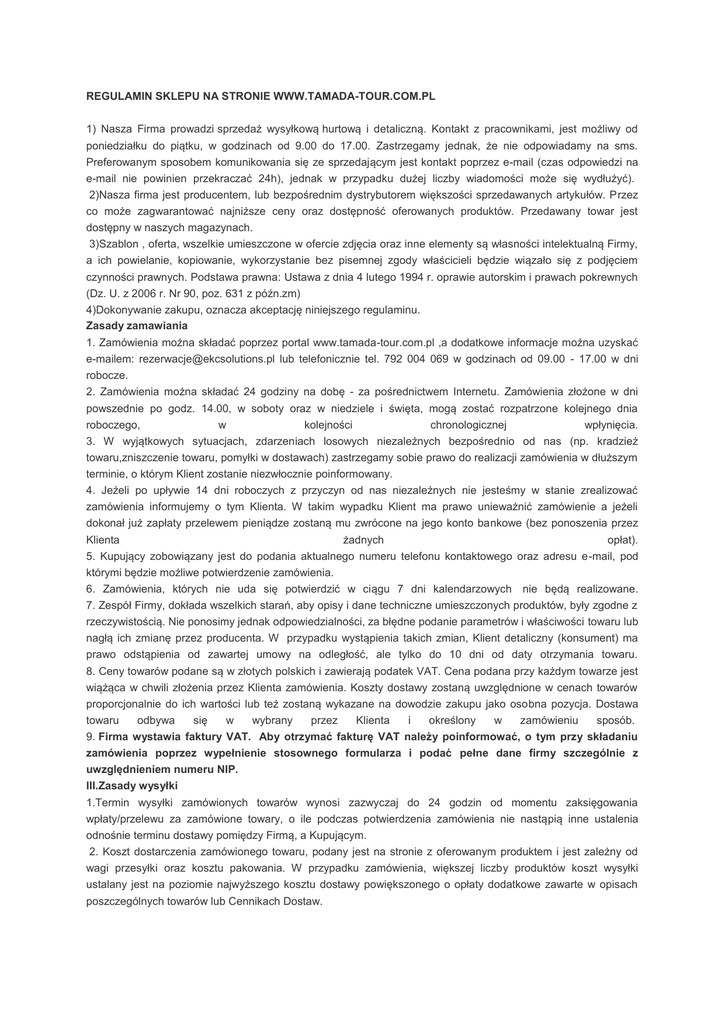 REGULAMIN SKLEPU NA STRONIE WWW.TAMADA