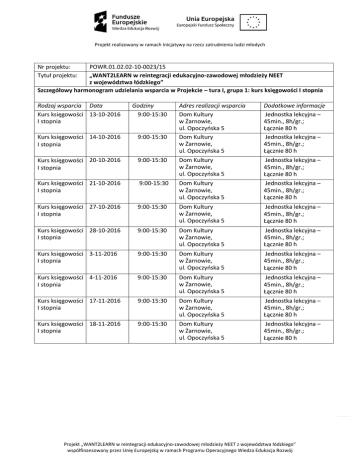 Projekt realizowany w ramach Inicjatywy na rzecz zatrudnienia ludzi młodych Nr projektu: Tytuł projektu: POWR.01.02.02-10-0023/15 „WANT2LEARN w reintegracji edukacyjno-zawodowej młodzieży NEET z województwa łódzkiego” Szczegółowy harmonogram udzielania wsparcia w Projekcie – tura I, grupa 1: kurs księgowości I stopnia Rodzaj wsparcia Data Kurs księgowości 13-10-2016 I stopnia Godziny 9:00-15:30 Adres realizacji wsparcia Dom Kultury w Żarnowie, ul. Opoczyoska 5 Dom Kultury w Żarnowie, ul. Opoczyoska 5 Dodatkowe informacje Jednostka lekcyjna – 45min., 8h/gr.; Łącznie 80 h Jednostka lekcyjna – 45min., 8h/gr.; Łącznie 80 h Kurs księgowości 14-10-2016 I stopnia 9:00-15:30 Kurs księgowości 20-10-2016 I stopnia 9:00-15:30 Dom Kultury w Żarnowie, ul. Opoczyoska 5 Kurs księgowości 21-10-2016 I stopnia 9:00-15:30 Dom Kultury w Żarnowie, ul. Opoczyoska 5 Jednostka lekcyjna – 45min., 8h/gr.; Łącznie 80 h Jednostka lekcyjna – 45min., 8h/gr.; Łącznie 80 h Kurs księgowości 27-10-2016 I stopnia 9:00-15:30 Dom Kultury w Żarnowie, ul. Opoczyoska 5 Jednostka lekcyjna – 45min., 8h/gr.; Łącznie 80 h Kurs księgowości 28-10-2016 I stopnia 9:00-15:30 Dom Kultury w Żarnowie, ul. Opoczyoska 5 Jednostka lekcyjna – 45min., 8h/gr.; Łącznie 80 h Kurs księgowości 3-11-2016 I stopnia 9:00-15:30 Dom Kultury w Żarnowie, ul. Opoczyoska 5 Jednostka lekcyjna – 45min., 8h/gr.; Łącznie 80 h Kurs księgowości 4-11-2016 I stopnia 9:00-15:30 Dom Kultury w Żarnowie, ul. Opoczyoska 5 Jednostka lekcyjna – 45min., 8h/gr.; Łącznie 80 h Kurs księgowości 17-11-2016 I stopnia 9:00-15:30 Dom Kultury w Żarnowie, ul. Opoczyoska 5 Jednostka lekcyjna – 45min., 8h/gr.; Łącznie 80 h Kurs księgowości 18-11-2016 I stopnia 9:00-15:30 Dom Kultury w Żarnowie, ul. Opoczyoska 5 Jednostka lekcyjna – 45min., 8h/gr.; Łącznie 80 h Projekt „WANT2LEARN w reintegracji edukacyjno-zawodowej młodzieży NEET z województwa łódzkiego” współfinansowany przez Unię Europejską w ramach Programu Operacyjnego Wiedza Edukacja Rozwój