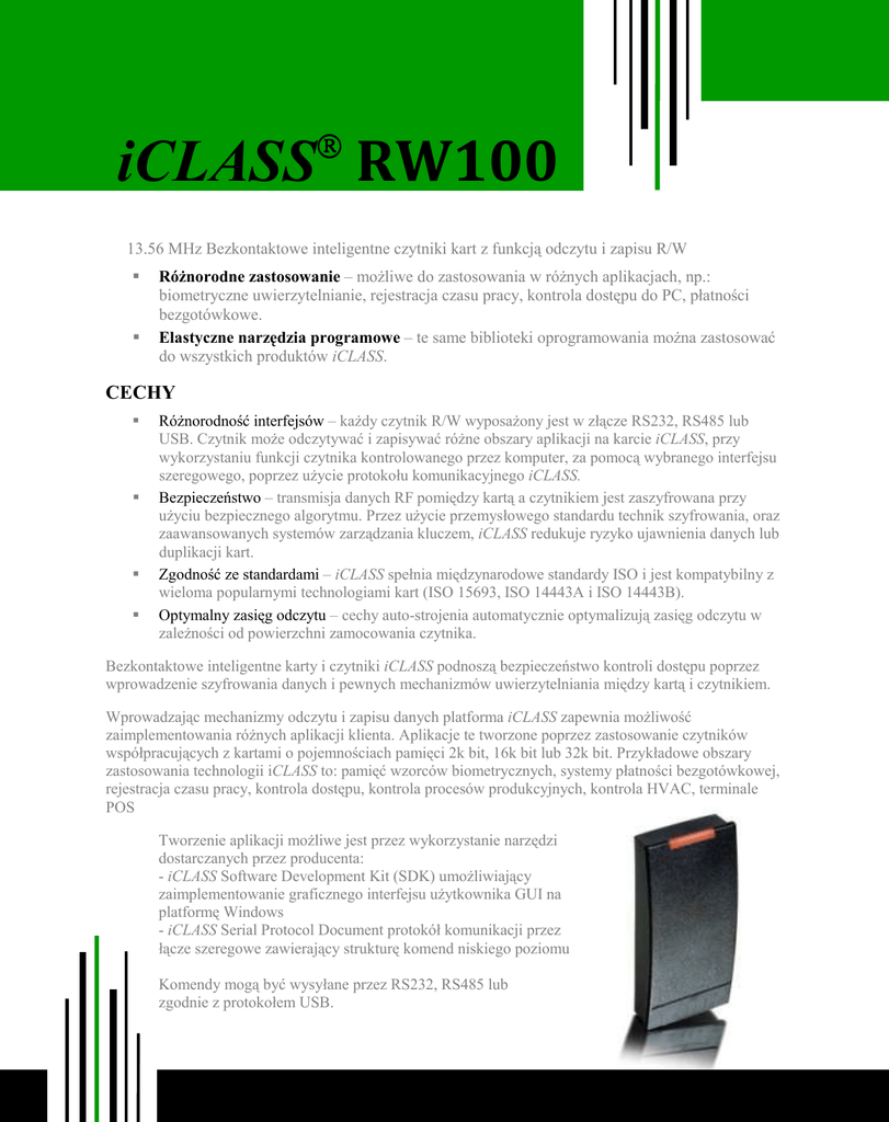 iCLASS RW100 13.56 MHz Bezkontaktowe inteligentne czytniki kart z funkcją odczytu i zapisu R/W RóŜnorodne zastosowanie – moŜliwe do zastosowania w róŜnych aplikacjach, np.: biometryczne uwierzytelnianie, rejestracja czasu pracy, kontrola dostępu do PC, płatności bezgotówkowe. Elastyczne narzędzia programowe – te same biblioteki oprogramowania moŜna zastosować do wszystkich produktów iCLASS. CECHY RóŜnorodność interfejsów – kaŜdy czytnik R/W wyposaŜony jest w złącze RS232, RS485 lub USB. Czytnik moŜe odczytywać i zapisywać róŜne obszary aplikacji na karcie iCLASS, przy wykorzystaniu funkcji czytnika kontrolowanego przez komputer, za pomocą wybranego interfejsu szeregowego, poprzez uŜycie protokołu komunikacyjnego iCLASS. Bezpieczeństwo – transmisja danych RF pomiędzy kartą a czytnikiem jest zaszyfrowana przy uŜyciu bezpiecznego algorytmu. Przez uŜycie przemysłowego standardu technik szyfrowania, oraz zaawansowanych systemów zarządzania kluczem, iCLASS redukuje ryzyko ujawnienia danych lub duplikacji kart. Zgodność ze standardami – iCLASS spełnia międzynarodowe standardy ISO i jest kompatybilny z wieloma popularnymi technologiami kart (ISO 15693, ISO 14443A i ISO 14443B). Optymalny zasięg odczytu – cechy auto-strojenia automatycznie optymalizują zasięg odczytu w zaleŜności od powierzchni zamocowania czytnika. Bezkontaktowe inteligentne karty i czytniki iCLASS podnoszą bezpieczeństwo kontroli dostępu poprzez wprowadzenie szyfrowania danych i pewnych mechanizmów uwierzytelniania między kartą i czytnikiem. Wprowadzając mechanizmy odczytu i zapisu danych platforma iCLASS zapewnia moŜliwość zaimplementowania róŜnych aplikacji klienta. Aplikacje te tworzone poprzez zastosowanie czytników współpracujących z kartami o pojemnościach pamięci 2k bit, 16k bit lub 32k bit. Przykładowe obszary zastosowania technologii iCLASS to: pamięć wzorców biometrycznych, systemy płatności bezgotówkowej, rejestracja czasu pracy, kontrola dostępu, kontrola procesów produkcyjnych, kontrola HVAC, terminale POS Tworzenie aplikacji moŜliwe jest przez wykorzystanie narzędzi dostarczanych przez producenta: - iCLASS Software Development Kit (SDK) umoŜliwiający zaimplementowanie graficznego interfejsu uŜytkownika GUI na platformę Windows - iCLASS Serial Protocol Document protokół komunikacji przez łącze szeregowe zawierający strukturę komend niskiego poziomu Komendy mogą być wysyłane przez RS232, RS485 lub zgodnie z protokołem USB. Bezpieczeństwo Konfiguracja Interfejs Charakterystyka Specyfikacja techniczna Szyfrowanie transmisji danych pomiędzy kartą a czytnikiem z zastosowaniem zaawansowanych algorytmów kryptograficznych. 64-bitowe klucze uwierzytelniające. Bezpieczny system zarządzania kluczami redukuje ryzyko ujawnienia danych. Maksymalny zasięg odczytu Technologia iCLASS pozwala na pełne skonfigurowanie czytników na etapie ich produkcji. W takim przypadku odpowiedzialność za bezpieczeństwo zarządzania kluczami oraz ich unikalność leŜy po stronie producenta. UŜytkownicy końcowi i integratorzy systemów mogą zaprogramować i zabezpieczać własne, niestandardowe klucze oraz kodować i szyfrować spersonalizowane dane na poszczególnych kartach za pomocą programatora kart iCLASS CP400. Programator równieŜ umoŜliwia szyfrowanie algorytmem DES i Triple-DES Program iCLASS Elite pozwala uŜytkownikom końcowym na stosowanie ich własnego formatu 35bitowego. Format ten obejmuje kod identyfikacyjny firmy unikalny dla kaŜdego uŜytkownika końcowego. Współpraca ze wszystkimi systemami kontroli dostępu korzystającymi z protokołu Wieganda. Istnieje moŜliwość konfiguracji czytnika pozwalającej na odczyt 26-bitowych, 32-bitowych, 34-bitowych lub 40-bitowych numerów seryjnych MIFARE. Karty iCLASS – 7.6cm (3.25”) Key iCLASS – 3.8cm (1.5”) Tag iCLASS – 3.8cm (1.5”) MIFARE/DESFire – 5.0cm (2”) Model: 6101 Częstotliwość 13.56 MHz Wymiary 4.83 x 10.26 x 2.03cm Materiał: Poliwęglan UL 94 Zasilanie 5V – 16V DC (zalecane liniowe źródło zasilania) Prąd wymagany 12V DC – 50/75 mA Temperatura pracy -40°C – 65°C Wilgotność względna pracy 5% – 95 % bez kondensacji Masa: 90.7 g Moduły komunikacji RS232, RS485, USB lub UART Kompatybilność kart Czytnik RW100 jest kompatybilny z wszystkimi kartami iCLASS. Jego uniwersalność pozwala na obsługę technologii spełniających standardy ISO 14443A (MIFARE) i 15693. Certyfikaty UL294/cUL, FCC, CE Długość kabla Montaż Łatwy w montaŜu trzyczęściowy czytnik zgodny ze standardami puszek elektrycznych na całym świecie. Wąska obudowa idealna do montaŜu na profilach stolarki budowlanej lub innych miejscach o małej powierzchni. Obudowa Wykonanie czytnika gwarantuje odporność urządzenia na warunki atmosferyczne i zniszczenie a ciekawe wzornictwo pozwala na jego dopasowanie do specyfiki wnętrza. Opcje Interfejs Wiegand: 150m Zalecany kabel to 22 AWG pięcioŜyłowy ekranowany lub równorzędny - kolor: szary, czarny - zarządzanie kluczami - moŜliwość konfiguracji wyjścia dla kart MIFARE - kabel przyłączeniowy 0.5m - programowalny sposób działania diody i beeper’a VEMCO Sp. z o.o. ul. Broniewskiego 3 81 – 837 Sopot T +48 58 550 75 65 F +48 58 550 75 66 www.vemco.pl
