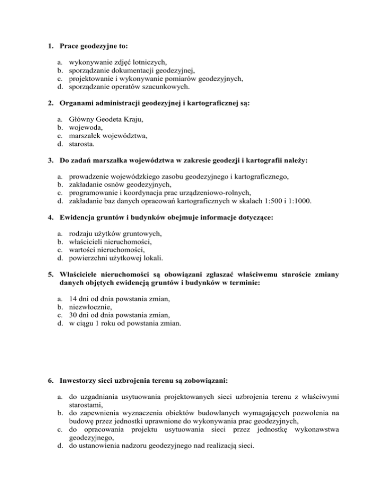 1. Prace geodezyjne to: a. b. c. d. wykonywanie zdjęć lotniczych, sporządzanie dokumentacji geodezyjnej, projektowanie i wykonywanie pomiarów geodezyjnych, sporządzanie operatów szacunkowych. 2. Organami administracji geodezyjnej i kartograficznej są: a. b. c. d. Główny Geodeta Kraju, wojewoda, marszałek województwa, starosta. 3. Do zadań marszałka województwa w zakresie geodezji i kartografii należy: a. b. c. d. prowadzenie wojewódzkiego zasobu geodezyjnego i kartograficznego, zakładanie osnów geodezyjnych, programowanie i koordynacja prac urządzeniowo-rolnych, zakładanie baz danych opracowań kartograficznych w skalach 1:500 i 1:1000. 4. Ewidencja gruntów i budynków obejmuje informacje dotyczące: a. b. c. d. rodzaju użytków gruntowych, właścicieli nieruchomości, wartości nieruchomości, powierzchni użytkowej lokali. 5. Właściciele nieruchomości są obowiązani zgłaszać właściwemu staroście zmiany danych objętych ewidencją gruntów i budynków w terminie: a. b. c. d. 14 dni od dnia powstania zmian, niezwłocznie, 30 dni od dnia powstania zmian, w ciągu 1 roku od powstania zmian. 6. Inwestorzy sieci uzbrojenia terenu są zobowiązani: a. do uzgadniania usytuowania projektowanych sieci uzbrojenia terenu z właściwymi starostami, b. do zapewnienia wyznaczenia obiektów budowlanych wymagających pozwolenia na budowę przez jednostki uprawnione do wykonywania prac geodezyjnych, c. do opracowania projektu usytuowania sieci przez jednostkę wykonawstwa geodezyjnego, d. do ustanowienia nadzoru geodezyjnego nad realizacją sieci. 7. Wezwania do stawienia się na gruncie celem udziału w rozgraniczeniu nieruchomości doręcza się stronom za zwrotnym poświadczeniem odbioru: a. b. c. d. nie później niż 7 dni przed wyznaczonym terminem, na 14 dni przed terminem, przed terminem przeprowadzenia czynności rozgraniczeniowych, w ciągu 30 dni od postanowienia o wszczęciu postępowania rozgraniczeniowego. 8. Nadzór nad prowadzeniem powiatowego zasobu geodezyjnego i kartograficznego należy do: a. b. c. d. starosty, Głównego Geodety Kraju, marszałka województwa, wojewódzkiego inspektora nadzoru geodezyjnego i kartograficznego. 9. Uprawnienia zawodowe w dziedzinie geodezji kartografii mogą uzyskać osoby które: a. posiadają 3 lata praktyki zawodowej w przypadku wykształcenia geodezyjnego średniego, b. ukończyły 18 lat, c. wykażą się znajomością przepisów w dziedzinie geodezji i kartografii, d. nie były karane za przestępstwo skarbowe. 10. Postępowanie wszczyna się: a. b. c. d. kwalifikacyjne, dotyczące uzyskania uprawnień zawodowych z dniem przekazania wniosku do komisji kwalifikacyjnej, z dniem wskazanym na wniosku zainteresowanego, z dniem wpływu do Głównego Urzędu Geodezji i Kartografii, z dniem sprawdzenia kompletności dokumentów załączonych do wniosku. 11. Osobom wpisanym do centralnego rejestru osób posiadających uprawnienia zawodowe, które ze swej winy naruszyły przepisy zawarte w art. 42 ust. 3, prawa geodezyjnego można: a. odebrać uprawnienia zawodowe, b. odebrać uprawnienia zawodowe, dopuszczając możliwość ubiegania się o ponowne ich uzyskanie po upływie 3 lat od dnia ich odebrania, c. udzielić ustnej nagany, d. udzielić upomnienia. 12. Osoby, które wykonują samodzielne funkcje w dziedzinie geodezji i kartografii bez wymaganych uprawnień zawodowych: a. b. c. d. są zobowiązane do uzyskania uprawnień w ciągu 1 roku, są zobowiązane do zakończenia działalności gospodarczej, podlegają karze grzywny, podlegają karze skarbowej. 13. Prawa majątkowe do programu komputerowego stworzonego przez pracownika w ramach obowiązków wynikających ze stosunku pracy przysługują: a. b. c. d. pracodawcy, ogółowi pracowników zakładu pracy, pracownikowi, który stworzył program, pracodawcy i pracownikowi w częściach równych. 14. Zgodnie z Konstytucją Rzeczpospolita Polska chroni: a. b. c. d. prawo własności, prawa rzeczowe ograniczone, służebności gruntowe, prawo dziedziczenia. 15. Źródłami powszechnie obowiązującego prawa są: a. b. c. d. Konstytucja Rzeczypospolitej Polskiej, ustawy, uchwały Rady Ministrów, zarządzenia Głównego Geodety Kraju. 16. Samorząd województwa: a. b. c. d. sprawuje nadzór nad działalnością powiatów, wykonuje zadania określone przez marszałków województwa, wykonuje zadania określone przez właściwego wojewodę, dysponuje mieniem wojewódzkim. 17. Plany miejscowe opracowuje się w skalach: a. b. c. d. 1:1000, 1:500 w szczególnie uzasadnionych przypadkach, 1:250, 1:5000 w celu przeznaczenia gruntów do zasiedzenia. 18. Jeżeli, w związku z uchwaleniem planu miejscowego korzystanie z nieruchomości stało się niemożliwe właściciel może żądać od gminy: a. b. c. d. przekazania na własność nieruchomości zamiennej, zmiany planu miejscowego, odszkodowania za poniesioną szkodę, wykupienia nieruchomości. 19. Decyzje o ustaleniu lokalizacji inwestycji celu publicznego o znaczeniu krajowym i wojewódzkim wydaje: a. b. c. d. marszałek województwa, wójt (burmistrz, prezydent miasta) w uzgodnieniu z marszałkiem województwa, wójt (burmistrz, prezydent miasta), wójt (burmistrz, prezydent miasta) w uzgodnieniu z wojewodą. 20. Decyzja o warunkach zabudowy: a. b. c. d. nie rodzi praw do terenu, nie narusza ustaleń planu miejscowego, nie narusza uprawnień osób trzecich, nie rodzi praw do odszkodowania. 21. Kierownik jednostki organizacyjnej, w której przetwarzane są informacje niejawne o klauzuli „tajne” lub „ściśle tajne”, zobowiązany jest do: a. b. c. d. zatrudnienie kierownika kancelarii tajnej, zorganizowania ochrony budynku, w którym przetwarzane są informacje niejawne, zabezpieczenia lokali, w których przetwarzane są dane, utworzenia „kancelarii tajnej”. 22. Dział trzeci księgi wieczystej przeznaczony jest na wpisy dotyczące: a. b. c. d. władającego nieruchomością, ograniczonych praw rzeczowych, z wyjątkie