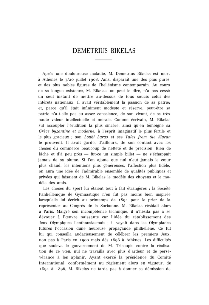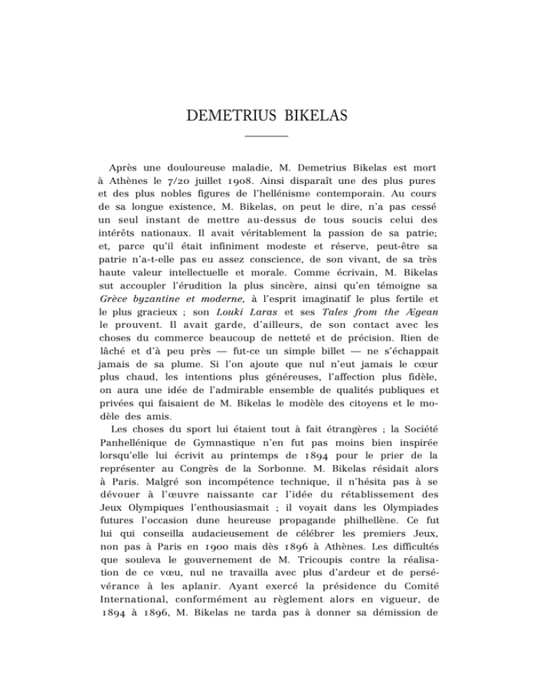 DEMETRIUS BIKELAS Après une douloureuse maladie, M. Demetrius Bikelas est mort à Athènes le 7/20 juillet 1908. Ainsi disparaît une des plus pures et des plus nobles figures de l’hellénisme contemporain. Au cours de sa longue existence, M. Bikelas, on peut le dire, n’a pas cessé un seul instant de mettre au-dessus de tous soucis celui des intérêts nationaux. Il avait véritablement la passion de sa patrie; et, parce qu’il était infiniment modeste et réserve, peut-être sa patrie n’a-t-elle pas eu assez conscience, de son vivant, de sa très haute valeur intellectuelle et morale. Comme écrivain, M. Bikelas sut accoupler l’érudition la plus sincère, ainsi qu’en témoigne sa Grèce byzantine et moderne, à l’esprit imaginatif le plus fertile et le plus gracieux ; son Louki Laras et ses Tales from the Ægean le prouvent. Il avait garde, d’ailleurs, de son contact avec les choses du commerce beaucoup de netteté et de précision. Rien de lâché et d’à peu près — fut-ce un simple billet — ne s’échappait jamais de sa plume. Si l’on ajoute que nul n’eut jamais le cœur plus chaud, les intentions plus généreuses, l’affection plus fidèle, on aura une idée de l’admirable ensemble de qualités publiques et privées qui faisaient de M. Bikelas le modèle des citoyens et le modèle des amis. Les choses du sport lui étaient tout à fait étrangères ; la Société Panhellénique de Gymnastique n’en fut pas moins bien inspirée lorsqu’elle lui écrivit au printemps de 1894 pour le prier de la représenter au Congrès de la Sorbonne. M. Bikelas résidait alors à Paris. Malgré son incompétence technique, il n’hésita pas à se dévouer à l’œuvre naissante car l’idée du rétablissement des Jeux Olympiques l’enthousiasmait ; il voyait dans les Olympiades futures l’occasion dune heureuse propagande philhellène. Ce fut lui qui conseilla audacieusement de célébrer les premiers Jeux, non pas à Paris en 1900 mais dès 1896 à Athènes. Les difficultés que souleva le gouvernement de M. Tricoupis contre la réalisation de ce vœu, nul ne travailla avec plus d’ardeur et de persévérance à les aplanir. Ayant exercé la présidence du Comité International, conformément au règlement alors en vigueur, de 1894 à 1896, M. Bikelas ne tarda pas à donner sa démission de 132 REVUE OLYMPIQUE membre pour la Grèce. Il fut remplacé par le comte Mercati. La guerre contre la Turquie lui avait porté un coup cruel. Il abandonna dès lors son logis parisien et s’installa définitivement à Athènes, anxieux de consacrer ses efforts à l’œuvre de vulgarisation et d’éducation populaires qu’il jugeait urgent de fonder. Son intelligence et son zèle s’y employèrent de la plus utile manière. En 1905, M. Bikelas accepta de représenter l’Université d’Athènes au Congres de Bruxelles oh ses anciens collègues furent heureux de le retrouver, toujours souriant, gracieux et dévoue. Ils ne devaient plus le revoir mais nul d’entre eux n’oubliera le charme de son commerce. La vie lui fut dure ; une épreuve terrible tomba sur son foyer alors qu’il venait de le fonder en plein bonheur et la solitude du cœur pesa ainsi sur lui tout le long de sa carrière. Il accueillit l’infortune avec le calme volontaire de la philosophie antique double de la résignation pieuse du véritable chrétien. Ainsi il incarnait cet hellénisme dont il n’avait cessé de pratiquer le culte et qui se réclame à la fois de la sagesse païenne et des vertus chrétiennes. PAROLES SAGES ET PAROLES FOLLES Les athlètes américains ayant pris part aux Jeux Olympiques ont trouvé dans leur pays un accueil de retour dont ils garderont, certes, un souvenir ensoleillé. Ce n’est pas que. quelques exagérations n’aient été commises çà et là, dont il vaudrait mieux s’abstenir à l’avenir, Après cela, peut-être bien que les journalistes transatlantiques se sont « payé nos têtes » en nous dépeignant le fol enthousiasme de leurs concitoyennes, aspirant à l’honneur d’embrasser les triomphateurs. En tous cas l’idée qui a préside à l’organisation de la fête nous paraît très recommandable. L’hommage rendu s’adresse moins aux exploits accomplis qu’à l’importance de la circonstance même. Il mesure la distance qui sépare