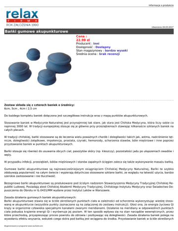Informacje o produkcie Utworzono 04-03-2017 Bańki gumowe akupunkturowe Cena : 22.99 zł Producent : Inni Dostępność : Dostępny Stan magazynowy : bardzo wysoki Średnia ocena : brak recenzji Zestaw składa się z czterech baniek o średnicy: 6cm, 5cm , 4cm i 2,5 cm Do każdego kompletu baniek dołączona jest szczegółowa instrukcja wraz z mapą punktów akupunkturowych. Stosowanie baniek w Medycynie Naturalnej jest przynajmniej tak stare, jak stara jest Chińska Medycyna, która liczy sobie co najmniej 3000 lat. W tradycji europejskiej stosuje się je głównie przy przeziębieniach stawiając kilkanaście szklanych baniek na całych plecach. W tradycji chińskiej, bańki stosowane są do leczenia wielu poważnych chorób i dolegliwości takich jak, astma, nadciśnienie tętnicze, dolegliwości żołądkowe, impotencja, prostata, czyraki, hemoroidy, schorzenia stawów, bóle mięśniowe i inne poprzez przystawianie baniek w punktach akupunkturowych. Bańki stosuje się również do usuwania obcych ciał, pasożytów skóry (np. kleszczy), pozostałości jadu po ukąszeniach owadów i węży. W przypadku infekcji, przeziębień, bólów mięśniowych i stanów zapalnych ścięgien zaleca się także wykonywanie masażu bańką. Gumowe bańki akupunkturowe są najnowocześniejszym osiągnięciem Chińskiej Medycyny Naturalnej, Bańki te szybko zdobywają popularność na całym świecie i wypierają dotychczas stosowane szklane bańki, ze względu na łatwość użycia, bardzo szerokie zastosowanie i nie tłuczliwość. Bezogniowe bańki akupunkturowe są produkowane pod ścisłym nadzorem Stowarzyszenia Medycyny Tradycyjnej Chińskiej Republiki Ludowej. Posiadają atest Chińskiej Akademii Medycyny Tradycyjnej, Chińskiego Instytutu Medycyny oraz Świadectwo Dopuszczenia do Obrotu nr IL-0431/MM wydane przez Instytut Leków w Warszawie. Zasada działania gumowych baniek akupunkturowych: Bańki akupunkturowe stawia się w ściśle określonych punktach ciała w zależności od schorzenia wykorzystując wiedzę stosowaną w akupunkturze (wszystkie punkty zaznaczone są na załączonej do zestawu instrukcji). Głosi ona, że energia życiowa Qi krąży w organizmie człowieka specjalnymi kanałami zwanymi meridianami. Działanie na meridiany w odpowiednich punktach ciała pobudza krążenie energii Qi i wyrównuje jej poziom. W ten sposób wpływa się na stan narządów wewnętrznych, przez które przechodzą, przyspieszając proces powrotu do zdrowia i pozbywając się dolegliwości. Zasada działania baniek polega na wywołaniu efektu wsysania, wskutek czego skóra pod bańką jest wciągana do środka. Przystawianie baniek w ściśle określonych Wygenerowano w programie www.oscGold.com punktach na meridianach powoduje przyspieszenie krążenia i przepływu energii życiowej Qi, krwi i płynów ciała w wybranym meridianie, co inicjuje proces oczyszczania się organizmu ze wszystkich toksyn zarówno przyjętych z pokarmem, jak i powstałych w wyniku wadliwej przemiany materii oraz wytwarzanych przez niszczące organizm bakterie i wirusy. Zalety gumowych baniek akupunkturowych: - zastosowanie elastycznego tworzywa umożliwia przystawienie ich w dowolnym miejscu bez względu na kształt powierzchni ciała (również na stawach). - są łatwe w użyciu; można je przystawiać samemu sobie w dowolnie położonych punktach ciała (nawet na plecach) - można regulować ciśnienie zasysania w zależności od stopnia zgniecenia bańki - przystawianie baniek nie ogranicza możliwości poruszania się, można je np. stosować w pracy, na spacerze.... - są lekkie, nie tłukące, odporne na uderzenia, zgniecenia, co umożliwia stosowanie ich nie tylko w warunkach domowych, ale i podczas wyjazdów turystycznych - charakteryzują się bardzo dużą trwałością materiału zapewniając wieloletnie stosowanie - są łatwe do utrzymania w czystości - myje się je wodą i mydłem - w zestawie znajdują się cztery bańki o różnej wielkości, co pozwala na efektywne stosowanie ich na różnych częściach ciała oraz do leczenia dzieci. - w dołączonej instrukcji wyszczególnione są choroby, w których można pomóc stawiając bańki oraz odpowiadające im punkty akupunkturowe. Stawianie baniek akupunkturowych: Bańki stawiane są na powierzchni skóry w punktach akupunkturowanych zaznaczonych na dołączonych do zestawu obrazkach. Dla każdej z chorób stosuje się po kilka takich punktów. Bańki stawia się na wszystkich punktach symetrycznie bo obu stronach ciała. W zestawie znajdują się tylko 4 bańki, dlatego też przystawia się je kolejno w podanych punktach lub stosuje się kilka zestawów baniek. Aby przystawić bańkę należy ją chwycić oburącz trzymając palcami wskazującymi i środkowymi za dolną krawędź bańki, natomiast kciukami naciskając jej szczyt. Zgniatając bańkę w ten sposób wyciska się powietrze z jej wnętrza. Następnie lekko przyciskając do wybranego miejsca na ciele należy cofnąć palce z krawędzi bańki i zwolnić uścisk kciuków. Duże bańki stawia się na stawach i powierzchniach silnie umięśnionych; mniejsze w punktach wrażliwych oraz u dzieci. Bańki można stawiać co 2-gi dzień na 15 – 20 min. Przebieg kuracji obejmuje 10 zabiegów w jednej serii. Przy schorzeniach przewlekłych stosuje się 7 – dniowe przerwy pomiędzy seriami. Masaż bańką: W przypadku przeziębień oraz grypy i innych infekcji stosuje się masaż pleców bańką. Przed przystąpieniem do zabiegu należy całą powierzchnię masowaną posmarować oliwką. Następnie przystawia się bańkę w okolicy ramienia np. lewego i przesuwa się ją raz przy razie z góry na dół i z dołu do góry masując całą okolicę pleców. Dla osób dorosłych stosuje się największą bańkę w zestawie, dla dzieci bańki odpowiednio mniejsze w zależności od wieku dziecka. Przy dolegliwościach mięśniowych innych części ciała masuje się bolące miejsca w ten sam sposób