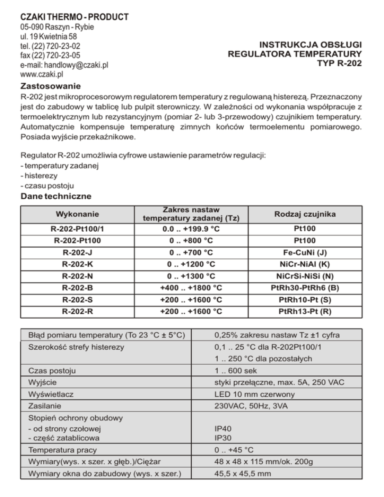 CZAKI THERMO - PRODUCT 05-090 Raszyn - Rybie ul. 19 Kwietnia 58 tel. (22) 720-23-02 fax (22) 720-23-05 e-mail: [email protected] www.czaki.pl Zastosowanie INSTRUKCJA OBSŁUGI REGULATORA TEMPERATURY TYP R-202 R-202 jest mikroprocesorowym regulatorem temperatury z regulowaną histerezą. Przeznaczony jest do zabudowy w tablicę lub pulpit sterowniczy. W zależności od wykonania współpracuje z termoelektrycznym lub rezystancyjnym (pomiar 2- lub 3-przewodowy) czujnikiem temperatury. Automatycznie kompensuje temperaturę zimnych końców termoelementu pomiarowego. Posiada wyjście przekaźnikowe. Regulator R-202 umożliwia cyfrowe ustawienie parametrów regulacji: - temperatury zadanej - histerezy - czasu postoju Dane techniczne R-202-Pt100/1 Zakres nastaw temperatury zadanej (Tz) 0.0 .. +199.9 °C R-202-Pt100 0 .. +800 °C Wykonanie Rodzaj czujnika Pt100 Pt100 R-202-J 0 .. +700 °C Fe-CuNi (J) R-202-K 0 .. +1200 °C NiCr-NiAl (K) R-202-N 0 .. +1300 °C NiCrSi-NiSi (N) R-202-B +400 .. +1800 °C PtRh30-PtRh6 (B) R-202-S +200 .. +1600 °C PtRh10-Pt (S) R-202-R +200 .. +1600 °C PtRh13-Pt (R) Błąd pomiaru temperatury (To 23 °C ± 5°C) 0,25% zakresu nastaw Tz ±1 cyfra Szerokość strefy histerezy 0,1 .. 25 °C dla R-202Pt100/1 1 .. 250 °C dla pozostałych Czas postoju 1 .. 600 sek Wyjście styki przełączne, max. 5A, 250 VAC Wyświetlacz LED 10 mm czerwony Zasilanie 230VAC, 50Hz, 3VA Stopień ochrony obudowy - od strony czołowej - część zatablicowa IP40 IP30 Temperatura pracy 0 .. +45 °C Wymiary(wys. x szer. x głęb.)/Ciężar 48 x 48 x 115 mm/ok. 200g Wymiary okna do zabudowy (wys. x szer.) 45,5 x 45,5 mm Rys.1 Rozmieszczenie elementów funkcjonalnych i schemat podłączeń zasilanie obwodu wyjściowego Panel przedni element wykonawczy (grzałka, cewka stycznika) Panel tylny 7 R 202 8 sygnalizacja programowania histerezy sygnalizacja programowania temperatury zadanej sygnalizacja stanu przekaźnika(praca) ustawianie czasu postoju (programowanie) 9 OUT COM NO NC czujnik temperatury 3 SV bezpiecznik 1 .. 10A klawisz zwiększania wartości 11 2 12 1 Tc Pt100 klawisz zmniejszania wartości klawisz zatwierdzania i wchodzenia w tryb programowania zasilanie regulatora 230 VAC Zasada działania Regulator R-202 jest dwustawnym regulatorem temperatury z histerezą. Elementem wykonawczym jest przekaźnik elektromechaniczny. Regulacja temperatury odbywa się przez zwieranie styków “grzanie” przy temperaturze czujnika (Tc) niższej od temperatury progu dolnego (Td) i rozwieranie styków “przerwanie grzania” przy przekroczeniu temperatury zadanej (Tz). Regulowany czas postoju umożliwia zabezpieczenie elementu wykonawczego (styków przekaźnika) przed zbyt częstym włączaniem. Rys.2 Proces regulacji temperatury temperatura Tz Tc DT Td 10 20 30 40 50 60 70 80 90 100 110 wyjście czas postoju styki 7-8 zwarte styki 7-8 rozwarte 120 czas czas postoju styki 7-8 zwarte styki 7-8 rozwarte styki 7-8 zwarte czas Przykład Regulator R-202-J o zakresie temperatur regulacji 0 .. 700 °C. Nastawy: temperatura zadana (Tz): 350 °C; histereza (DT):2 °C temperatura dolnego progu (Td): 350°C - 2°C=348°C czas postoju: 34 sekundy Programowanie temperatury zadanej (Tz) Nacisnąć i przytrzymać przycisk przez czas ok. 1 sekundy. Zapalenie diody SV sygnalizuje wejście w tryb programowania temperatury zadanej. Wyświetlacz wskazuje aktualną temperaturę zadaną (Tz) w °C. Przy pomocy klawisza lub ustawić żądaną temperaturę zadaną (Tz). Nacisnąć klawisz aby zapamiętać nastawę. Wyświetlacz wskazuje temperaturę bieżącą. Programowanie strefy histerezy (DT) Nacisnąć i przytrzymać przycisk przez czas ok. 3 sekundy. Zapalenie kropki na wyświetlaczu (rys.1) sygnalizuje wejście w tryb programowania strefy histerezy. Wyświetlacz wskazuje aktualną szerokość strefy histerezy w °C. Przy pomocy klawisza lub ustawić żądaną szerokość strefy histerezy. Nacisnąć klawisz aby zapamiętać nastawę. Wyświetlacz wskazuje temperaturę bieżącą. Programowanie czasu postoju. Nacisnąć i przytrzymać przycisk przez czas ok. 8 sekund. Zapalenie diody OUT sygnalizuje wejście w tryb programowania czasu postoju. Wyświetlacz wskazuje aktualną wartość czasu postoju wyrażoną w sekundach. Przy pomocy klawisza lub ustawić żądaną wartość czasu postoju. Nacisnąć klawisz aby zapamiętać nastawę. Komunikaty pojawia się po włączeniu zasilania i informuje o tym, że aktualnie trwa proces wczytywania parametrów pomiarowych i regulacyjnych. Komunikat ten znika po około 10 sekundach i regulator zaczyna wskazywać wartość mierzonej temperatury (Tc). pojawia się przypadku uszkodzenia czujnika lub przekroczenia zakresu pomiarowego pojawia się w momencie kiedy zostaje przekroczona katalogowa temperatura pracy urządzenia, jednocześnie zostaje włączona blokada zapisu do pamięci parametrów regulacji. W przypadku pojawienia się tego komunikatu należy niezwłocznie wyłączyć regulator. Instalowanie regulatora Regulator jest przewidziany do montażu w tablicy za pomocą specjalnych uchwytów mocujących. Przewody czujnika temperatury, zasilania i obwodu wyjściowego przyłączyć według rysunku 1. Końcówki przewodów powinny być pocynowane. Przewody czujnika powinny być prowadzone z dala od źródeł zakłóceń w przeciwnym wypadku muszą być prowadzone w ekranie. Czujnik termoelektryczny należy przyłączyć za pomocą odpowiedniego przewodu kompensacyjnego, natomiast pozostałe przewody powinny być miedziane. Wykaz wyposażenia W skład zestawu regulatora wchodzą: regulator, opornik kontrolny (dla regulatora współpracującego z Pt100), instrukcja obsługi wraz z kartą gwarancyjną. Uwagi Nie przekraczać dopuszczalnego obciążenia styków przekaźnika (5A, 250 VAC). W obwód zasilania włączyć bezpiecznik bezzwłoczny 1 .. 10 A. Nie przekraczać katalogowej temperatury pracy regulatora. Konserwacja i serwis Regulator nie wymaga okresowej konserwacji. W przypa