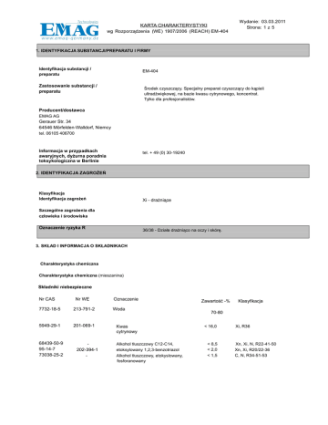 KARTA CHARAKTERYSTYKI wg Rozporządzenia (WE) 1907/2006 (REACH) EM-404 Wydanie: 03.03.2011 Strona: 1 z 5 1. IDENTYFIKACJA SUBSTANCJI/PREPARATU I FIRMY Identyfikacja substancji / preparatu EM-404 Zastosowanie substancji / preparatu Środek czyszczący. Specjalny preparat czyszczący do kąpieli ultradźwiękowej, na bazie kwasu cytrynowego, koncentrat. Tylko dla profesjonalistów. Producent/dostawca EMAG AG Gerauer Str. 34 64546 Mörfelden-Walldorf, Niemcy tel. 06105 406700 Informacja w przypadkach awaryjnych, dyżurna poradnia toksykologiczna w Berlinie tel. + 49 (0) 30-19240 2. IDENTYFIKACJA ZAGROŻEŃ Klasyfikacja Identyfikacja zagrożeń Xi - drażniące Szczególne zagrożenia dla człowieka i środowiska Oznaczenie ryzyka R 36/38 - Działa drażniąco na oczy i skórę. 3. SKŁAD I INFORMACJA O SKŁADNIKACH Charakterystyka chemiczna Charakterystyka chemiczna (mieszanina) Składniki niebezpieczne Nr CAS Nr WE 7732-18-5 213-791-2 5949-29-1 201-069-1 68439-50-9 95-14-7 73038-25-2 202-394-1 - Oznaczenie Woda Kwas cytrynowy Alkohol tłuszczowy C12-C14, etoksylowany 1,2,3-benzotriazol Alkohol tłuszczowy, etokyslowany, fosforanowany Zawartość -% Klasyfikacja 70-80 < 16,0 < 8,5 < 2,0 < 1,5 Xi, R36 Xn, Xi, N, R22-41-50 Xn, Xi, R20/22-36 C, N, R34-51-53 4. PIERWSZA POMOC Wskazówki ogólne Zmienić skażoną odzież. Wdychanie: Kontakt ze skórą Kontakt z oczami Połknięcie Natychmiast zmyć mydłem i dużą ilością wody. Natychmiast płukać obficie wodą co najmniej 15 minut, także pod powieką Natychmiast skonsultować się lekarzem (okulistą). Natychmiast przepłukać usta i wypić dużą ilość wody. Nie wywoływać wymiotów. Skonsultować się z lekarzem. 5. POSTĘPOWANIE W PRZYPADKU POŻARU Właściwe środki gaśnicze Woda, piana, zraszanie wodą. Szczególne zagrożenia ze strony samej substancji lub preparatu, ich produktów spalania lub powstających gazów Podczas pożaru mogą powstawać: Dwutlenek węgla (CO2) i tlenki azotu (NOx), tlenki fosforu. Ubiór ochronny podczas gaszenia ognia Odzież ochronna. Wskazówki dodatkowe Materiał jest niepalny. Środki gaśnicze dostosować do otoczenia. 6. POSTĘPOWANIE W PRZYPADKU NIEZAMIERZONEGO UWOLNIENIENIA DO ŚRODOWISKA Środki ostrożności indywidualne / w zakresie ochrony środowiska Metody oczyszczania Nosić osobistą odzież ochronną. Nie dopuścić do przedostania się do wód powierzchniowych ani kanalizacji. Zebrać wykorzystując materiał wiążący ciecze (np. piasek, tlenek glinu, środki uniwersalne i wiążące kwasy). Z zebranym materiałem postępuje się zgodnie z akapitem o usuwaniu odpadów. 7. POSTĘPOWANIE Z SUBSTANCJĄ I JEJ MAGAZYNOWANIE Postępowanie Wskazówki dotyczące bezpiecznego postępowania Nie wymaga się specjalnych technicznych zabezpieczeń. KARTA CHARAKTERYSTYKI wg Rozporządzenia (WE) 1907/2006 (REACH) EM-404 Wydanie:: 03.03.2011 Strona: 3 z 5 Wskazówki dotyczące ochrony przeciwpożarowej i przeciwwybuchowej Produkt nie podtrzymuje palenia, nie jest łatwopalny ani wybuchowy. Magazynowanie Magazynować tylko w oryginalnym pojemniku. Trzymać z dala od środków żywności, napojów i pasz. LGK 12, ciecze niepalne. Klasa magazynu wg VCI 8. KONTROLA NARAŻENIA I ŚRODKI OCHRONY OSOBISTEJ Ograniczenie i nadzór narażenia w miejscu pracy Patrz rozdział 7. Żadne inne środki nie są wymagane. Środki ochrony i higieny Nie jeść, nie pić, nie palić, nie wciągać powietrza w miejscu pracy. Natychmiast zdjąć zabrudzoną, nasączoną odzież. Przed przerwą i na koniec pracy umyć ręce. Ochrona dróg oddechowych Ochrona dróg oddechowych nie jest konieczna. Właściwe są rękawice z następujących materiałów: Ochrona rąk Materiał CR (polichloropren) NBR (kauczuk/lateks nitrylowy) Butyl (kauczuk butylowy) FKM (kauczuk fluorowy) PVC (polichlorek winylu) Ochrona oczu Ochrona ciała Grubość materiału rękawic 0,5 mm 0,35 mm 0,5 mm 0,4 mm 0,5 mm Czas przełomu (maksymalny czas noszenia) >=4h >=4h >=8h >=8h >=4h Okulary ochronne z osłonami bocznymi Ochrona ciała nie jest wymagana. 9. WŁAŚCIWOŚCI FIZYKOCHEMICZNE Stan skupienia Współczynnik pH (20°C) Temperatura/zakres wrzenia Temperatura topnienia Niebezpieczeństwo wybuchu Ciecz, bezbarwna, klarowna, zapach: charakterystyczny 1,5 (stęż.), 3,0 (1%). + 100°C - 12°C Nie grozi wybuchem Gęstość (20°C) Rozpuszczalność w wodzie 1,07 g / cm³ Całkowicie mieszalny 10.STABILNOŚĆ I REAKTYWNOŚĆ Substancje, których należy unikać Niebezpieczne produkty rozkładu Alkalia (ługi) stężone. Metale alkaliczne. Brak przy użyciu zgodnym z przeznaczeniem. 11.INFORMACJE TOKSYKOLOGICZNE Działania parzące i drażniące Działania uczulające Dla oczu i skóry: Drażniące. nieuczulające 12.INFORMACJE EKOLOGICZNE Ekotoksyczność Przu umiejętnym wprowadzaniu niewielkich stężeń do przystosowanych oczyszczalni biologicznych nie należy się obawiać zakłóceń w rozkładzie osadu czynnego. Produkt jest ługiem. Przed wprowadzeniem ścieków do oczyszczalni wymagana jest z reguły neutralizacja. Persystencja i zdolność do rozkładu Tenzydy zawarte w preparacie spełniają warunki biodegradowalności określone w Rozporządzeniu (WE) nr 648/2004 o detergentach. Dokumenty, które to potwierdzają, są przechowywane dla odpowiednich organów państw członkowskich i udostępniane tylko im na ich bezpośrednią prośbę lub na prośbę producenta detergentu. 13.POSTĘPOWANIE Z ODPADAMI Informacje w tym rozdziale dotyczą wyłącznie czystego, niezabrudzonego produktu. Zalecenie Przyporządkowanie kodów/oznaczeń odpadów należy przeprowadzić zgodnie EAKV, uwzględniając specyfikę branży i procesu. Usuwanie nieoczyszczonego opakowania i zalecane środki czyszczące Skażone opakowania należy optymalnie opróżnić, i po odpowiednim oczyszczeniu można oddać do recyklingu. 14.INFORMACJE O TRANSPORCIE Pozostałe informacje Produkt nie jest towarem niebezpiecznym w rozumieniu przepisów transportowych 15.INFORMACJE DOT
