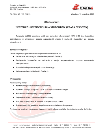 Fundacja MANUS Wybrzeże Wyspiańskiego 23-25, lok. 4.33-4.34 50 - 370 Wrocław FM / R / UB / 13 / 2013 Wrocław, 13 września 2013 Oferta pracy: SPRZEDAŻ UBEZPIECZEŃ DLA STUDENTÓW (PRACA CZASOWA) Fundacja MANUS poszukuje osób do: sprzedaży ubezpieczeń NNW i OC dla studentów, potrafiących w atrakcyjny sposób przedstawić ofertę i zachęcić studentów do zakupu ubezpieczeń. Zakres obowiązków Osoba na powyższym stanowisku odpowiedzialna będzie za: Udzielanie informacji o ofercie ubezpieczeń Fundacji. Zachęcanie Studentów do zadbania o swoje bezpieczeństwo poprzez wykupienie ubezpieczenia. Sprzedaż usług oferowanych przez Fundację. Informowania o działalności Fundacji. Wymagania: Poszukujemy osoby: Kontaktowej w rozmowie bezpośredniej. Sprawna obsługa programu Excel oraz arkusza online Google. Kulturalnie obsługującej każdego klienta. Odpowiedzialnej, sumiennej i skrupulatnej. Potrafiącej pracować w zespole oraz pod presją czasu. Posługującej się językiem angielskim w stopniu komunikatywnym. Preferowani studenci (wymagana dyspozycyjność od poniedziałku do piątku) w wieku do 26 lat. www: www.manus.pl mail: [email protected] NIP: 898-10-11-437 REGON: 930490978 KRS: 0000100892 tel.: +48 71 320 23 74 fax: +48 71 734 53 41 Rachunek bankowy: BZWBK 02 1090 2402 0000 0006 1000 9406 Fundacja MANUS Wybrzeże Wyspiańskiego 23-25, lok. 4.33-4.34 50 - 370 Wrocław Mile widziane: Wiedza o studiach na Politechnice Wrocławskiej Atuty współpracy z Fundacją MANUS: elastyczne godziny pracy (możliwość dopasowania pracy do planu zajęć) możliwość zdobycia ciekawego doświadczenia współpracujemy w miłej i twórczej atmosferze z młodymi ludźmi. Wynagrodzenie Proponujemy stawkę godzinową oraz premię uzależniona od sprzedaży. Rekrutacja Dokumenty aplikacyjne (CV ze zdjęciem + list motywacyjny) prosimy nadsyłać na adres [email protected] W tytule maila prosimy wpisać nr referencyjny: FM/R/UB/13/2013 oraz imię i nazwisko. Na zgłoszenia czekamy do 19 września 2013 do godz. 12:00 Zachęcamy do aplikowania! Prosimy o dołączenie do zgłoszenia klauzuli: Wyrażam zgodę na przetwarzanie moich danych osobowych przez Fundację MANUS, zawartych w złożonych przeze mnie dokumentach, w tym na przetwarzanie ich w przyszłości dla celów związanych z procesem rekrutacji. Niniejszą zgodę składam dobrowolnie i oświadczam, że zostałem poinformowany o uprawnieniach przysługujących mi na podstawie ustawy z dnia 29 sierpnia 1997 r. o ochronie danych osobowych (Dz. U.02.101.926.j.t.). www: www.manus.pl mail: [email protected] NIP: 898-10-11-437 REGON: 930490978 KRS: 0000100892 tel.: +48 71 320 23 74 fax: +48 71 734 53 41 Rachunek bankowy: BZWBK 02 1090 2402 0000 0006 1000 9406