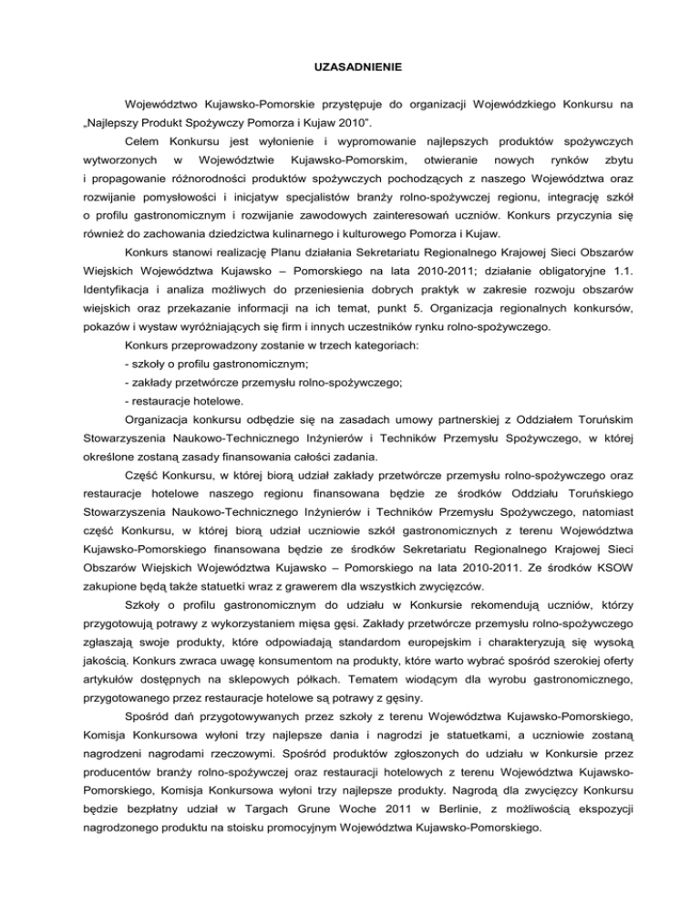 UZASADNIENIE Województwo Kujawsko-Pomorskie przystępuje do organizacji Wojewódzkiego Konkursu na „Najlepszy Produkt SpoŜywczy Pomorza i Kujaw 2010”. Celem Konkursu jest wyłonienie i wypromowanie najlepszych produktów spoŜywczych wytworzonych w Województwie Kujawsko-Pomorskim, otwieranie nowych rynków zbytu i propagowanie róŜnorodności produktów spoŜywczych pochodzących z naszego Województwa oraz rozwijanie pomysłowości i inicjatyw specjalistów branŜy rolno-spoŜywczej regionu, integrację szkół o profilu gastronomicznym i rozwijanie zawodowych zainteresowań uczniów. Konkurs przyczynia się równieŜ do zachowania dziedzictwa kulinarnego i kulturowego Pomorza i Kujaw. Konkurs stanowi realizację Planu działania Sekretariatu Regionalnego Krajowej Sieci Obszarów Wiejskich Województwa Kujawsko – Pomorskiego na lata 2010-2011; działanie obligatoryjne 1.1. Identyfikacja i analiza moŜliwych do przeniesienia dobrych praktyk w zakresie rozwoju obszarów wiejskich oraz przekazanie informacji na ich temat, punkt 5. Organizacja regionalnych konkursów, pokazów i wystaw wyróŜniających się firm i innych uczestników rynku rolno-spoŜywczego. Konkurs przeprowadzony zostanie w trzech kategoriach: - szkoły o profilu gastronomicznym; - zakłady przetwórcze przemysłu rolno-spoŜywczego; - restauracje hotelowe. Organizacja konkursu odbędzie się na zasadach umowy partnerskiej z Oddziałem Toruńskim Stowarzyszenia Naukowo-Technicznego InŜynierów i Techników Przemysłu SpoŜywczego, w której określone zostaną zasady finansowania całości zadania. Część Konkursu, w której biorą udział zakłady przetwórcze przemysłu rolno-spoŜywczego oraz restauracje hotelowe naszego regionu finansowana będzie ze środków Oddziału Toruńskiego Stowarzyszenia Naukowo-Technicznego InŜynierów i Techników Przemysłu SpoŜywczego, natomiast część Konkursu, w której biorą udział uczniowie szkół gastronomicznych z terenu Województwa Kujawsko-Pomorskiego finansowana będzie ze środków Sekretariatu Regionalnego Krajowej Sieci Obszarów Wiejskich Województwa Kujawsko – Pomorskiego na lata 2010-2011. Ze środków KSOW zakupione będą takŜe statuetki wraz z grawerem dla wszystkich zwycięzców. Szkoły o profilu gastronomicznym do udziału w Konkursie rekomendują uczniów, którzy przygotowują potrawy z wykorzystaniem mięsa gęsi. Zakłady przetwórcze przemysłu rolno-spoŜywczego zgłaszają swoje produkty, które odpowiadają standardom europejskim i charakteryzują się wysoką jakością. Konkurs zwraca uwagę konsumentom na produkty, które warto wybrać spośród szerokiej oferty artykułów dostępnych na sklepowych półkach. Tematem wiodącym dla wyrobu gastronomicznego, przygotowanego przez restauracje hotelowe są potrawy z gęsiny. Spośród dań przygotowywanych przez szkoły z terenu Województwa Kujawsko-Pomorskiego, Komisja Konkursowa wyłoni trzy najlepsze dania i nagrodzi je statuetkami, a uczniowie zostaną nagrodzeni nagrodami rzeczowymi. Spośród produktów zgłoszonych do udziału w Konkursie przez producentów branŜy rolno-spoŜywczej oraz restauracji hotelowych z terenu Województwa KujawskoPomorskiego, Komisja Konkursowa wyłoni trzy najlepsze produkty. Nagrodą dla zwycięzcy Konkursu będzie bezpłatny udział w Targach Grune Woche 2011 w Berlinie, z moŜliwością ekspozycji nagrodzonego produktu na stoisku promocyjnym Województwa Kujawsko-Pomorskiego. Realizacja Konkursu będzie sfinansowana ze środków PROW 2007-2013, Pomoc Techniczna, Schemat III – KSOW. Środki na powyŜszy cel w w budŜecie w 2011 r. : dział 010, rozdział 01041 § 4308 w wysokości 7.228,24 zł, dział 010, rozdział 01041 § 4309 w wysokości 2.409,41 zł, dział 010, rozdział 01041 § 4300 w wysokości 2.120,35 zł. wysokości 11.758,00 zł zaplanowano