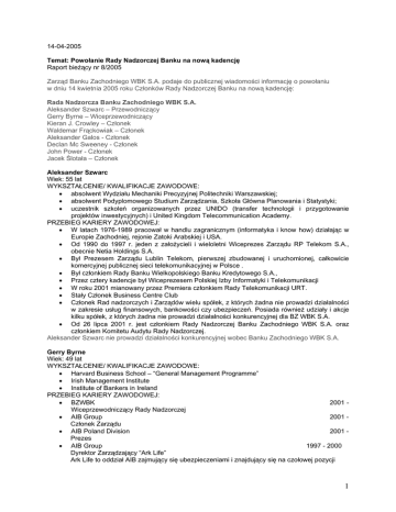 14-04-2005 Temat: Powołanie Rady Nadzorczej Banku na nową kadencję Raport bieżący nr 8/2005 Zarząd Banku Zachodniego WBK S.A. podaje do publicznej wiadomości informację o powołaniu w dniu 14 kwietnia 2005 roku Członków Rady Nadzorczej Banku na nową kadencję: Rada Nadzorcza Banku Zachodniego WBK S.A. Aleksander Szwarc – Przewodniczący Gerry Byrne – Wiceprzewodniczący Kieran J. Crowley – Członek Waldemar Frąckowiak – Członek Aleksander Galos - Członek Declan Mc Sweeney - Członek John Power - Członek Jacek Ślotała – Członek Aleksander Szwarc Wiek: 55 lat WYKSZTAŁCENIE/ KWALIFIKACJE ZAWODOWE: • absolwent Wydziału Mechaniki Precyzyjnej Politechniki Warszawskiej; • absolwent Podyplomowego Studium Zarządzania, Szkoła Główna Planowania i Statystyki; • uczestnik szkoleń organizowanych przez UNIDO (transfer technologii i przygotowanie projektów inwestycyjnych) i United Kingdom Telecommunication Academy. PRZEBIEG KARIERY ZAWODOWEJ: • W latach 1976-1989 pracował w handlu zagranicznym (informatyka i know how) działając w Europie Zachodniej, rejonie Zatoki Arabskiej i USA. • Od 1990 do 1997 r. jeden z założycieli i wieloletni Wiceprezes Zarządu RP Telekom S.A., obecnie Netia Holdings S.A. • Był Prezesem Zarządu Lublin Telekom, pierwszej zbudowanej i uruchomionej, całkowicie komercyjnej publicznej sieci telekomunikacyjnej w Polsce . • Był członkiem Rady Banku Wielkopolskiego Banku Kredytowego S.A., • Przez cztery kadencje był Wiceprezesem Polskiej Izby Informatyki i Telekomunikacji • W roku 2001 mianowany przez Premiera członkiem Rady Telekomunikacji URT. • Stały Członek Business Centre Club • Członek Rad nadzorczych i Zarządów wielu spółek, z których żadna nie prowadzi działalności w zakresie usług finansowych, bankowości czy ubezpieczeń. Posiada również udziały i akcje kilku spółek, z których żadna nie prowadzi działalności konkurencyjnej dla BZ WBK S.A. • Od 26 lipca 2001 r. jest członkiem Rady Nadzorczej Banku Zachodniego WBK S.A. oraz członkiem Komitetu Audytu Rady Nadzorczej. Aleksander Szwarc nie prowadzi działalności konkurencyjnej wobec Banku Zachodniego WBK S.A. Gerry Byrne Wiek: 49 lat WYKSZTAŁCENIE/ KWALIFIKACJE ZAWODOWE: • Harvard Business School – “General Management Programme” • Irish Management Institute • Institute of Bankers in Ireland PRZEBIEG KARIERY ZAWODOWEJ: • BZWBK 2001 Wiceprzewodniczący Rady Nadzorczej • AIB Group 2001 Członek Zarządu • AIB Poland Division 2001 Prezes • AIB Group 1997 - 2000 Dyrektor Zarządzający “Ark Life” Ark Life to oddział AIB zajmujący się ubezpieczeniami i znajdujący się na czołowej pozycji 1 w sektorze ubezpieczeń na życie i ubezpieczeń emerytalnych i w Irlandii. Dyrektor Regionalny AIB obszaru zachodniego Irlandii tzw.”Westlink” 1995 - 1997 Dyrektor Oddziału AIB w Dublinie 1992 - 1995 Dyrektor Departamentu Pożyczek Komercyjnych 1987 - 1992 Menedżer w Departamencie Pożyczek Komercyjnych w Dublinie 1986 - 1987 Z-ca dyrektora ds. Rozwoju północnych i wschodnich terenów Irlandii 1982 - 1986 Oddział AIB w Dublinie 1973 – 1982 Ponadto członkostwo: Irish Institute of Bankers Irish Management Institute “Wychowanek” Harvard Business School Gerry Byrne nie prowadzi działalności konkurencyjnej wobec Banku Zachodniego WBK S.A. Kieran Crowley Wiek: 52 lata WYKSZTAŁCENIE/ KWALIFIKACJE ZAWODOWE: • Ukończył Ballinlough National School oraz St Finbarr’s College, Farranferns. • BA (magister) języka angielskiego oraz łaciny na UCC w 1972r. • Szkolenie na biegłego księgowego w Coopers&Lybrand w Cork; kwalifikacje biegłego księgowego uzyskał w 1976r. PRZEBIEG KARIERY ZAWODOWEJ: • Przez 2 lata Zastępca Dyrektora Finansowego (Assistant Financial Controller) w Data 100 Cork – spółka zależna firmy Nortel. • Pracował przez 5 lat w Computer Automation Inc, m.in. na stanowisko Europejskiego Dyrektora Finansowego (European Financial Controller), a następnie przez 7 lat sprawował funkcję członka rady nadzorczej w spółkach zależnych tej firmy na terenie Europy. • W 1984r. założył Ryecourt Management Consultants. Prowadzi doradztwo związane z rozwojem biznesowym oraz wzrostem firmy w oparciu o rozwój podstawowych kompetencji w zakresie finansów, systemów informatycznych oraz rozwoju kadry. • W 1986r. założył Crowley Services Dublin LTD. • Od 2004 r. Członek Rady Grupy AIB. Ponadto: • Od 1992 r. do chwili obecnej Członek Krajowej Rady Wykonawczej Stowarzyszenia Małych Firm w Irlandii (SFA). Przez 5 lat od września 1998 do grudnia 2003 r. Przewodniczący Stowarzyszenia Małych Firm. • Obecnie przedstawiciel sektora Małych i Średnich Przedsiębiorstw w Grupie Roboczej ds. Jakości Obsługi Klienta przez Służby Publiczne w Irlandii. • Od 1998 do dziś członek Krajowej Rady Wykonawczej IBEC. Był członkiem Grupy ds. Doradztwa w zakresie Polityk, Grupy Roboczej ds. Ubezpieczeń oraz Grupy ds. Traktatu Nicejskiego. Kieran Crowley nie prowadzi działalności konkurencyjnej wobec Banku Zachodniego WBK S.A. Waldemar Frąckowiak Wiek: 55 lat Zajmowane stanowisko: Profesor Akademii Ekonomicznej w Poznaniu Kierownik Katedry Inwestycji i Rynków Kapitałowych Akademii Ekonomicznej w Poznaniu WYKSZTAŁCENIE: Nazwa uczelni Data ukończenia studiów • Wyższa Szkoła Ekonomiczna, w Poznaniu czerwiec 1972 • Akademia Ekonomiczna w Poznaniu • Akademia Ekonomiczna w Poznaniu Kierunek i tytuł naukowy Ekonomika przemysłu Magister ekonomii czerwiec 1979 DoktorNauk Ekonomicznych maj 1992 Doktor Habilitowany Nauk Ekonomicznych 2 • Harvard University Business School, lipiec 1992 Alumnus Boston, USA • Akademia Ekonomiczna w Poznaniu grudzień 2001 Profesor Studia i programy MBA • Georgia State University, College of Business Administration, Atlanta, USA, 1995 • Wharton School of Business and Commerce, University of Philadelphia, Philadelphia, USA, 1993 • Durham Un