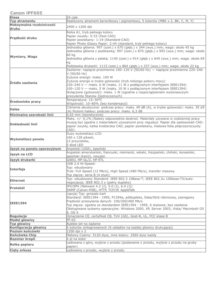 Canon iPF605 Klasa Typ atramentu Maksymalna rozdzielczość druku Prędkość druku Wymiary, Waga Źródło zasilania Środowisko pracy Hałas Minimalna szerokość linii Dokładność linii Wyświetlacz panelu Język na panelu operacyjnym Język na LCD Język drukarki Interfejs Ethernet Protokół IEEE1394 Regulacje Model głowicy Typ głowicy Konfiguracja głowicy Poziom końcówki Końcówka Chip Rozmiar kropli Rolka papieru Cięty arkusz 24 cale Reaktywny atrament barwnikowy i pigmentowy, 5 kolorów (MBK x 2, BK, C, M, Y) 2400 x 1200 dpi Rolka A1, tryb pełnego koloru Papier zwykły: 0:33 (Fast-CAD) Papier powlekany: 1:19 (Standard-CAD) Papier Photo Glossy Paper: 2:44 (standard, tryb pełnego koloru) Jednostka główna: 997 (szer.) x 670 (głęb.) x 344 (wys.) mm; waga: około 45 kg Jednostka główna z podstawką: 997 (szer.) x 870 (głęb.) x 993 (wys.) mm; waga: około 60 kg Jednostka główna z paletą: 1140 (szer.) x 914 (głęb.) x 645 (wys.) mm; waga: około 69 kg Podstawka drukarki: 1115 (szer.) x 864 (głęb.) x 237 (wys.) mm; waga: około 22 kg Zasilanie: napięcie przemienne 100–120 V (50/60 Hz) — napięcie przemienne 220–240 V (50/60 Hz) Zużycie energii: maks. 100 W Zużycie energii w trybie gotowości (tryb niskiego poboru mocy) 220–240 V — maks. 6 W (maks. 11 W z podłączonym interfejsem IEEE1394) 100–120 V — maks. 5 W (maks. 10 W z podłączonym interfejsem IEEE1394) Wyłączone (gotowość): maks. 1 W (zgodnie z rozporządzeniem wykonawczym prezydenta Stanów Zjednoczonych) Temperatura: 15–30°C Wilgotność: 10–80% (bez kondensacji) Ciśnienie akustyczne: podczas pracy: maks. 49 dB (A), w trybie gotowości: maks. 35 dB (A) Poziom hałasu: podczas pracy: maks. 6,3 dB 0,02 mm (teoretycznie) Maks. +/- 0,1% (Należy odpowiednio dostroić. Materiały używane w codziennej pracy muszą być zgodne z materiałami używanymi przy regulacji. Papier dla zastosowań CAD: papier zwykły, kalka kreślarska CAD, papier powlekany, matowa folia półprzezroczysty CAD). Duży wyświetlacz LCD: 160 x 128 pikseli, 12 przycisków, 5 diod LED Angielski (USA), japoński Angielski amerykański, francuski, niemiecki, włoski, hiszpański, chiński, koreański, japoński (kanji), rosyjski GARO, HP-GL/2, HP RTL USB 2.0 Hi-Speed: Typ: wbudowany Tryb: Full Speed (12 Mb/s), High Speed (480 Mb/s), transfer masowy Typ złącza: seria B (4 styki) Typ: wbudowany Standard: IEEE 802.3 10Base-T; IEEE 802.3u 100base-TX/autonegocjacja; IEEE 802.3 x (pełny dupleks) IPX/SPX (Netware 4.2 (J), 5.0 (J), 6.0 (J)) SNMP (Canon-MIB), HTTP, TCP/IP, AppleTalk (opcja) Typ: gniazdo kart Standard: IEEE1394 - 1995, P1394a, półdupleks, Data/Strb różnicowy, szeregowy Prędkość przesyłania danych: 100/200/400 Mb/s Typ złącza: zgodne ze standardem IEEE1394 - 1995, 6 stykowe, bez zasilania Obsługiwane systemy operacyjne: Windows 2000, XP, Server 2003, Vista/ Macintosh OS 9, OS X Oznaczenie CE, certyfikat CB, TUV (GS), Gost-R, UL, FCC klasa B PF-03 Bubble-jet na żądanie 6 kolorów zintegrowanych (6 układów na każdej głowicy drukującej) 1200 dpi x 2 Matowy Czarny: 5120 dysz, inne kolory: 2560 dysz każdy 4 pl na kolor Ładowana z góry, wyjście z przodu (podawanie z przodu, wyjście z przodu na gruby papier) Ładowana z przodu, wyjście z przodu Typ nośnika Rola papieru: papier zwykły 80 g/m², papier zwykły 90 g/m², matowy powlekany 90 g/m², fotograficzny błyszczący 190 g/m²/ 240 g/m²/ 300 g/m², fotograficzny satynowy 190 g/m²/ 240 g/m²/ 300 g/m², fotorealistyczny 210 g/m², fotograficzny perłowy 260 g/m², matowy powlekany 120 g/m²/ 140 g/m²/ 180 g/m², biały nieprzezroczysty 120 g/m², samoprzylepny do wydruków o wysokiej rozdzielczości 140 g/m², do wydruków o wysokiej rozdzielczości 180 g/m², błyszczący do wydruków próbnych 195 g/m², półbłyszczący do wydruków próbnych 195 g/m², półbłyszczący do wydruków próbnych 195 g/m²/ 255 g/m² Rozmiar nośnika Rola papieru (szerokość): ISO: A3, A2, A1 JIS: B4, B2 ARCH: D 24 cale Inne: 8 cali, 10 cali, 14 cali, 16 cali, 17 cali, 300 mm, A3+ (329 mm) Cięte arkusze: ISO: A4, A3, A3+, A2, A2+, A1, A0, B4, B3, B2 DIN: C4, C3, C2 JIS: B4, B3, B2 ANSI: 8,5 x 11 cali, 8,5 x 14 cali, 11 x 17 cali, 13 x 19 cali, 17 x 22 cale, 22 x34 cale ARCH: 9 x12 cali, 12 x 18 cali, 18 x 24 cale, 24 x 36 cali Zdjęcie: 20 x 24 cale, 18 x 22 cale, 14 x 17 cali, 12 x 16 cali, 10 x 12 cali, 10 x 15 cali, 16 x 20 cali (amerykański format fotograficzny) Plakat: 20 x 30 cali, 300 x 900 mm Inne: 13 x 22 cale Grubość nośnika Maksymalna średnica zewnętrzna rolki papieru Rozmiar rdzenia nośnika Szerokość nośnika Rola papieru i arkusze: 0,07–0,8 mm 150,0mm Średnica wewnętrzna roli: 2 cale/3 cale (opcja) Rola papieru: 203 - 610 mm Cięte arkusze: 203 - 610 mm Minimalna drukowalna długość 203mm papieru Maksymalna drukowalna Rola papieru: 18 m (w zależności od systemu operacyjnego i aplikacji) długość papieru Cięte arkusze: 1,6 m Zalecany obszar: Rola papieru: góra: 20 mm, dół: 27 mm, bok: 5 mm Cięte arkusze (ładowanie z góry/kaseta): góra: 20 mm, dół: 27 mm, bok: 5 mm Cięte arkusze (ładowanie z przodu): góra: 20 mm, dół: 23 mm, bok: 5 mm Maksymalna drukowalna Obszar druku: długość papieru Papier z roli: góra: 3 mm, dół: 3 mm, bok: 3 mm Papier z roli (druk bezmarginesowy): góra: 0 mm, dół: 0 mm; bok: 0 mm Cięte arkusze (ładowanie z przodu): góra: 3 mm, dół: 23 mm, po bokach: 3 mm Cięte arkusze (ładowanie z góry/kaseta): góra: 3 mm, dół: 3 mm, bok: 3 mm Szerokość nośnika dla druku bez obramowań 10 cali (254 mm), B4 (257 mm), A3+ (329 mm), 14 cali (356 mm), 16 cali (407 mm), A2 (420 mm), A2+/17 cali (432 mm), B2 (515 mm), A1 (594 mm), 24 cale (610 mm)