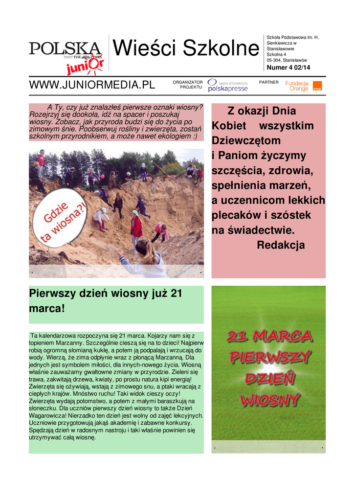 Wieści Szkolne Szkoła Podstawowa im. H. Sienkiewicza w Stanisławowie Szkolna 4 05-304, Stanisławów Numer 4 02/14 WWW.JUNIORMEDIA.PL ORGANIZATOR PROJEKTU A Ty, czy już znalazłeś pierwsze oznaki wiosny? Rozejrzyj się dookoła, idź na spacer i poszukaj wiosny. Zobacz, jak przyroda budzi się do życia po zimowym śnie. Poobserwuj rośliny i zwierzęta, zostań szkolnym przyrodnikiem, a może nawet ekologiem :) . PARTNER Z okazji Dnia Kobiet wszystkim Dziewczętom i Paniom życzymy szczęścia, zdrowia, spełnienia marzeń, a uczennicom lekkich plecaków i szóstek na świadectwie. Redakcja . Pierwszy dzień wiosny już 21 marca! Ta kalendarzowa rozpoczyna się 21 marca. Kojarzy nam się z topieniem Marzanny. Szczególnie cieszą się na to dzieci! Najpierw robią ogromną słomianą kukłę, a potem ją podpalają i wrzucają do wody. Wierzą, że zima odpłynie wraz z płonącą Marzanną. Dla jednych jest symbolem miłości, dla innych-nowego życia. Wiosną właśnie zauważamy gwałtowne zmiany w przyrodzie. Zieleni się trawa, zakwitają drzewa, kwiaty, po prostu natura kipi energią! Zwierzęta się ożywiają, wstają z zimowego snu, a ptaki wracają z ciepłych krajów. Mnóstwo ruchu! Taki widok cieszy oczy! Zwierzęta wydają potomstwo, a potem z małymi baraszkują na słoneczku. Dla uczniów pierwszy dzień wiosny to także Dzień Wagarowicza! Nierzadko ten dzień jest wolny od zajęć lekcyjnych. Uczniowie przygotowują jakąś akademię i zabawne konkursy. Spędzają dzień w radosnym nastroju i taki właśnie powinien się utrzymywać całą wiosnę. . . Polska The Times | Numer 4 02/2014 | Strona 2 www.polskatimes.pl Wieści Szkolne WWW.JUNIORMEDIA.PL O PRAWACH KOBIET Rola kobiety dawniej i dziś. Od niepamiętnych czasów kobieta zawsze zajmowała się domem. Gotowała, sprzątała, prała, wychowywała dzieci. Dawniej kobiety nie kształciły się, nie chodziły do szkoły. Sytuacja zmieniła się w XIX wieku, kiedy to kobiety zaczęły upominać się o swoje prawa. Od tamtej pory kobieta mogła się kształcić. Dzisiaj kobieta nie jest własnością mężczyzny. Arabskie kobiety nie mają żadnych praw, nie mogą się kształcić i pracować. Jeśli wychodzą na ulicę, muszą zasłaniać twarze. Kandydat na męża arabskiej kobiety jest wybierany przez jej rodzinę. Zdarza się, że jest on od niej dużo starszy. Mimo to, kobieta musi się poddać woli rodziców i wyjść za niego za mąż. W innych krajach kobiety są wolne. Mogą się kształcić, pracować. Mogą wyjść za mąż, ale nie muszą. Kandydata na męża wybierają sobie same. Współczesna kobieta nie podlega niczyjej woli i jest wolna. Decyduje sama za siebie. Może mieć dzieci, ale nie musi. Może spotykać się z koleżankami i nie musi pytać męża o zgodę. Jeżeli nie chce wychodzić za mąż, może mieszkać sama. Dzisiejsze kobiety potrafią zadbać same o siebie. Źródło: AirStar.pl Wyniki konkursów: Konkurs plastyczny TĘCZA: 1. m w szkole Aleksandra Wielgo - 5a; wyróżnienie Zuzanna Kruszewska - 5a Konkurs historyczny KRĄG: 1m. w szkole Damian Rawski - 5a; 2m. Piotr Wieczorek - 5b; 3m. Marcin Stępień - 6b. Konkurs na najładniejszą kartkę walentynkową: Klasy 1-3: 1m. Natalia Wojtyńska - 3b i Michał Piekut - 2a 2m. Maja Stępień - 3b Klasy 4-6: 1m. Natalia Musiał - 4b i Mateusz Pasik - 4a 2m. Emilia Łukaszewska - 4b i Martyna Rosa - 4b 3m. Joanna Kuć - 4b i Jakub Suchocki - 4a wyróżnienie: Maja Brzezińska - 4b, Magdalena Kaim 4a, Kacper Michalak - 4a, Zuzanna Stępień - 5a Rekolekcje wielkopostne W naszej parafii odbędą się w dniach 24, 25 i 26 marca. Msza święta dla nas zaplanowana została na godzinę 11:00. W tych dniach przychodzimy rano do szkoły, na trzy lekcje, potem idziemy do Kościoła i około godz. 12:00 wracamy do domów. . . SPRÓBUJ SWOICH SIŁ!!! Weź udział w konkursach przygotowanych z okazji DNIA PATRONA: 1. Literackim, na napisanie listu do dowolnego bohatera utworów H. Sienkiewicza. 2. Plastycznym, na wykonanie portretu dowolnego bohatera utworów H. Sienkiewicza. Prace należy składać do p. M. Kożuch. Konkursy przyrodnicze przygotowane z okazji DNIA ZIEMI: 1. Konkurs na napisanie wiersza o lesie klasy 1-6; 2. Klasowy konkurs plastyczno-techniczny na wykonanie budowli z odpadów, klasy 1-6; 3. Konkurs przyrodniczy dla klas 4-6; 4. Ogólnopolski konkurs przyrodniczo-ekologiczny dla klas 4-6. Prace należy składać do p. B. Dymerskiej.