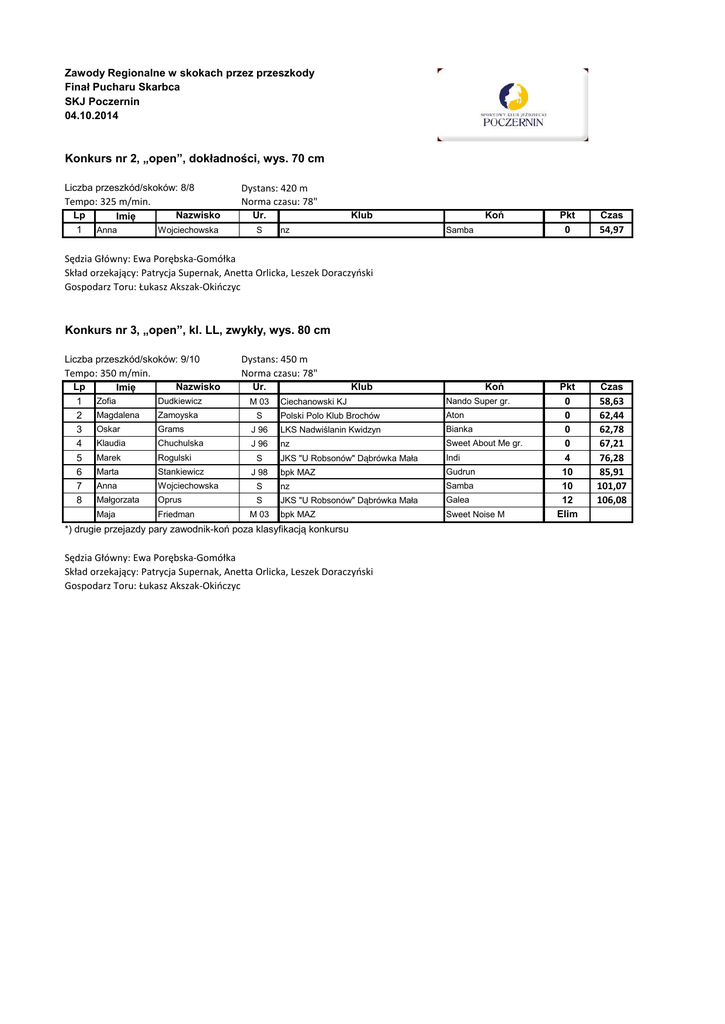 Zawody Regionalne w skokach przez przeszkody Finał Pucharu Skarbca SKJ Poczernin 04.10.2014 Konkurs nr 2, „open”, dokładności, wys. 70 cm Liczba przeszkód/skoków: 8/8 Tempo: 325 m/min. Lp 1 Imię Anna Nazwisko Wojciechowska Dystans: 420 m Norma czasu: 78" Ur. S Koń Klub nz Samba Pkt 0 Czas 54,97 Sędzia Główny: Ewa Porębska-Gomółka Skład orzekający: Patrycja Supernak, Anetta Orlicka, Leszek Doraczyński Gospodarz Toru: Łukasz Akszak-Okińczyc Konkurs nr 3, „open”, kl. LL, zwykły, wys. 80 cm Liczba przeszkód/skoków: 9/10 Tempo: 350 m/min. Lp 1 2 3 4 5 6 7 8 Imię Nazwisko Dystans: 450 m Norma czasu: 78" Ur. Zofia Dudkiewicz Magdalena Zamoyska Oskar Grams Klaudia Chuchulska J 96 Marek Rogulski Marta Stankiewicz Anna Wojciechowska Małgorzata Oprus Maja Friedman Koń Klub Ciechanowski KJ Nando Super gr. S Polski Polo Klub Brochów Aton J 96 LKS Nadwiślanin Kwidzyn Bianka nz Sweet About Me gr. JKS "U Robsonów" Dąbrówka Mała Indi bpk MAZ Gudrun S nz Samba S JKS "U Robsonów" Dąbrówka Mała Galea bpk MAZ Sweet Noise M M 03 S J 98 M 03 *) drugie przejazdy pary zawodnik-koń poza klasyfikacją konkursu Sędzia Główny: Ewa Porębska-Gomółka Skład orzekający: Patrycja Supernak, Anetta Orlicka, Leszek Doraczyński Gospodarz Toru: Łukasz Akszak-Okińczyc Pkt 0 0 0 0 4 10 10 12 Elim Czas 58,63 62,44 62,78 67,21 76,28 85,91 101,07 106,08 Zawody Regionalne w skokach przez przeszkody Finał Pucharu Skarbca SKJ Poczernin 04.10.2014 Konkurs nr 3, „open”, kl. LL, zwykły, wys. 80 cm Liczba przeszkód/skoków: 10/12 Tempo: 350 m/min. Lp 1 Imię Nazwisko Zofia Dudkiewicz Marta Czernik Marta Czernik Zofia Dudkiewicz Dystans: 530 m Norma czasu: 91" Ur. M 03 Koń Klub Ciechanowski KJ Nando Super gr. S SKJ Legia-Kozielska Warszawa Wareg S SKJ Legia-Kozielska Warszawa Wareg Ciechanowski KJ Nando Super gr. M 03 Pkt 3,5 Czas b.o. b.o. b.o. 76,32 86,57 75,21 88,50 Pkt 21 20 20 19 17 16 15 64,62 65,86 66,13 61,18 65,87 70,86 62,10 Sędzia Główny: Ewa Porębska-Gomółka Sędzia Kwalifikator: Łukasz Akszak-Okińczyc Skład orzekający: Patrycja Supernak, Anetta Orlicka, Leszek Doraczyński Gospodarz Toru: Łukasz Akszak-Okińczyc Konkurs nr 5, kl. L, z ustalonym czasem, wys. 100 cm Ustalony czas: 60" Imię Lp Nazwisko Ur. Koń Klub 1 Helena Grabowska JM 00 SKJ Legia-Kozielska Warszawa Wareg 2 3 4 5 6 7 Marie Janekovic JM 00 Stow. KS Chojnów Eskadra Józef Orzechowski S Działdowskie Tow. Jeździeckie Ragazza Klaudyna Grams S LKS Nadwiślanin Kwidzyn Lublana Zbigniew Świniarski S Działdowskie Tow. Jeździeckie Almera Zofia Juszkiewicz J 98 bpk MAZ Kalina Ada Kopeć J 97 KU AZS PW Warszawa 8 9 10 11 12 13 14 15 Jana Karfikowa Karolina Woźniakowska KU AZS UW Warszawa Klara Aleksander der Grosse 9 Taniec Magdalena Zamoyska Polski Polo Klub Brochów Aton Marta Stankiewicz J 98 bpk MAZ Gudrun Agata Florkiewicz J 96 Stow. KS Chojnów Caro Agnieszka Paszkowska SJ Szarża Popówek James Bond gr. Oskar Grams LKS Nadwiślanin Kwidzyn Bianka Sławomir Paszkowski S SJ Szarża Popówek Lacordaire 3 Dariusz Żmiejwski S Ciechanowski KJ Nezig S J 97 S MJ 93 J 96 Czechy *) drugie przejazdy pary zawodnik-koń poza klasyfikacją konkursu Sędzia Główny: Ewa Porębska-Gomółka Skład orzekający: Anetta Orlicka, Ewa Porębska-Gomółka, Leszek Doraczyński Gospodarz Toru: Łukasz Akszak-Okińczyc 15 15 14 14 14 13 10 4 Elim Czas 62,58 71,45 63,67 65,07 69,95 67,16 66,67 63,70 Zawody Regionalne w skokach przez przeszkody Finał Pucharu Skarbca SKJ Poczernin 04.10.2014 Konkurs nr 6, kl. P, o wzr. stopniu trudności z jokerem (10 przeszkód) Liczba przeszkód/skoków: 10/10 Tempo: 350 m/min. Lp 1 2 3 4 5 6 7 Imię Nazwisko Aleksandra Żmijewska Józef Orzechowski Grzegorz Kubiak Marek Urbaniak Anna Bortnik Agnieszka Agnieszka Paszkowska Paszkowska 8 9 Marie Dystans: 530 m Norma czasu: 88" Ur. Koń Klub Ciechanowski KJ Nezig S Działdowskie Tow. Jeździeckie Ragazza S Sobieski Jumping Team Gdańsk Lady Canta S bpk MAZ Ever for Ever SKJ Trawers Warszawa Holandia MJ 93 MJ 93 SJ Szarża Popówek SJ Szarża Popówek Helios Janekovic JM 00 Stow. KS Chojnów Eskadra Dominika Paliwoda S SKJ Beckersport Laszczki Laguna 10 11 12 13 Zofia Juszkiewicz J 98 bpk MAZ Kalina Jakub Wawszczak S SKJ Bajardo Czosnów Taniec Klaudyna Grams S LKS Nadwiślanin Kwidzyn Lublana Agata Florkiewicz Stow. KS Chojnów 14 15 16 17 18 19 20 21 Jana Karfikowa Zbigniew Świniarski S Działdowskie Tow. Jeździeckie Caro Aleksander der Grosse 9 Almera Natalia Witkowska J 96 bpk MAZ Mon Cherie Jacek Zagor S KJ Nadwiślanin Kwidzyn Jeziorna Jacek Zagor S LKS Nadwiślanin Kwidzyn Polandor Aleksandra Żmijewska J 98 Ciechanowski KJ Leocavallo L Helena Grabowska JM 00 SKJ Legia-Kozielska Warszawa Carlos Ada Kopeć KU AZS PW Warszawa Klara J 98 J 97 J 96 Czechy J 97 Sędzia Główny: Ewa Porębska-Gomółka Skład orzekający: Ewa Porębska-Gomółka, Patrycja Supernak, Leszek Doraczyński Gospodarz Toru: Łukasz Akszak-Okińczyc James Bond gr. Pkt 65 65 65 65 62 62 62 Czas 56 54 53 53 62,53 64,56 64,59 70,94 71,63 75,69 76,72 70,59 67,21 80,68 77,38 71,25 94,06 48 48 48 42 26 25 25 13 80,56 91,10 107,97 120,09 140,81 62,34 80,78 92,72 61 60 Zawody Regionalne w skokach przez przeszkody Finał Pucharu Skarbca SKJ Poczernin 04.10.2014 Konkurs nr 7, kl. N, zwykły z rozgrywką, wys. 120 cm Liczba przeszkód/skoków: 10/12; 6/7 Dystans: 480 m; 290 m Norma czasu: 83";; 57" Tempo: 350 m/min. Lp 1 2 3 4 5 6 7 8 9 10 11 12 13 Imię Nazwisko Aleksandra Żmijewska Grzegorz Kubiak Michał Kubiak Zofia Nietubyć Jacek Ur. Koń Klub Ciechanowski KJ Leocavallo L S Sobieski Jumping Team Gdańsk Winnetou S J 98 Sobieski Jumping Team Gdańsk Galaktyka J 97 SKJ Beckersport Laszczki Silver Boy Zagor S LKS Nadwiślanin Kwidzyn Dolomit Dominika Paliwoda S SKJ Beckersport Laszczki Laguna Marek Urbaniak S bpk MAZ Ever for Ever Marta Rzemykowska S SKJ Poczernin Unesco Grzegorz Kubiak S Sobieski Jumping Team Gdańsk Lady Canta Jacek Zagor S LKS Nadwiśla