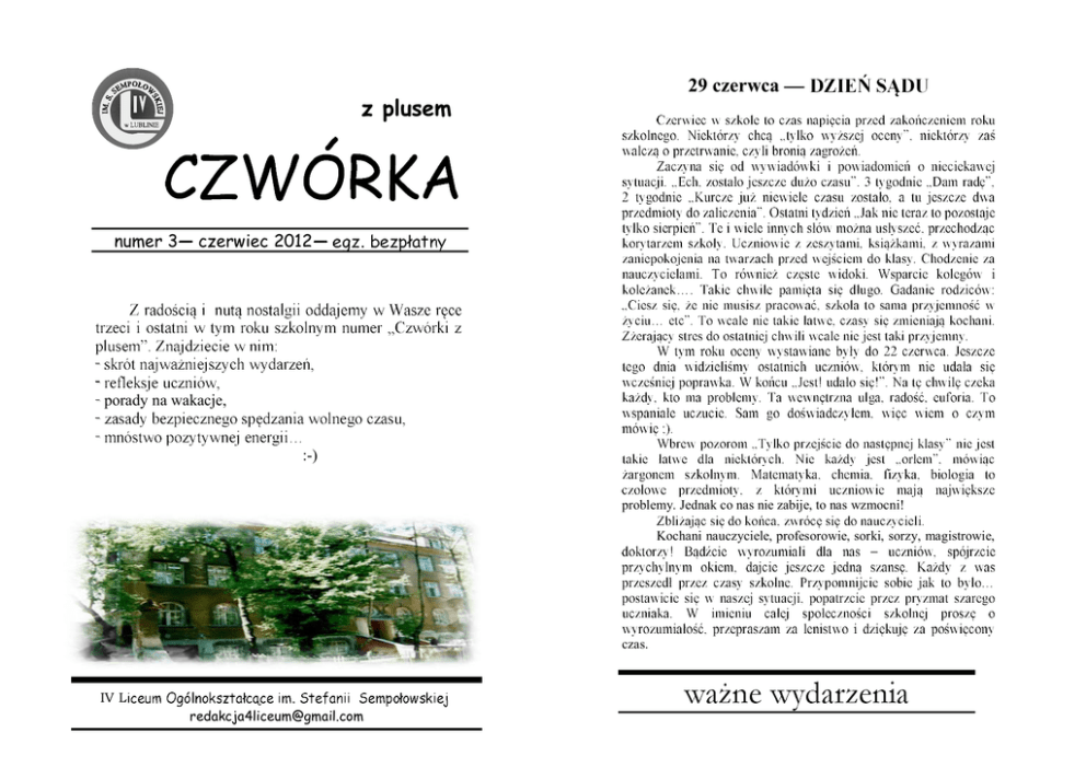 29 czerwca z plusem numer 3 czerwiec 2012 porady na wakacje, :-) problemy. Jednak co nas nie zabije, to nas wzmocni! Kochani nauczyciele, profesorowie, sorki, sorzy, magistrowie, czas. IV L [email protected] do ostatniego 14 czerwca 2012r. Paulina Adamiak, PS. Wam jak z nut, Katarzyna Ozga, Justyna Szatkowska i niech to pozostanie naszym sekretem. Paulina Nowicka Pani Marianna Janowska Potop Henryka Sienkiewicza, Johanna Wolfganga von Goethego, czy wreszcie przez jednych kochana a przez innych znienawidzona Lalka Wesele zachwycona. Potop?! 1000 stron nudy i to w trzech tomach! - Wesele na pierwszy rzut oka P. Barbara Oratowska Koszyk osoby?! Moim zdaniem po walkach z lenistwem i stereotypowym przedstawionymi czteroma pokoleniami. Przy tej lekturze Krzeszowskiej. Wesele i Potop, w jakich Potop , Autor trafnie wskazuje miejsce jednostki w gromadzie. klasy humanistycznej, czy matematycznej. Potopu. szkolny? Lalka Lalki na pewno nie przeczytam. A Ania Stefanek, 2c Me and Mr. Johnson najbardziej tajemniczego muzyka historii - bluesmana z delty Missisipi Roberta Johnsona. Dlaczego jest They' re Red Hot Red Hot Chili Peppers, mniej rozpoznawalni). np.: albo bo warto! nauczycielem po nocach i to w dodatku na cmentarzu (tylko tam niezliczonych gwiazdach muzyki do czerpania inspiracji z tej postaci: Jimi Hendrix, Eric Clapton, Jimmy Page, Jeff Beck, The Rolling Stones recenzja recenzja oczami fantastyki poszukiwaniu mojego albo i naszego domu ( albo po prostu po wakacjach :-) AKTYWNE WAKACJE sportowych. Rekreacje potrafimy! Sport to zdrowie Jak wiadomo podczas roku szkolnego nie Recepta na bezpieczne wakacje skutki uboczne. Recepta na bezpieczne wakacje: 1) - swoje potrzebujesz natychmiastowej pomocy. 2) - wakacyjny, bo nie ma nic gorszego od siedzenia w 3) Magdalena Laskowska II C - 4) prowadzony przez sekty. Nie opowiadaj nowo swoich rzeczy bez opieki - 7) 5) - 8) podwiezienia przez obcych. 6) - zawsze z przeznaczeniem! 9) - kieszeniach. 10) szkolny dzwonek czy ostatni egzamin na studiach wszystkim Nauczycielom i Uczniom: - wielkie ryzyko. Nie Redakcja Ponadto: - recepty plus dobra zabawa, towarzystwo i odrobina , Paulina Adamiak, Paulina Nowicka, Justyna Szatkowska, Opiekunowie: