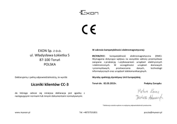 W zakresie kompatybilności elektromagnetycznej: EXON Sp. z o.o. ul. Władysława Łokietka 5 87-100 Toruo POLSKA 89/336/ECCkompatybilnośd elektromagnetyczna (EMC): Wymagania dotyczące wpływu na wszystkie sektory przemysłowe związane z produkcją i użytkowaniem urządzeo elektrycznych i elektronicznych. W szczególności urządzeo domowych i przemysłowych, przetwarzania danych, technologii informatycznych oraz urządzeo telekomunikacyjnych. Deklarujemy z pełną odpowiedzialnością, że wyrób: Wyroby spełniają dyrektywy Unii Europejskiej. Toruo dn. 02.03.2015r. Liczniki klientów CC-3 Podpisy Zarządu: do którego odnosi się niniejsza deklaracja jest zgodny z następującymi normami lub innymi dokumentami normatywnymi. *Deklaracja została wydana na wyłączną odpowiedzialnośd producenta. www.myexon.pl Tel: +48737531831 [email protected] Ograniczenie użycia substancji niebezpiecznych: EXON Sp. z o.o. ul. Władysława Łokietka 5 87-100 Toruo POLSKA Dyrektywa RoHS 2002/95/WE - Dyrektywa RoHS obejmuje swoim działaniem ograniczenia na etapie produkcji w wprowadzaniu substancji niebezpiecznych w elektronice. Oparta jest na zasadach obowiązujących dla dyrektyw nowego podejścia, które uwzględniają tzw. Nowe Ramy Prawne Decyzji (WE) 768/2008. Wyroby spełniają dyrektywy Unii Europejskiej. Deklarujemy z pełną odpowiedzialnością, że wyrób: Toruń dn. 02.03.2015r. Liczniki klientów CC-3 Podpisy Zarządu: do którego odnosi się niniejsza deklaracja jest zgodny z następującymi normami lub innymi dokumentami normatywnymi. *Deklaracja została wydana na wyłączną odpowiedzialnośd producenta. www.myexon.pl Tel: +48737531831 [email protected]