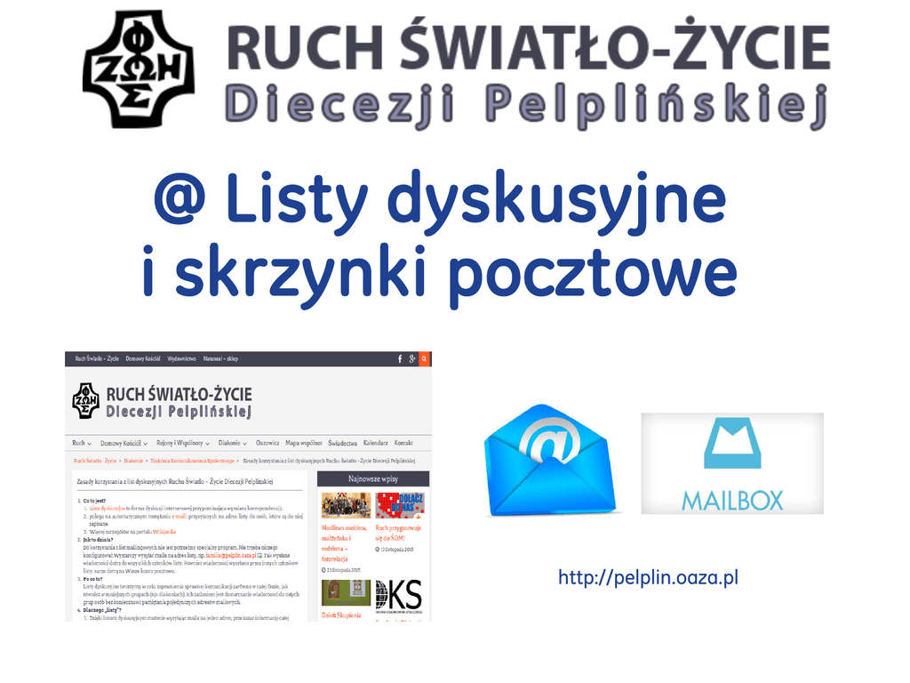 @ Listy dyskusyjne i skrzynki pocztowe http://pelplin.oaza.pl Jak działa lista dyskusyjna Potrzeba: wysłanie listu kręgu centralnego DK do wszystkich małżeństw w diecezji pelplińskiej Lista dyskusyjna [email protected] [email protected] Para diecezjalna Etap 1: wysłanie wiadomości z listem kręgu centralnego na adres listy dyskusyjnej Serwer pocztowy Etap 2: automatyczne wysłanie wiadomości do wszystkich zapisanych osób do listy dyskusyjnej Zalety: para diecezjalna nie musi pamiętać adresów email wszystkich par z diecezji (aktualność). Pomyłki z niedołączeniem adresu lub dołączeniem przypadkowego adresu nie występują. [email protected] [email protected] Etap 3: odebranie wiadomości przez poszczególne osoby na swoich skrzynkach elektronicznych 2 Istniejące listy dyskusyjne • Poziom diecezji • [email protected] – wszyscy członkowie DK • Poziom rejonu – wszyscy członkowie danego rejonu DK • [email protected] Lista jest moderowana – jest osoba odpowiedzialna za tę listę. • [email protected] • [email protected] Aby korzystać z listy dyskusyjnej na poziomie diakonii, należy być • [email protected] zapisanym na listę. • [email protected] • Poziom diakonii • [email protected] – dla Diakonii Komunikowania Społecznego • [email protected] – dla Diecezjalnej Diakonii Jedności kolejne listy dyskusyjne będą dodawane w zależności od potrzeb 3 Lista dyskusyjna - co mogę zrobić? Założyć listę dyskusyjną 1. Osoba odpowiedzialna za nową listę wysyła wniosek na adres [email protected] podając dane opisane poniżej 2. Po akceptacji wniosku lista jest zakładana i można z niej korzystać. Dane listy dyskusyjnej: - Nazwa - Osoba odpowiedzialna - Początkowa lista adresów mailingowych - Czy jest wymagana zgoda osoby odpowiadającej za listę na dopisanie nowego członka do listy Dopisać się do listy dyskusyjnej 1. We własnym imieniu - poprzez wypełnienie prostego formularza na stronie list dyskusyjnych (adres poniżej) lub 2. W imieniu innej osoby - poprzez zgłoszenie nowego członka przez osobę odpowiedzialną za listę Wypisać się z listy dyskusyjnej 1. We własnym imieniu – wysyłając wiadomość na adres [email protected] 2. Osoba odpowiedzialna za listę może w dowolnym momencie wystąpić do DKS o zmianę składu listy wysyłając wiadomość na adres [email protected] Więcej na stronie: http://pelplin.oaza.pl/diakonie/diakonia-komunikowania-spolecznego/listy-dyskusyjne/ 4 Jak działa funkcyjna skrzynka pocztowa? Potrzeba: osoby z DK lub osoby spoza DK chcą wysłać prośbę o modlitwę. [email protected] [email protected] [email protected] Etap 2: serwer pocztowy przesyła automatycznie prośby na wszystkie adresy e-mail przypisane do skrzynki. Etap 1: osoby wysyłają (w różnym czasie) prośbę o modlitwę na skrzynkę. Etap 3: każda osoba z diakonii modlitwy otrzymuje poszczególne prośby Wiadomość na skrzynkę funkcyjną może wysłać każdy (inaczej niż w liście dyskusyjnej diakonii). Skrzynka nie jest moderowana. 5 Jak działa imienna skrzynka pocztowa? Potrzeba: chcemy, aby wszystkie wiadomości do Jana Kowalskiego były wysyłane na adres pocztowy powiązany z DK a nie na [email protected]. [email protected] [email protected] Jan Kowalski Etap 1: osoba wysyła wiadomość do Jana Kowalskiego na adres udostępniony na stronach DK (alias) Etap 2: serwer pocztowy przesyła automatycznie wiadomości na faktyczny adres e-mail Jana Kowalskiego Skrzynka imienna może też być rzeczywistym adresem elektronicznym na serwerze pocztowym DKS. Etap 3: Jan Kowalski otrzymuje wiadomość Tak jak w przykładzie skrzynka imienna może być aliasem rzeczywistego adresu elektronicznego. Pocztę na skrzynkę imienną może wysłać każdy (inaczej niż w liście dyskusyjnej diakonii). 6 Dziękujemy za uwagę Pytania? Kontakt: [email protected] Więcej na: http://pelplin.oaza.pl