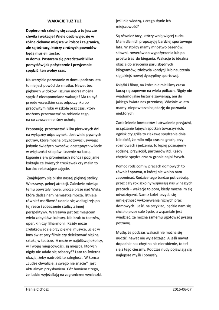 WAKACJE TUŻ TUŻ Dopiero rok szkolny się zaczął, a tu jeszcze chwila i wakacje! Wiele osób wyjedzie w różne ciekawe miejsca w Polsce i za granicą, ale są też tacy, którzy z różnych powodów będą musieli zostać w domu. Postaram się przedstawić kilka pomysłów jak pożytecznie i przyjemnie spędzić ten wolny czas. Na szczęście pozostanie w domu podczas lata to nie jest powód do smutku. Nawet bez pięknych widoków i szumu morza można spędzić niezapomniane wakacje! Ma to być przede wszystkim czas odpoczynku po pracowitym roku w szkole oraz czas, który możemy przeznaczyć na robienie tego, na co zawsze mieliśmy ochotę. Proponuję przeznaczyć kilka pierwszych dni na wyłączny odpoczynek. Jest wiele pysznych potraw, które można przygotować używając jedynie świeżych owoców, dostępnych w lecie w większości sklepów. Leżenie na kocu, kąpanie się w promieniach słońca i popijanie koktajlu ze świeżych truskawek czy malin to bardzo relaksujące zajęcie. Znajdujemy się blisko naszej pięknej stolicy, Warszawy, pełnej atrakcji. Zaledwie miesiąc temu powstały nowe, urocze plaże nad Wisłą, które dadzą nam namiastkę morza. lstnieje również możliwość udania się w długi rejs po tej rzece i zobaczenie stolicy z innej perspektywy. Warszawa jest też miejscem wielu zabytków kultury. Nie brak tu teatrów, oper, kin czy filharmonii. Każdy może zrelaksować się przy pięknej muzyce, uciec w inny świat przy filmie czy delektować piękną sztuką w teatrze. A może w najbliższej okolicy, w Twojej miejscowości, są miejsca, których nigdy nie udało się zobaczyć? Lato to świetna okazja, żeby nadrobić te zaległości. W końcu „cudze chwalicie, a swego nie znacie’’ jest aktualnym przysłowiem. Cóż bowiem z tego, że ludzie wyjeżdżają na zagraniczne wycieczki, Hania Cichosz jeśli nie wiedzą, z czego słynie ich miejscowość? Są również tacy, którzy wolą więcej ruchu. Mam dla nich propozycję bardziej sportowego lata. W stolicy mamy mnóstwo basenów, siłowni, rowerów do wypożyczenia lub po prostu tras do biegania. Wakacje to idealna okazja do zrzucenia paru zbędnych kilogramów, zdobycia kondycji lub nauczenia się jakiejś nowej dyscypliny sportowej. Książki i filmy, na które nie mieliśmy czasu kurzą się zapewne na wielu półkach. Nigdy nie wiadomo jakie historie zawierają, ani do jakiego świata nas przeniosą. Właśnie w lato mamy niepowtarzalną okazję do poznania niektórych. Zacieśnienie kontaktów i utrwalenie przyjaźni, urządzanie fajnych spotkań towarzyskich, ognisk czy grilla to ciekawe spędzanie dnia. Nie dość, że miło mija czas na grach, przy rozmowach i jedzeniu, to lepiej poznajemy rodzinę, przyjaciół, partnerów itd. Każdy chętnie spędza czas w gronie najbliższych. Pomoc rodzicom w pracach domowych to również sprawa, o której nie wolno nam zapominać. Rodzice tego bardzo potrzebują, przez cały rok szkolny wspierają nas w naszych pracach – wakacje to pora, kiedy można im się odwdzięczyć. Nam z kolei przyda się umiejętność wykonywania różnych prac domowych. Jeść, na przykład, będzie nam się chciało przez całe życie, a wspaniale jest wiedzieć, że można samemu ugotować pyszną potrawę. Myślę, że podczas wakacji nie można się nudzić, nawet nie wyjeżdżając. A jeśli nawet dopadnie nas chęć na nic nierobienie, to też się z tego cieszmy. Podczas nudy pojawiają się najlepsze myśli i pomysły. 2015-06-07