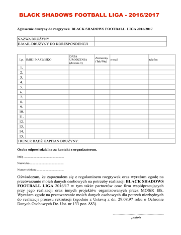 BLACK SHADOWS FOOTBALL LIGA - 2016/2017 Zgłoszenie drużyny do rozgrywek BLACK SHADOWS FOOTBALL LIGA 2016/2017 NAZWA DRUŻYNY E-MAIL DRUŻYNY DO KORESPONDENCJI Lp. IMIĘ I NAZWISKO DATA URODZENIA (dd.mm.rr) Zrzeszony e-mail (Tak/Nie) telefon 1. 2. 3. 4. 5. 6. 7. 8. 9. 10. 11. 12. 13. 14. 15. TRENER BĄDŹ KAPITAN DRUŻYNY: Osoba odpowiedzialna za kontakt z organizatorem. Imię ..................................................... Nazwisko............................................. Numer telefonu ................................... Oświadczam, że zapoznałem się z regulaminem rozgrywek oraz wyrażam zgodę na przetwarzanie moich danych osobowych na potrzeby realizacji BLACK SHADOWS FOOTBALL LIGA 2016/17 w tym także partnerów oraz firm współpracujących przy jego realizacji oraz innych projektów organizowanych przez MOSiR Ełk. Wyrażam zgodę na przetwarzanie moich danych osobowych dla potrzeb niezbędnych do realizacji procesu rekrutacji (zgodnie z Ustawą z dn. 29.08.97 roku o Ochronie Danych Osobowych Dz. Ust. nr 133 poz. 883). ........................................................ podpis