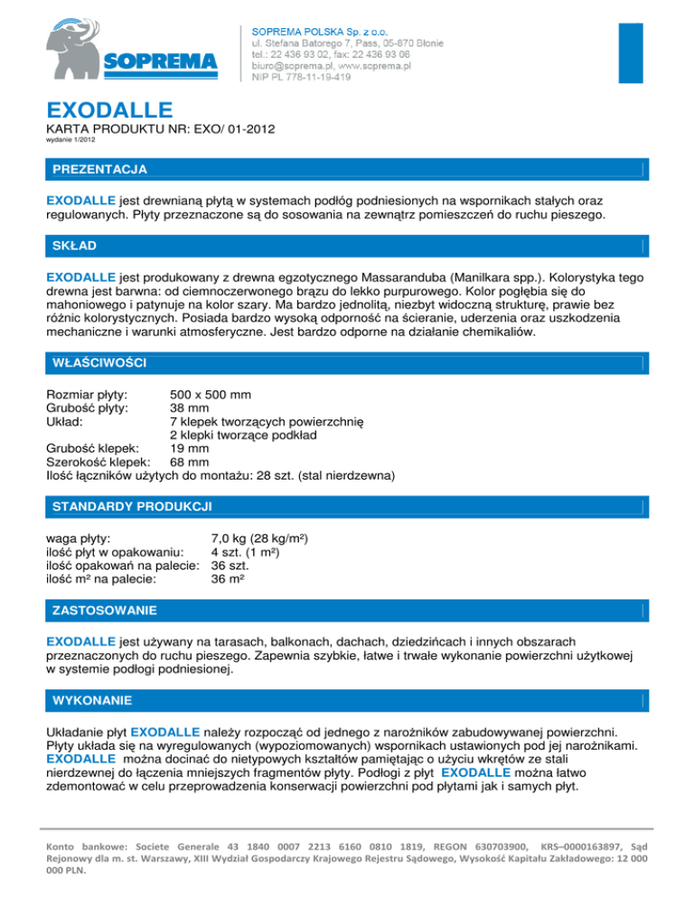 EXODALLE KARTA PRODUKTU NR: EXO/ 01-2012 wydanie 1/2012 PREZENTACJA EXODALLE jest drewnianą płytą w systemach podłóg podniesionych na wspornikach stałych oraz regulowanych. Płyty przeznaczone są do sosowania na zewnątrz pomieszczeń do ruchu pieszego. SKŁAD EXODALLE jest produkowany z drewna egzotycznego Massaranduba (Manilkara spp.). Kolorystyka tego drewna jest barwna: od ciemnoczerwonego brązu do lekko purpurowego. Kolor pogłębia się do mahoniowego i patynuje na kolor szary. Ma bardzo jednolitą, niezbyt widoczną strukturę, prawie bez różnic kolorystycznych. Posiada bardzo wysoką odporność na ścieranie, uderzenia oraz uszkodzenia mechaniczne i warunki atmosferyczne. Jest bardzo odporne na działanie chemikaliów. WŁAŚCIWOŚCI Rozmiar płyty: Grubość płyty: Układ: 500 x 500 mm 38 mm 7 klepek tworzących powierzchnię 2 klepki tworzące podkład Grubość klepek: 19 mm Szerokość klepek: 68 mm Ilość łączników użytych do montażu: 28 szt. (stal nierdzewna) STANDARDY PRODUKCJI waga płyty: ilość płyt w opakowaniu: ilość opakowań na palecie: ilość m² na palecie: 7,0 kg (28 kg/m²) 4 szt. (1 m²) 36 szt. 36 m² ZASTOSOWANIE EXODALLE jest używany na tarasach, balkonach, dachach, dziedzińcach i innych obszarach przeznaczonych do ruchu pieszego. Zapewnia szybkie, łatwe i trwałe wykonanie powierzchni użytkowej w systemie podłogi podniesionej. WYKONANIE Układanie płyt EXODALLE należy rozpocząć od jednego z narożników zabudowywanej powierzchni. Płyty układa się na wyregulowanych (wypoziomowanych) wspornikach ustawionych pod jej narożnikami. EXODALLE można docinać do nietypowych kształtów pamiętając o użyciu wkrętów ze stali nierdzewnej do łączenia mniejszych fragmentów płyty. Podłogi z płyt EXODALLE można łatwo zdemontować w celu przeprowadzenia konserwacji powierzchni pod płytami jak i samych płyt. Konto bankowe: Societe Generale 43 1840 0007 2213 6160 0810 1819, REGON 630703900, KRS–0000163897, Sąd Rejonowy dla m. st. Warszawy, XIII Wydział Gospodarczy Krajowego Rejestru Sądowego, Wysokość Kapitału Zakładowego: 12 000 000 PLN. FORMA DOSTAWY I MAGAZYNOWANIE Płyty EXODALLE są dostarczane w kartonowych opakowaniach zbiorczych na palecie. Należy je przewozić krytymi środkami transportu, zabezpieczone przed przewracaniem się i uszkodzeniem oraz przemieszczeniem podczas jazdy. Palety, opakowania zbiorcze i pojedyńcze płyty należy składować na równym podłożu. W trakcie składowania chronić przed zawilgoceniem. CERTYFIKATY Zakład produkcyjny posiada certyfikat na system zarządzania jakością: BS EN ISO 9001:2008 BS EN ISO 14001:2004 UWAGI Produkt nie zawiera substancji, które mogą być szkodliwe dla zdrowia i środowiska naturalnego i jest zgodny z ogólnie przyjętymi wymogami bezpieczeństwa i ochrony zdrowia. Konto bankowe: Societe Generale 43 1840 0007 2213 6160 0810 1819, REGON 630703900, KRS–0000163897, Sąd Rejonowy dla m. st. Warszawy, XIII Wydział Gospodarczy Krajowego Rejestru Sądowego, Wysokość Kapitału Zakładowego: 12 000 000 PLN.