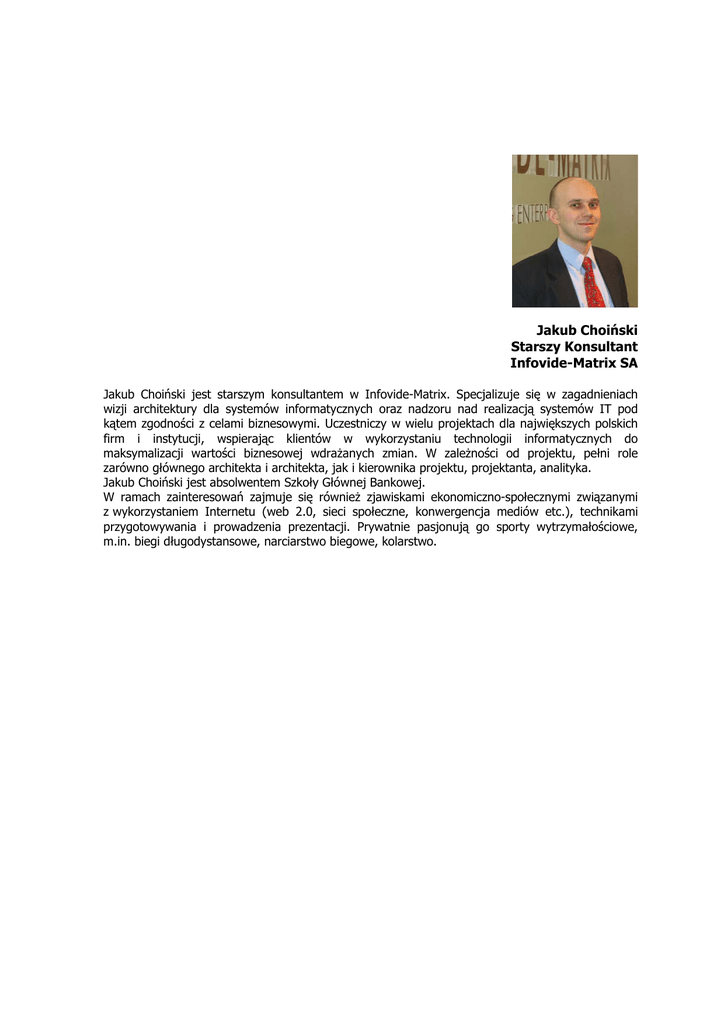 Jakub Choiński Starszy Konsultant Infovide-Matrix SA Jakub Choiński jest starszym konsultantem w Infovide-Matrix. Specjalizuje się w zagadnieniach wizji architektury dla systemów informatycznych oraz nadzoru nad realizacją systemów IT pod kątem zgodności z celami biznesowymi. Uczestniczy w wielu projektach dla największych polskich firm i instytucji, wspierając klientów w wykorzystaniu technologii informatycznych do maksymalizacji wartości biznesowej wdrażanych zmian. W zależności od projektu, pełni role zarówno głównego architekta i architekta, jak i kierownika projektu, projektanta, analityka. Jakub Choiński jest absolwentem Szkoły Głównej Bankowej. W ramach zainteresowań zajmuje się również zjawiskami ekonomiczno-społecznymi związanymi z wykorzystaniem Internetu (web 2.0, sieci społeczne, konwergencja mediów etc.), technikami przygotowywania i prowadzenia prezentacji. Prywatnie pasjonują go sporty wytrzymałościowe, m.in. biegi długodystansowe, narciarstwo biegowe, kolarstwo.