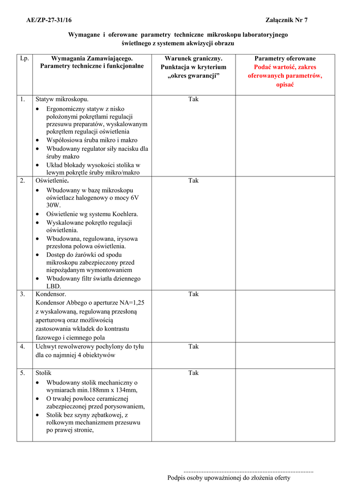 AE/ZP-27-31/16 Załącznik Nr 7 Wymagane i oferowane parametry techniczne mikroskopu laboratoryjnego świetlnego z systemem akwizycji obrazu Lp. 1. 2. 3. 4. 5. Wymagania Zamawiającego. Parametry techniczne i funkcjonalne Warunek graniczny. Punktacja w kryterium „okres gwarancji” Statyw mikroskopu. • Ergonomiczny statyw z nisko położonymi pokrętłami regulacji przesuwu preparatów, wyskalowanym pokrętłem regulacji oświetlenia • Współosiowa śruba mikro i makro • Wbudowany regulator siły nacisku dla śruby makro • Układ blokady wysokości stolika w lewym pokrętle śruby mikro/makro Oświetlenie. • Wbudowany w bazę mikroskopu oświetlacz halogenowy o mocy 6V 30W. • Oświetlenie wg systemu Koehlera. • Wyskalowane pokrętło regulacji oświetlenia. • Wbudowana, regulowana, irysowa przesłona polowa oświetlenia. • Dostęp do żarówki od spodu mikroskopu zabezpieczony przed niepożądanym wymontowaniem • Wbudowany filtr światła dziennego LBD. Kondensor. Kondensor Abbego o aperturze NA=1,25 z wyskalowaną, regulowaną przesłoną aperturową oraz możliwością zastosowania wkładek do kontrastu fazowego i ciemnego pola Uchwyt rewolwerowy pochylony do tyłu dla co najmniej 4 obiektywów Tak Stolik • Wbudowany stolik mechaniczny o wymiarach min.188mm x 134mm, • O trwałej powłoce ceramicznej zabezpieczonej przed porysowaniem, • Stolik bez szyny zębatkowej, z rolkowym mechanizmem przesuwu po prawej stronie, Tak Parametry oferowane Podać wartość, zakres oferowanych parametrów, opisać Tak Tak Tak ............................................................................... Podpis osoby upoważnionej do złożenia oferty Z uchwytem na jeden lub dwa preparaty jednocześnie po lewej stronie, • Przesuw w osiach X i Y umożliwiający obserwacje całej powierzchni jednego lub dwóch szkiełek preparatowych, zakres przesuwu min.76mm na 50mm • 6. Nasadka okularowa. • Nasadka trójokularowa o stałym kącie nachylenia 30 stopni, • Pole widzenia FN=20, • Z regulacją rozstawu okularów w zakresie 48-75 mm i wbudowanym pierścieniem korekcji dioptryjnej w zakresie +/- 5 dioptrii Tak 7. Okulary. • Okulary szerokopolowe o FN=20 • Powiększenie 10x, ze zwijanymi/rozwijanymi osłonkami gumowymi Tak 8. Obiektywy plan achromatyczne o długości optycznej 45mm, o powiększeniach / aperturze (NA) / odległości roboczej (WD): • Planachromat obiektyw 4x. Odległość robocza 18.5 mm, apertura numeryczna NA=0.10; obserwacja zarówno poprzez jak i bez szkiełka nakrywkowego. • Planachromat obiektyw 10x. Odległość robocza 10.6 mm, apertura numeryczna NA=0.25. Korekcja na dowolnej grubości szkiełko nakrywkowe. Plan Achromat • Planachromat obiektyw 20x. Odległość robocza 1.2 mm, apertura numeryczna NA=0.40, korekcja na szkiełko nakrywkowe 0.17 mm. • Planachromat obiektyw 40x. Odległość robocza 0.6 mm, apertura numeryczna NA=0.65, korekcja na szkiełko nakrywkowe 0.17 mm. • Planachromat obiektyw 60x. Odległość robocza 0,20 mm, apertura numeryczna NA=0,80, korekcja na szkiełko nakrywkowe 0.17 mm. Tak ............................................................................... Podpis osoby upoważnionej do złożenia oferty 9. Możliwość rozbudowy: • Wyposażenie do obserwacji w ciemnym polu, • Przystawkę konsultacyjną dla drugiego obserwatora, • Moduł z wbudowaną podświetlaną strzałką wskaźnikową, ruchomą w całym polu widzenia okularów/kamery, z wbudowanymi: regulatorem położenia strzałki, ze zmieniaczem kolorów strzałki (zielony, czerwony), z wbudowanym zasilaczem sieciowym. Tak 10. Adaptacja do kamery, 1x Tak 11. Kamera: • Rozdzielczość: min. 2560 x 1920 pixeli • Element światłoczuły: CMOS, 1/2.5 cala • Binning: min. 2x, 4x • Powierzchnia efektywna (szerokość x wysokość): min. 5.6 mm x 4.2 mm • Wielkość piksela: min. 2.2 x 2.2 µm. • Czas ekspozycji: min. 31µs do 2,74 s • Zakres dynamiczny min. 12 bit • Pomiar światła przy automatycznej ekspozycji: pełne zdjęcie, 30% lub 1% • Czas odświeżania nie gorszy niż: - maksymalnie 77fps - 32 fps przy rozdzielczości full HD - 15 fps przy najwyższej rozdzielczości • Mocowanie: standard C-mount • Połączenie z komputerem: USB 3.0 • Programowa kontrola wszystkich funkcji kamery • Automatyczny balans bieli • Praca w systemie operacyjnym Windows 7, 8 i 8.1 (32 i 64 bit) Oprogramowanie do obsługi kamery, pozwalające na: • Podgląd obrazów na żywo na ekranie monitora, • Wykonywanie zdjęć, • Nagrywanie sekwencji video (format AVI), • Możliwość wykonania podstawowych pomiarów (np. odległość, obwód, średnica, pole powierzchni) Tak 13. Tak ............................................................................... Podpis osoby upoważnionej do złożenia oferty Wyświetlanie parametrów mikrofotografii, • Nawigacja po mikrofotografii, • Możliwość edycji warstwy z pomiarami, opisami lub warstw obrazów, • Manualny oraz automatyczny tryb doboru parametrów akwizycji obrazu, • Możliwość składania wielu obrazów mikroskopowych typu RGB w jeden obraz wielowymiarowy, • Dodawanie notatek (tekst, strzałki, itp.) • Tryb galerii (wyświetla miniatury fotografii), • Możliwość podglądu wielu zdjęć jednocześnie, • Możliwość ustawienia wyglądu: wielkość i położenie okien, ilość i rozmieszczenie ikon, • Zapis zdjęć wielu formatach m.in. TIFF, JPG, BMP, PNG, VSI, • Możliwość upgradu do wyższej wersji bez konieczności ponownego zakupu licencji Zestaw komputerowy z monitorem w pełni kompatybilny z oprogramowaniem do obsługi kamery: • Obudowa: desktop lub Tower • Procesor: procesor minimum czterordzeniowy o wydajności co najmniej 5860 punktów - kolumna Passmark CPU Mark w teście CPU Benchmark dla pojedynczych procesorów dostępnej na stronie http://www.cpubenchmark.net ( stan na dzień 02.03.2016r) • Pamięć RAM: minimum 4GB • Dysk twardy: minimum 