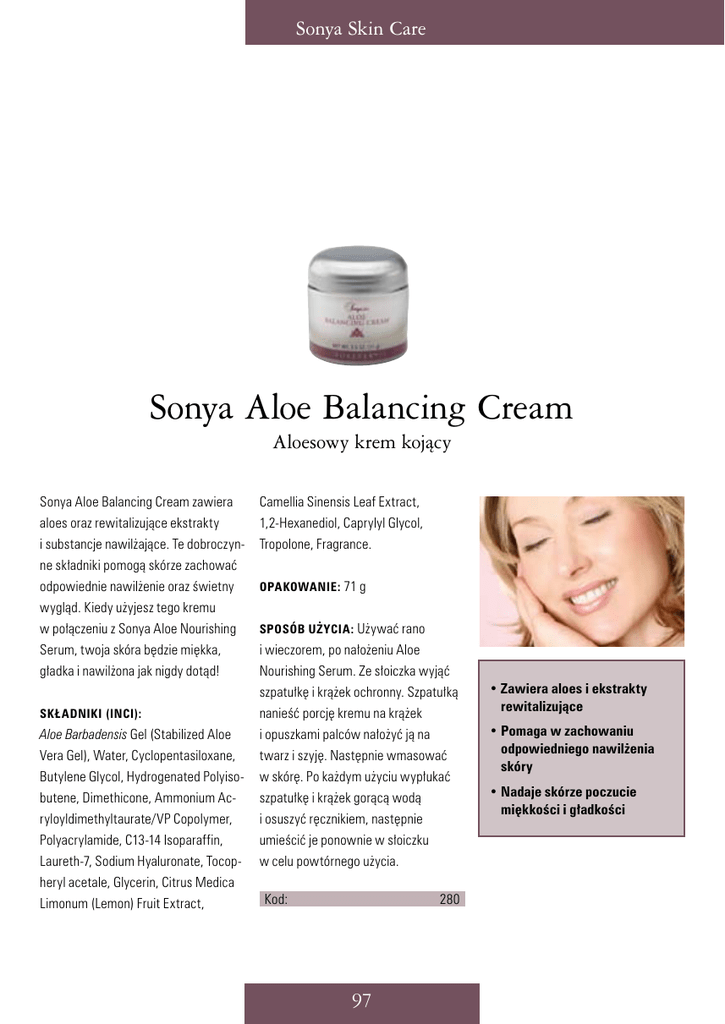 Sonya Skin Care Sonya Aloe Balancing Cream Aloesowy krem kojàcy Sonya Aloe Balancing Cream zawiera aloes oraz rewitalizujàce ekstrakty i substancje nawil˝ajàce. Te dobroczynne sk∏adniki pomogà skórze zachowaç odpowiednie nawil˝enie oraz Êwietny wyglàd. Kiedy u˝yjesz tego kremu w po∏àczeniu z Sonya Aloe Nourishing Serum, twoja skóra b´dzie mi´kka, g∏adka i nawil˝ona jak nigdy dotàd! SKŁADNIKI (INCI): Aloe Barbadensis Gel (Stabilized Aloe Vera Gel), Water, Cyclopentasiloxane, Butylene Glycol, Hydrogenated Polyisobutene, Dimethicone, Ammonium Acryloyldimethyltaurate/VP Copolymer, Polyacrylamide, C13-14 Isoparaffin, Laureth-7, Sodium Hyaluronate, Tocopheryl acetale, Glycerin, Citrus Medica Limonum (Lemon) Fruit Extract, Camellia Sinensis Leaf Extract, 1,2-Hexanediol, Caprylyl Glycol, Tropolone, Fragrance. OPAKOWANIE: 71 g SPOSÓB U˚YCIA: U˝ywaç rano i wieczorem, po na∏o˝eniu Aloe Nourishing Serum. Ze s∏oiczka wyjàç szpatu∏k´ i krà˝ek ochronny. Szpatu∏kà nanieÊç porcj´ kremu na krà˝ek i opuszkami palców na∏o˝yç jà na twarz i szyj´. Nast´pnie wmasowaç w skór´. Po ka˝dym u˝yciu wyp∏ukaç szpatu∏k´ i krà˝ek goràcà wodà i osuszyç r´cznikiem, nast´pnie umieÊciç je ponownie w s∏oiczku w celu powtórnego u˝ycia. Kod: 280 97 • Z awiera aloes i ekstrakty rewitalizujàce • Pomaga w zachowaniu odpowiedniego nawil˝enia skóry • Nadaje skórze poczucie mi´kkoÊci i g∏adkoÊci