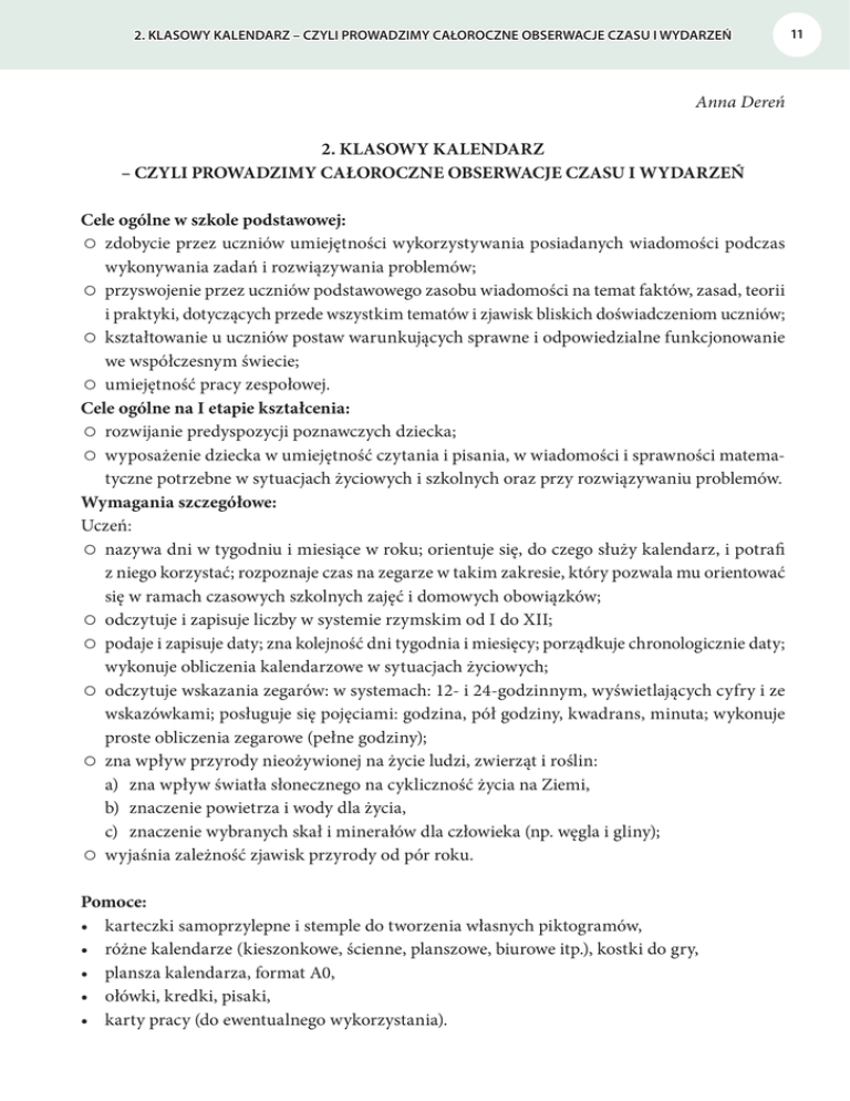 2. KLASOWY KALENDARZ – CZYLI PROWADZIMY CAŁOROCZNE OBSERWACJE CZASU I WYDARZEŃ Anna Dereń 2. KLASOWY KALENDARZ – CZYLI PROWADZIMY CAŁOROCZNE OBSERWACJE CZASU I WYDARZEŃ Cele ogólne w szkole podstawowej: ſ zdobycie przez uczniów umiejętności wykorzystywania posiadanych wiadomości podczas wykonywania zadań i rozwiązywania problemów; ſ przyswojenie przez uczniów podstawowego zasobu wiadomości na temat faktów, zasad, teorii i praktyki, dotyczących przede wszystkim tematów i zjawisk bliskich doświadczeniom uczniów; ſ kształtowanie u uczniów postaw warunkujących sprawne i odpowiedzialne funkcjonowanie we współczesnym świecie; ſ umiejętność pracy zespołowej. Cele ogólne na I etapie kształcenia: ſ rozwijanie predyspozycji poznawczych dziecka; ſ wyposażenie dziecka w umiejętność czytania i pisania, w wiadomości i sprawności matematyczne potrzebne w sytuacjach życiowych i szkolnych oraz przy rozwiązywaniu problemów. Wymagania szczegółowe: Uczeń: ſ nazywa dni w tygodniu i miesiące w roku; orientuje się, do czego służy kalendarz, i potrafi z niego korzystać; rozpoznaje czas na zegarze w takim zakresie, który pozwala mu orientować się w ramach czasowych szkolnych zajęć i domowych obowiązków; ſ odczytuje i zapisuje liczby w systemie rzymskim od I do XII; ſ podaje i zapisuje daty; zna kolejność dni tygodnia i miesięcy; porządkuje chronologicznie daty; wykonuje obliczenia kalendarzowe w sytuacjach życiowych; ſ odczytuje wskazania zegarów: w systemach: 12- i 24-godzinnym, wyświetlających cyfry i ze wskazówkami; posługuje się pojęciami: godzina, pół godziny, kwadrans, minuta; wykonuje proste obliczenia zegarowe (pełne godziny); ſ zna wpływ przyrody nieożywionej na życie ludzi, zwierząt i roślin: a) zna wpływ światła słonecznego na cykliczność życia na Ziemi, b) znaczenie powietrza i wody dla życia, c) znaczenie wybranych skał i minerałów dla człowieka (np. węgla i gliny); ſ wyjaśnia zależność zjawisk przyrody od pór roku. Pomoce: t karteczki samoprzylepne i stemple do tworzenia własnych piktogramów, t różne kalendarze (kieszonkowe, ścienne, planszowe, biurowe itp.), kostki do gry, t plansza kalendarza, format A0, t ołówki, kredki, pisaki, t karty pracy (do ewentualnego wykorzystania). 11 12 2. KLASOWY KALENDARZ – CZYLI PROWADZIMY CAŁOROCZNE OBSERWACJE CZASU I WYDARZEŃ Przebieg sytuacji dydaktycznej: Zalecany czas realizacji – wrzesień lub grudzień (opracujemy kalendarz na rok szkolny lub rok astronomiczny). 1. W związku z nowym rokiem szkolnym lub zbliżającym się astronomicznym, proponujemy dzieciom zajrzenie do kalendarzy i zorientowanie się, w czym mogą być pomocne, jakie informacje zawierają, w jaki sposób „obejmują” cały rok. 2. Rozdajemy dzieciom kalendarze (jeden na dwie osoby) i prosimy, żeby pracując w parach, jak najdokładniej przygotowały się do zaprezentowania swojego kalendarza pozostałym dzieciom. Pomoże to w wyborze formy klasowego kalendarza. 3. Po kilku minutach prosimy, żeby dzieci sformułowały pytania, na które warto szukać odpowiedzi (np. jakie informacje można znaleźć w kalendarzu, jakie znaki są używane, jakie są stałe elementy kalendarza, czym różnią się zapisy w poszczególnych miesiącach itp.). Pytania zapisujemy na tablicy, obok możemy zapisywać odpowiedzi dzieci. 4. Uczniowie prezentują swoje kalendarze, wskazują zalety oraz wady takiego opracowania. Wspólnie określają, jaki powinien być kalendarz, by spełniał rolę kalendarza klasowego. 5. Dyskutujemy o sposobie prowadzenia kalendarza klasowego. Dzieci wspólnie wybierają najlepsze ich zdaniem rozwiązanie, robią spis wydarzeń i informacji, które powinny się znaleźć w kalendarzu, pamiętając o: t klasowych uroczystościach (np. urodziny dzieci, imieniny) – co zrobić, żeby zebrać ważne informacje? t szkolnych uroczystościach – kto pomoże zrobić ich spis? t świętach, feriach, wakacjach, dodatkowych dniach wolnych – gdzie znajdziemy informacje? t porach roku – jak to sprawdzić? t godzinach wschodów i zachodów słońca – jak można będzie sprawdzać, czy nie ma pomyłki? t uroczystościach i świętach ważnych dla miejscowości, regionu, Polski, Europy, świata – gdzie można się o nich dowiedzieć? t dniach, które tradycyjnie są przypisane różnym zdarzeniom, osobom, obchodom (np. Dzień Matki, Ojca, Babci, Dziadka, Nauczyciela, Europy, Kubusia Puchatka, Dzień Psa, Kota, Chłopaka, Ziemi, Języków Obcych itp.) – gdzie warto szukać informacji? Komentarz: Ponieważ kalendarz pełni funkcję rocznej kroniki, w tej fazie planowania spisujemy tylko to, co dzieci wiedzą, znają, co jest obecne w ich doświadczeniu. W trakcie roku kalendarz będzie uzupełniany w miarę zbierania informacji, uczestniczenia w zdarzeniach, czynionych obserwacji (np. fazy Księżyca, godziny wschodu i zachodu Słońca, długość dnia). 2. KLASOWY KALENDARZ – CZYLI PROWADZIMY CAŁOROCZNE OBSERWACJE CZASU I WYDARZEŃ Dzieci tworzą swój kalendarz, wklejając piktogramy, które będą powstawały w miarę potrzeb w wyniku wspólnego ustalania pomysłu graficznego. 6. Po spisaniu wszystkich pomysłów, dyskutujemy o tym, co powinno się znaleźć w kalendarzu. Co możemy zrobić już teraz, a na co potrzeba więcej czasu, żeby prowadzić obserwacje, albo co wydarzy się dopiero w przyszłości. 7. Każda karta kalendarza zaczyna się od 1. dnia miesiąca – dzieci muszą zdecydować, w jaki sposób ustalą, jakim dniem tygodnia zaczynają się poszczególne miesiące, jak oznaczą niedziele, soboty, święta. Poszukają odpowiedzi na pytania: ✓ Ile dni mają poszczególne miesiące? ✓ Ile dni ma luty, czy w każdym roku tyle samo? ✓ Ile dni ma rok? ✓ Ile tygodni ma rok? Ile ich przypada na poszczególne pory roku? ✓ Na ile grup należy się podzielić, żeby popracować nad całym kalendarzem? W jaki sposób możemy się podzielić 