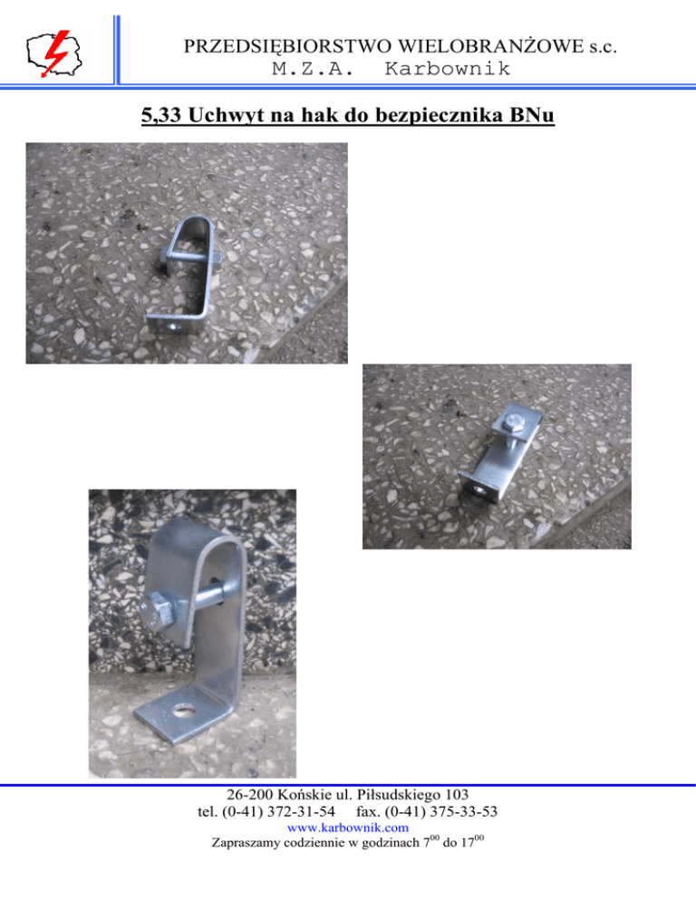 PRZEDSIĘBIORSTWO WIELOBRANŻOWE s.c. M.Z.A. Karbownik 5,33 Uchwyt na hak do bezpiecznika BNu 26-200 Końskie ul. Piłsudskiego 103 tel. (0-41) 372-31-54 fax. (0-41) 375-33-53 www.karbownik.com Zapraszamy codziennie w godzinach 700 do 1700