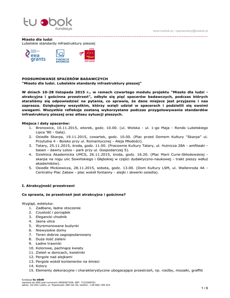 www.tuobok.pl / [email protected] Miasto dla ludzi Lubelskie standardy infrastruktury pieszej PODSUMOWANIE SPACERÓW BADAWCZYCH "Miasto dla ludzi. Lubelskie standardy infrastruktury pieszej" W dniach 10-28 listopada 2015 r., w ramach czwartego modułu projektu "Miasto dla ludzi atrakcyjna i gościnna przestrzeń", odbyło się pięć spacerów badawczych, podczas których staraliśmy się odpowiedzieć na pytania, co sprawia, że dane miejsce jest przyjazne i nas zaprasza. Dziękujemy wszystkim, którzy wzięli udział w spacerach i podzielili się swoimi uwagami. Wszystkie refleksje zostaną wykorzystane podczas przygotowywania standardów infrastruktury pieszej oraz atlasu sytuacji pieszych. Miejsca i daty spacerów: 1. Bronowice, 10.11.2015, wtorek, godz. 10.00. (ul. Wolska - ul. 1-go Maja - Rondo Lubelskiego Lipca '80 - Gala). 2. Osiedle Skarpa, 19.11.2015, czwartek, godz. 10.00. (Plac przed Domem Kultury "Skarpa" ul. Przytulna 4 - Boisko przy ul. Romantycznej - Aleja Młodości). 3. Tatary, 25.11.2015, środa, godz. 11.00. (Pracownie Kultury Tatary, ul. Hutnicza 28A - amfiteatr basen - dawny Lotos - park przy ul. Gospodarczej 5). 4. Dzielnica Akademicka UMCS, 26.11.2015, środa, godz. 16.20. (Plac Marii Curie-Skłodowskiej skarpa na rogu ulic Sowińskiego i Głębokiej w części dydaktyczno-naukowej - trakt pieszy wdłuż akademików). 5. Osiedle Mickiewicza, 28.11.2015, sobota, godz. 13.00. (Dom Kultury LSM, ul. Wallenroda 4A Centralny Plac Zabaw - plac wokół fontanny - alejki i skwerki osiedla). I. Atrakcyjność przestrzeni Co sprawia, że przestrzeń jest atrakcyjna i gościnna? Wygląd, estetyka: 1. Zadbane, ładne otoczenie 2. Czystość i porządek 3. Elegancki chodnik 4. Jasna ulica 5. Wyremonowane budynki 6. Niewysokie domy 7. Teren dobrze zagospodarowany 8. Duża ilość zieleni 9. Ładne trawniki 10. Kolorowe, pachnące kwiaty 11. Zieleń w donicach, kwietniki 12. Pergole nad alejkami 13. Pergole wokół kontenerów na śmieci 14. Kolory 15. Elementy dekoracyjne i charakterystyczne ubogacające przestrzeń, np. rzeźby, mozaiki, graffiti fundacja tu obok wpisana do KRS pod numerem 0000407328, NIP: 7123268761 adres: 20-052 Lublin, ul. Popiełuszki 28H lok.30, telefon: +48 660 199 423 1/6 16. Pomnik nadający miejscu dostojeństwa 17. Elementy łagodzące dostojeństwo ("ławeczkowy pomnik") 18. Brak szpecących reklam Struktura przestrzeni: 1. Dużo miejsca 2. Rozległy teren 3. Funkcjonalność 4. Miejsce stworzone specjalnie z myślą o imprezach 5. Kiedy już z daleka (lub z okien domów) widać, że coś ciekawego się tam dzieje 6. Miejsce stworzone na ludzką skalę, nieprzytłaczające 7. Położenie w centrum osiedla 8. Wnętrze urbanistyczne, z każdej strony zamknięte odpowiedniej wysokości, nieprzytłaczającą architekturą 9. Kiedy mamy wrażenie, że jest to pokój między budynkami 10. Kiedy wzięto pod uwagę, z której strony na to miejsce będzie padało słońce 11. Dobrze zaprojektowana przestrzeń 12. Obecność punktu charakterystycznego - pomnika 13. Dobre usytuowanie pomnika - jako punktu orientacyjnego, który nie utrudnia komunikacji 14. Dobra widoczność 15. Kiedy możemy wybrać skrót 16. Położenie na górze 17. Obecność skwerków Wygoda: 1. Wygodne i bezpieczne schody 2. Wygodne, szerokie, równe alejki i chodniki 3. Dobra, nowa nawierzchnia chodnika 4. Równe alejki do jazdy na rowerkach 5. Szeroka ścieżka 6. Zróżnicowana nawierzchnia: odwrócona kostka jest lepsza dla wózków, a kostka z rowkami zapewnia lepszą przyczepność, gdy jest ślisko 7. "Autostrada dla pieszych" 8. Brak skrzyżowań alejek ze ścieżkami rowerowymi 9. Brak krawężników 10. Ławeczki ustawione nie na chodniku, lecz powycofywane 11. Kosze poustawiane nie na chodniku, lecz cofnięte na trawnik 12. Udogodnienia dla osób niepełnosprawnych 13. Podjazdy dla wózków 14. Wyznaczony parking - samochody nie parkują na chodniku 15. Ograniczony dostęp samochodów 16. Brak samochodów, całkowite przeznaczenie do ruchu pieszego. 17. Bliskość komunikacji: przystanki autobusowe, PKP 18. Odseparowanie od ruchu ulicznego 19. Udogodnienia dostosowane do potrzeb danego miejsca, np. kładki dla pieszych Infrastruktura: 1. Ławki 2. Ławeczka integracyjna 3. Miejsca do siedzenia 4. Miejsce do przesiadywania 5. Plac zabaw 6. Ciekawy, niebanalny plac zabaw z dużą ilością sprzętów 7. Asfaltowa nawierzchnia dobra do rysowania 8. Siłownia na świeżym powietrzu 9. Miejsce do spędzania czasu dla dzieci i dorosłych: plac zabaw + siłownia 10. Dostępne dla wszystkich boisko 11. Scena 12. Odpowiednie oświetlenie 2/6 13. 14. 15. 16. 17. Drobne ułatwienia: na murku położone deski do siedzenia Trawnik, na którym można siadać Lodowisko w zimie Schodki prowadzące z dolnych balkonów bezpośrednio do ogródków Obecność skupionych w jednym miejscu małych sklepików, punktów usługowych, targu, kawiarenek 18. Obecność przedszkoli i szkół 19. Obecność Domu Kultury integrującego lokalną społeczność Odczucia: 1. Poczucie, że jest nam miło w tej przestrzeni 2. Spokój 3. Cisza 4. Chłód podczas upałów 5. Odgłosy miasta nieprzeszkadzające w rozmowie 6. Urok miejsca 7. "Światowy blichtr" 8. Poczucie bezpieczeństwa 9. Przyjazna i pozytywna wymowa pomnika 10. Miejsca kultowe dzięki specyficznej infrastrukturze Wpływ użytkowników na otoczenie: 1. Przeprowadzenie konsultacji społecznych i uwzględnienie pomysłów mieszkańców podczas realizacji projektów 2. Kiedy mieszkańcy sami mogą zadbać o przestrzeń, np. pielęgnować zieleń 3. Kiedy mieszkańcy mogą organizować kameralne imprezy, np. grille 4. Kiedy coś się dzieje, np. festyny, imprezy, koncerty, spotkania itp. 5. Kiedy miejsce żyje również zimą (imprezy) 6. Kiedy można w niej spotkać znajomych 7. Kiedy widzimy, że przychodzi tu dużo osób 8. Miejsca do siedzenia w takich odległościach, że nie przeszkadza się sobie nawzajem Co sprawia, że przestrzeń nie jest at