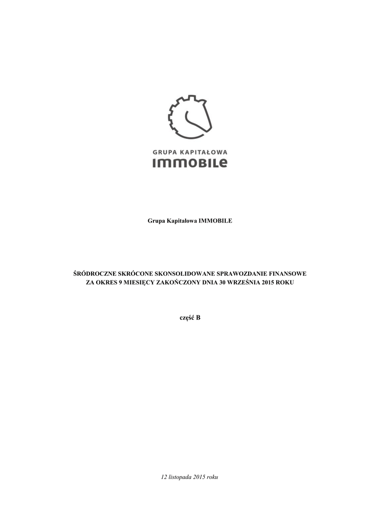 Grupa Kapitałowa IMMOBILE ŚRÓDROCZNE SKRÓCONE SKONSOLIDOWANE SPRAWOZDANIE FINANSOWE ZA OKRES 9 MIESIĘCY ZAKOŃCZONY DNIA 30 WRZEŚNIA 2015 ROKU część B 12 listopada 2015 roku 1 Grupa Kapitałowa IMMOBILE Śródroczne skrócone skonsolidowane sprawozdanie finansowe - cz. B za okres 6 miesięcy zakończony dnia 30 września 2015 roku (w tysiącach PLN) Spis treści część B Pozostałe noty objaśniające 6. Istotne zasady (polityka) rachunkowości………………………………………………………………………………………… 3 7. Zmiana szacunków i korekty błędów……………………………………………………………………………………………… 4 8. Istotne wartości oparte na profesjonalnym osądzie i szacunkach………………………………………………………………… 4 8.1. Profesjonalny osąd……………………………………………………………………………………………………………… 4 8.2. Niepewność szacunków i założeń……………………………………………………………………………………………… 4 9. Sezonowość działalności………………………………………………………………………………………………………… 5 10. Dywidendy wypłacone i zaproponowane do wypłaty…………………………………………………………………………… 6 11. Podatek dochodowy……………………………………………………………………………………………………………… 6 12. Rzeczowe aktywa trwałe………………………………………………………………………………………………………… 7 13. Nieruchomości inwestycyjne……………………………………………………………………………………………………… 7 14. Aktywa niematerialne…………………………………………………………………………………………………………… 9 15. Zapasy…………………………………………………………………………………………………………………………… 9 15.1. Struktura zapasów……………………………………………………………………………………………………………… 9 15.1. Aktywa biologiczne…………………………………………………………………………………………………………… 9 16. Świadczenia pracownicze………………………………………………………………………………………………………… 10 17. Rezerwy…………………………………………………………………………………………………………………………… 10 18. Oprocentowane kredyty bankowe i pożyczki…………………………………………………………………………………… 11 19. Inne istotne zmiany……………………………………………………………………………………………………………… 16 19.1. Kapitałowe oraz dłużne papiery wartościowe………………………………………………………………………………… 16 19.2. Sprawy sądowe………………………………………………………………………………………………………………… 16 19.3. Zobowiązania warunkowe……………………………………………………………………………………………………… 17 19.4. Zobowiązania inwestycyjne…………………………………………………………………………………………………… 18 19.5. Kapitał własny………………………………………………………………………………………………………………… 18 19.6. Zarządzanie kapitałem………………………………………………………………………………………………………… 18 19.7. Środki pieniężne i ich ekwiwalenty…………………………………………………………………………………………… 19 19.8. Wyjaśnienia do pozycji rachunek przepływów pieniężnych…………………………………………………………………… 19 19.9. Leasing finansowy……………………………………………………………………………………………………………… 19 19.10. Udzielone pożyczki…………………………………………………………………………………………………………… 20 19.11. Należności i pożyczki…………………………………………………………………………………………………………… 20 19.12. Należności z tytułu dostaw i usług oraz pozostałe należności………………………………………………………………… 20 19.13. Zobowiązania z tytułu dostaw i usług oraz pozostałe zobowiązania…………………………………………………………… 20 19.14. Koszty sprzedaży……………………………………………………………………………………………………………… 20 19.15. Koszty ogólnego zarządu……………………………………………………………………………………………………… 20 19.16. Zysk przypadający na akcję…………………………………………………………………………………………………… 21 20. Należności z tytułu umów o usługi budowlane…………………………………………………………………………………… 22 21. Połączenia jednostek i nabycia udziałów niekontrolujących……………………………………………………………………… 22 21.1. Nabycie jednostek……………………………………………………………………………………………………