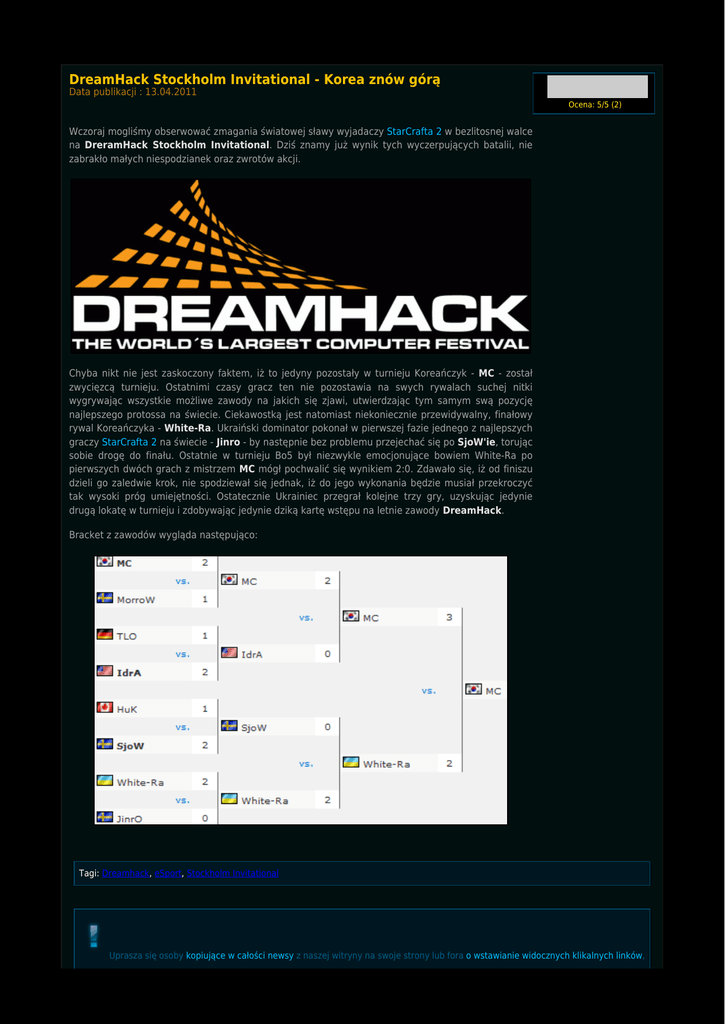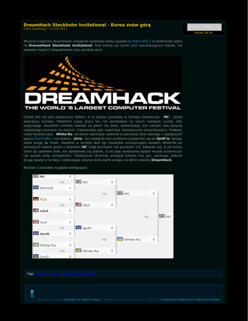 DreamHack Stockholm Invitational - Korea znów górą Data publikacji : 13.04.2011 Ocena: 5/5 (2) Wczoraj mogliśmy obserwować zmagania światowej sławy wyjadaczy StarCrafta 2 w bezlitosnej walce na DreramHack Stockholm Invitational. Dziś znamy już wynik tych wyczerpujących batalii, nie zabrakło małych niespodzianek oraz zwrotów akcji. Chyba nikt nie jest zaskoczony faktem, iż to jedyny pozostały w turnieju Koreańczyk - MC - został zwycięzcą turnieju. Ostatnimi czasy gracz ten nie pozostawia na swych rywalach suchej nitki wygrywając wszystkie możliwe zawody na jakich się zjawi, utwierdzając tym samym swą pozycję najlepszego protossa na świecie. Ciekawostką jest natomiast niekoniecznie przewidywalny, finałowy rywal Koreańczyka - White-Ra. Ukraiński dominator pokonał w pierwszej fazie jednego z najlepszych graczy StarCrafta 2 na świecie - Jinro - by następnie bez problemu przejechać się po SjoW'ie, torując sobie drogę do finału. Ostatnie w turnieju Bo5 był niezwykle emocjonujące bowiem White-Ra po pierwszych dwóch grach z mistrzem MC mógł pochwalić się wynikiem 2:0. Zdawało się, iż od finiszu dzieli go zaledwie krok, nie spodziewał się jednak, iż do jego wykonania będzie musiał przekroczyć tak wysoki próg umiejętności. Ostatecznie Ukrainiec przegrał kolejne trzy gry, uzyskując jedynie drugą lokatę w turnieju i zdobywając jedynie dziką kartę wstępu na letnie zawody DreamHack. Bracket z zawodów wygląda następująco: Tagi: Dreamhack, eSport, Stockholm Invitational Uprasza się osoby kopiujące w całości newsy z naszej witryny na swoje strony lub fora o wstawianie widocznych klikalnych linków, bezpośrednio do pobranego tekstu. W przypadku braku widocznego linku, skopiowanie tekstu uważa się za kradzież własności intelektualnej. Dziękujemy: Administratorzy serwisu. Autor: Robert "Xrasnolud" Rojek Data publikacji : 13.04.2011 Data modyfikacji : 13.04.2011 Liczba wyświetleń tekstu: 2292 Komentarz (14) dodaj komentarz te 3 przegrane pod rząd były niesamowicie dziwne. Nie będę się tutaj doszukiwał jakiś spisków, ale MC we wszystkich 3 grach grał prawie tak samo - ostry push od początku i przejechał się po przeciwniku. Bardzo dziwne.~nefbie 2011/04/13 19:30 MC po prostu zobaczył, że z tym graczem nie ma po co się bawić w macro gierki bo jest w tym zbyt dobry (a MC chociaż jest również doskonały w macro to jednak gra takie gry relatywnie rzadko) i po prostu zrobił to, co robi najlepiej - zamordował.~ Duppon 2011/04/13 19:52 @up ZGON~GonzO27 2011/04/13 20:00 Jak było powiedziane TLO i Huk odpadli w pierwszej rundzie.~Minis 2011/04/13 20:22 Wie ktoś czy repy będą (są) dostępne ?~rev678 2011/04/13 21:17 Taki jest styl MC, push, szybki win. Naprawdę jest mało takich gier, gdzie dochodzi do middlegame or lategame. On gra szybkie mecze i większości z nich, jak nie wszystkie wygrywa, co pokazał na dreamhacku. No cóż, tak graja najlepsi :P~Studnia 2011/04/13 21:56 presing stresing i zrobione ;]~kug 2011/04/13 22:27 http://www.youtube.com/watch?v=OF6RHFN_-ck Tutaj masz :)~Pejos 2011/04/13 22:29 To PvP w finale kojarzyło mi się z ZvZ z BroodWara. Każda jednostka miała znaczenie, zbudowałeś za dużo probek - przegrałeś. Trochę nie podoba mi się styl w jakim MC sięgnął po zwycięstwo (zwłaszcza ten chese w 5. grze), aczkolwiek w takim czuje się on najlepiej, więc nie dziwię mu się, że sięgnął po te środki. Mimo wszystko dla mnie (i chyba nie tylko) to White-Ra był prawdziwym zwycięzcą tego turnieju, jego gry były świetne, a po meczach niesamowicie miły i sympatyczny :)~pepkin88 2011/04/14 01:23 Mam tylko jedno pytanie co do meczu 5, skoro mapa jest podzielona na 4 lokalizacje, to skad MC wiedzial gdzie isc, a White-ra szukal po kolei, jak kazdy player. Nie zastanawia was to?~sQwert 2011/04/14 02:59 Ponoc to przerobiona wersja mapy gdzie startowe lokacje sa na krzyz. Whita ra o tym zapomnial, Mc widocznie nie.~Temporal 2011/04/14 09:25 Na mapie w 5 meczu mogą być tylko 2 lokalizacje. Także MC miał 50%, że trafi i mu się udało. Za to WhiteRa, jeszcze idąc na scout nie trafił na pierwszą lokalizacjie strasznie pechowo.~Minis 2011/04/14 09:39 Mapy do tego turnieju były tak przygotowane zeby spawn był zawsze na cross pozycjach. Jednakj chyba nie poinformowali o tym wszystkich zawodników...~Stork 2011/04/14 15:42 @sQwert napewno miał maphacka i do tego mineral hacka. jestem pewien . jak ktos mnie popiera to dajcie "lubię to"... ojcia nie ten portal~nimek 2011/04/15 14:53 dodaj komentarz 08.10.2015 Kampania "Szepty o zagładzie" dostępna za darmo (0 komentarzy) 27.09.2015 Kolejni bohaterowie w trybie Sprzymierzonych Dowódców (0 komentarzy) 22.09.2015 Cyfrowe gadżety za udział w BlizzCon 2015 (0 komentarzy) 15.07.2015 Legacy of the Void dostępne w przedsprzedaży! (0 komentarzy) 17.06.2015 Informacje z E3 - prolog kampanii Legacy of the Void (0 komentarzy) 30.05.2015 WCS Europe - sobota (30 maja) 18.00 grupa G - MaNa! (0 komentarzy) 07.05.2015 DreamHack Open France 2015 - już 8 maja - MaNa! (0 komentarzy) 03.05.2015 Na wesoło: postacie E-sportu 50 (0 komentarzy) 03.05.2015 IEM Katowice 2015 - jeszcze raz! (0 komentarzy) 03.05.2015 KeSPA Cup 2015 Season 1 - live! (0 komentarzy) 26.04.2015 Proleague - Top5 gier miesiąca (0 komentarzy) 26.04.2015 CJ Entus wygrywa 2 runde Proleague! (0 komentarzy) 18.04.2015 Wersja beta Legacy of the Void – aktualizacja 2.5.1 (0 komentarzy) 18.04.2015 WCS finals 2015 - galeria (0 komentarzy) 18.04.2015 Omówienie zmian w balansie Legacy of the Void (0 komentarzy) 11.04.2015 WCS Europe kwalifikacje z Polakami - dziś (sobota) 18.00 (0 komentarzy) 11.04.2015 Aktualizacja balansu Heart of the Swarm – 9 kwietnia (0 komentarzy) 11.04.2015 GSL Season1 2015 - galeria (0 komentarzy) 11.04.2015 Zbanowane konta w StarCraft II (0 komentarzy) 04.04.2015 Red Bull Battle Grounds powraca jesienią 2015 (0 komentarzy) (zobacz wszystkie)