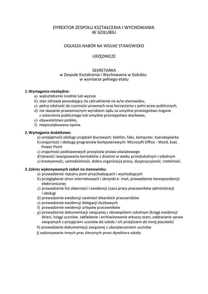 DYREKTOR ZESPOŁU KSZTAŁCENIA I WYCHOWANIA W GOŁUBIU OGŁASZA NABÓR NA WOLNE STANOWISKO URZĘDNICZE SEKRETARKA w Zespole Kształcenia i Wychowania w Gołubiu w wymiarze pełnego etatu 1. Wymagania niezbędne: a) wykształcenie średnie lub wyższe b) stan zdrowia pozwalający na zatrudnienie na w/w stanowisku, c) pełna zdolność do czynności prawnych oraz korzystania z pełni praw publicznych, d) nie skazanie prawomocnym wyrokiem sądu za umyślne przestępstwo ścigane z oskarżenia publicznego lub umyślne przestępstwo skarbowe, e) obywatelstwo polskie, f) nieposzlakowana opinia. 2. Wymagania dodatkowe: a) umiejętność obsługi urządzeń biurowych: telefon, faks, komputer, kserokopiarka b) znajomość i obsługa programów komputerowych: Microsoft Office - Word, Exel, Power Point c) znajomość podstawowych przepisów prawa oświatowego d) łatwość nawiązywania kontaktów z dziećmi w wieku przedszkolnym i szkolnym e) kreatywność, samodzielność, dobra organizacja pracy, dyspozycyjność, rzetelność. 3. Zakres wykonywanych zadań na stanowisku: a) prowadzenie rejestru pism przychodzących i wychodzących b) przeglądanie stron internetowych i skrzynki e- mail, prowadzenie korespondencji elektronicznej c) prowadzenie list obecności i ewidencji czasu pracy pracowników administracji i obsługi d) prowadzenie ewidencji zwolnień lekarskich pracowników e) prowadzenie ewidencji delegacji służbowych f) prowadzenie ewidencji urlopów pracowników g) prowadzenie dokumentacji związanej z obowiązkiem szkolnym (księgi ewidencji dzieci, księgi uczniów, zakładanie i archiwizowanie arkuszy ocen; załatwianie spraw związanych z przyjęciem uczniów do szkoły i ich przejściem do innej placówki) h) prowadzenie dokumentacji związanej z ubezpieczeniem uczniów j) wykonywanie innych prac zleconych przez dyrektora szkoły. 4. Wymagane dokumenty: 1) dokumenty niezbędne: kwestionariusz osobowy dla osoby ubiegającej się o zatrudnienie (w załączeniu), kopie dyplomów potwierdzających posiadane wykształcenie, kopie świadectw pracy lub inne dokumenty potwierdzające wymagany staż pracy, oświadczenie o nie skazaniu prawomocnym wyrokiem sądu za umyślne przestępstwo ścigane z oskarżenia publicznego lub umyślne przestępstwo skarbowe, e) oświadczenie o posiadaniu pełnej zdolności do czynności prawnych oraz korzystaniu z pełni praw publicznych, f) kopia dokumentu potwierdzającego obywatelstwo polskie; a) b) c) d) 2) dokumenty dodatkowe: a) CV b) list motywacyjny, c) inne dokumenty potwierdzające posiadane kwalifikacje i umiejętności Wymagane dokumenty aplikacyjne należy składać osobiście w zaklejonej kopercie w siedzibie jednostki w terminie do dnia 23 grudnia 2010r. (do godz. 14:00, liczy się data wpływu do ZKiW w Gołubiu) lub przesłać pocztą na adres: Zespół Kształcenia i Wychowania w Gołubiu, ul. Sambora II 17, 83-316 Gołubie z dopiskiem: „Nabór na stanowisko sekretarki". Aplikacje, które wpłyną po wyżej określonym terminie nie będą rozpatrywane. Informacja o wyniku naboru będzie umieszczona na stronie internetowej Biuletynu Informacji Publicznej /www.gminastezyca.pl/ oraz na tablicy ogłoszeń Zespołu Kształcenia i Wychowania w Gołubiu Wymagane dokumenty aplikacyjne: list motywacyjny, szczegółowe CV (z uwzględnieniem dokładnego przebiegu kariery zawodowej) powinny być opatrzone klauzulą: „Wyrażam zgodę na przetwarzanie moich danych osobowych zawartych w ofercie pracy dla potrzeb niezbędnych do realizacji procesu rekrutacji zgodnie z ustawą z dnia 29.08.1997 o ochronie danych osobowych (Dz. U. z 2002 r. Nr 101, poz. 926) oraz ustawą z dnia 21.11.2008 r. o pracownikach samorządowych (Dz. U. Nr 223, poz. 1458) ". Dyrektor Zespołu Kształcenia i Wychowania w Gołubiu mgr Mariusz Dułak Gołubie, dnia 14 grudnia 2010r.