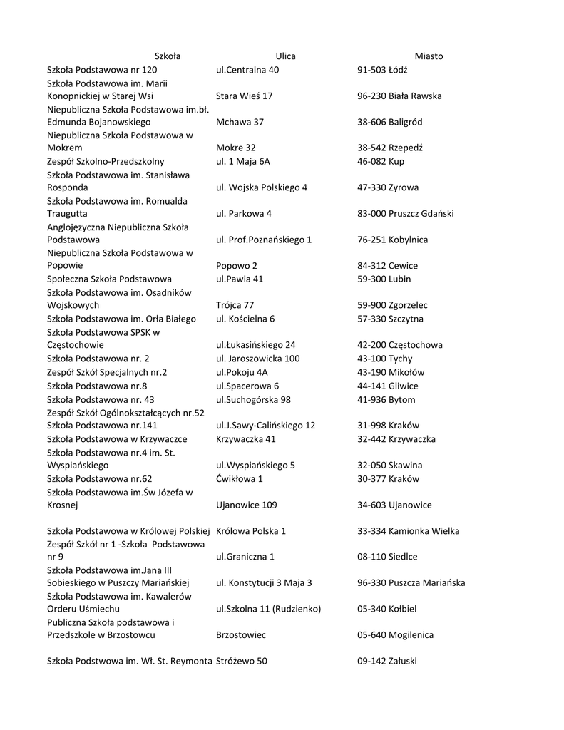 Szkoła Szkoła Podstawowa nr 120 Szkoła Podstawowa im. Marii Konopnickiej w Starej Wsi Niepubliczna Szkoła Podstawowa im.bł. Edmunda Bojanowskiego Niepubliczna Szkoła Podstawowa w Mokrem Zespół Szkolno-Przedszkolny Szkoła Podstawowa im. Stanisława Rosponda Szkoła Podstawowa im. Romualda Traugutta Anglojęzyczna Niepubliczna Szkoła Podstawowa Niepubliczna Szkoła Podstawowa w Popowie Społeczna Szkoła Podstawowa Szkoła Podstawowa im. Osadników Wojskowych Szkoła Podstawowa im. Orła Białego Szkoła Podstawowa SPSK w Częstochowie Szkoła Podstawowa nr. 2 Zespół Szkół Specjalnych nr.2 Szkoła Podstawowa nr.8 Szkoła Podstawowa nr. 43 Zespół Szkół Ogólnokształcących nr.52 Szkoła Podstawowa nr.141 Szkoła Podstawowa w Krzywaczce Szkoła Podstawowa nr.4 im. St. Wyspiańskiego Szkoła Podstawowa nr.62 Szkoła Podstawowa im.Św Józefa w Krosnej Ulica ul.Centralna 40 91-503 Łódź Stara Wieś 17 96-230 Biała Rawska Mchawa 37 38-606 Baligród Mokre 32 ul. 1 Maja 6A 38-542 Rzepedź 46-082 Kup ul. Wojska Polskiego 4 47-330 Żyrowa ul. Parkowa 4 83-000 Pruszcz Gdański ul. Prof.Poznańskiego 1 76-251 Kobylnica Popowo 2 ul.Pawia 41 84-312 Cewice 59-300 Lubin Trójca 77 ul. Kościelna 6 59-900 Zgorzelec 57-330 Szczytna ul.Łukasińskiego 24 ul. Jaroszowicka 100 ul.Pokoju 4A ul.Spacerowa 6 ul.Suchogórska 98 42-200 Częstochowa 43-100 Tychy 43-190 Mikołów 44-141 Gliwice 41-936 Bytom ul.J.Sawy-Calińskiego 12 Krzywaczka 41 31-998 Kraków 32-442 Krzywaczka ul.Wyspiańskiego 5 Ćwikłowa 1 32-050 Skawina 30-377 Kraków Ujanowice 109 34-603 Ujanowice Szkoła Podstawowa w Królowej Polskiej Zespół Szkół nr 1 -Szkoła Podstawowa nr 9 Szkoła Podstawowa im.Jana III Sobieskiego w Puszczy Mariańskiej Szkoła Podstawowa im. Kawalerów Orderu Uśmiechu Publiczna Szkoła podstawowa i Przedszkole w Brzostowcu Królowa Polska 1 33-334 Kamionka Wielka ul.Graniczna 1 08-110 Siedlce ul. Konstytucji 3 Maja 3 96-330 Puszcza Mariańska ul.Szkolna 11 (Rudzienko) 05-340 Kołbiel Brzostowiec 05-640 Mogilenica Szkoła Podstwowa im. Wł. St. Reymonta Stróżewo 50 Miasto 09-142 Załuski Zespół Szkół Specjalnych nr.1 Szkoła Podstawowa im. J.Tuwima w Wielączy Kolonii Szkoła Podstawowa im. Jana Pawła II w Zamchu Szkoła Podstawowa im. K.Makuszyńskiego w Gierlachowie ul. Piastowska 9 65-515 Zielona Góra Wielącza Kolonia 110 22-460 Szczebrzeszyn Zamch 117 23-413 Olsza Gierlachów 96 27-600 Sandomierz Szkoła Podstawowa w Woli Kopcowej Szkoła Podstawowa im. M.Reja w Nagłowicach Szkoła Podstawowa w Ustroniu Szkoła Podstawowa w Białce Niepubliczna Szkoła Podstawowa w Daniłowie Dużym Szkoła Podstawowa ABiS - Szkoła dla dziecka Dwujęzyczna Szkoła Podstawowa "Tęczowy Ogród" Publiczna Szkoła podstawowa Szkoła Podstawowa im. Obrońców Ziem Polskich Niepubliczna Szkoła Podstawowa "Akademia Żaka" Niepubliczna Szkoła Podstawowa Niepubliczna Szkoła Podstawowa im. S. Lema Szkoła Podstawowa EKOLA Szkoła Podstawowa im. Jana Pawła II Ww Łuczycach Szkoła Podstawowa w Radwanicach Szkoła Podstawowa nr 16 Szkoła Podstawowa im. T. Kościuszki Szkoła Podstawowa im.Jana Pawła II Zespół Szkół Specjalnych Publiczna Szkoła Podstawowa Zespół Szkół Specjalnych nr 1 Kato;ocka Szkoła im. św. Rodzieny z Nazaretu Szkoła Podstawowa im. Franciszka Kujawińskiego w Górkach Dużych Szkoła Podstawowa im. T. Kościuszki Szkoła Podstawowa w Kopyłowie ul.Świętokrzyska 86 26-001 Masłów ul.M.Reja 40 Ustronie 7 Białka 175 28-362 Nagłowice 87-732 Lubanie 36-030 Błażowa Daniłowo Duże 61 18-112 Poświętne ul.Rzgowska 17 a 03-008 Łódź ul.Miłobędzka 14 Romaszki 02-634 Warszawa 21-533 Romaszki Wocławy 13 83-020 Cedry Wielkie ul. Jaworzańska 2 Dańce 100 43-382 Bielsko-Biała 22-220 Hanna ul. Banasiówka 1 ul. Zielińskiego 56 32-091 Michałowice 53-534 Wrocław Łuczyca 116 32-010 Luborzyca ul. Dziewulskiego 2 Zarzyce Wielkie 56 ul. Szkolna 5 ul.Szpitalna 85 Walinn71 Piastowska 9 87-102 Toruń 34-142 Leńcze 83-321 Mściszewice Czeladź 21-311 Komarówka Podlaska 65-515 Zielona Góra ul.Pędzichów 13 31-152 Kraków ul.Jaroszewska 17 Plac Wiosny Ludów 20 95-080 Tuszyn 63-507 Kobyla Góra 22-523 Horodło Szkoła Podstawowa im. Jana Brzechwy ul.Szkolna 140 Zespół Szkó Specjalnych w Mysłowicach im Janusza Korczaka 55-010 Radwanice Mysłowiece Szkoła Specjalna nr 11 ul. Budowlanych 2 62-800 Kalisz 695 56 32 32 [email protected] [email protected] 513 06 70 11 [email protected] 500789062 [email protected] 785850870 [email protected] 510 177 795 [email protected] 662 334 278 [email protected] 694125516 [email protected] [email protected] 722098476 [email protected]